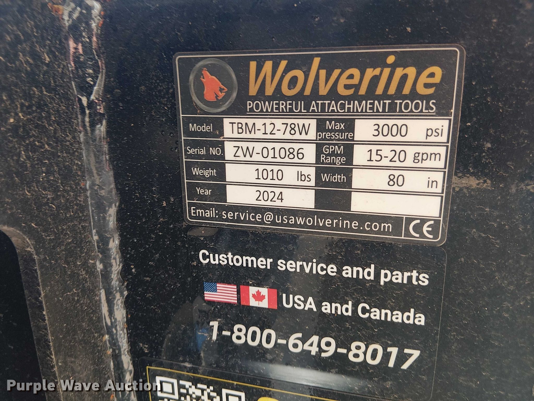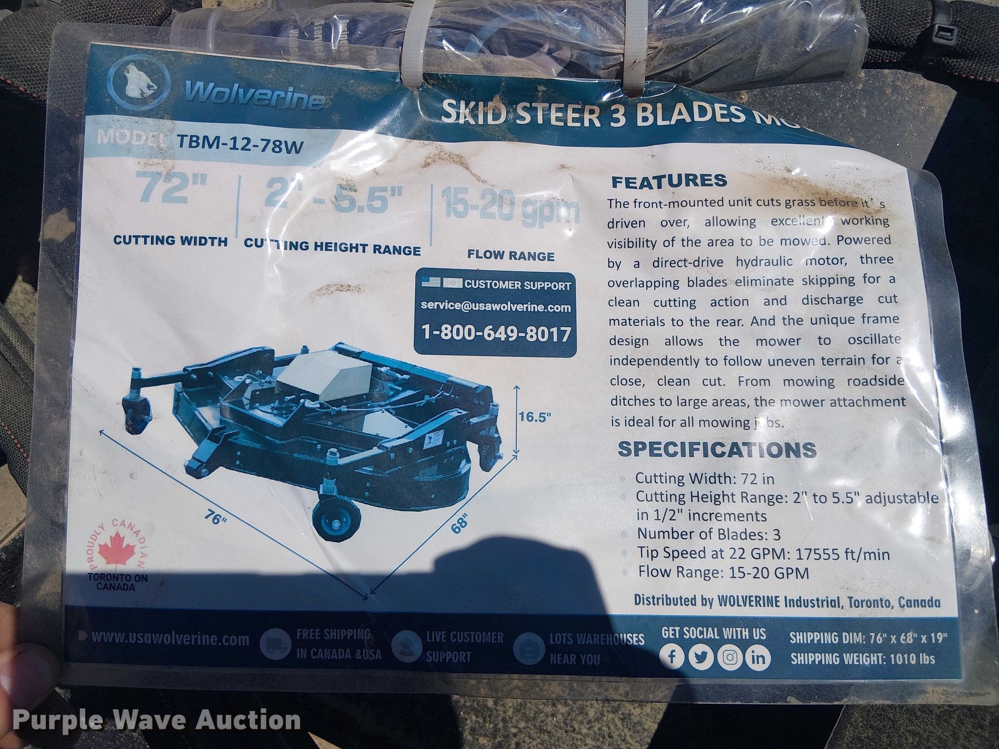 Purple Wave is selling a used Skid Steer Attach. in Texas. This item is a 2024 Wolverine TBM-12-78W skid steer finish mower with the following: Serial: ZW-01086, Width: 72"
