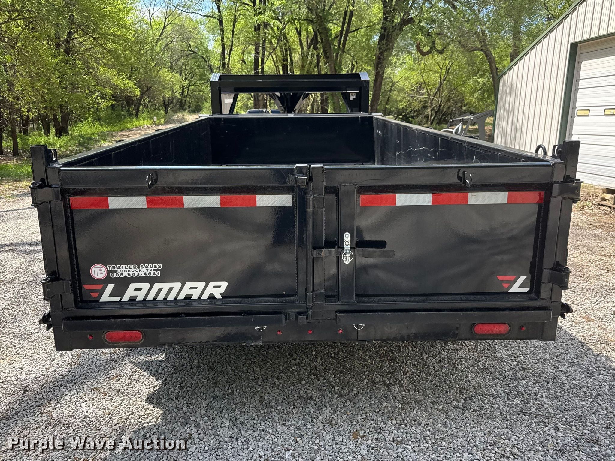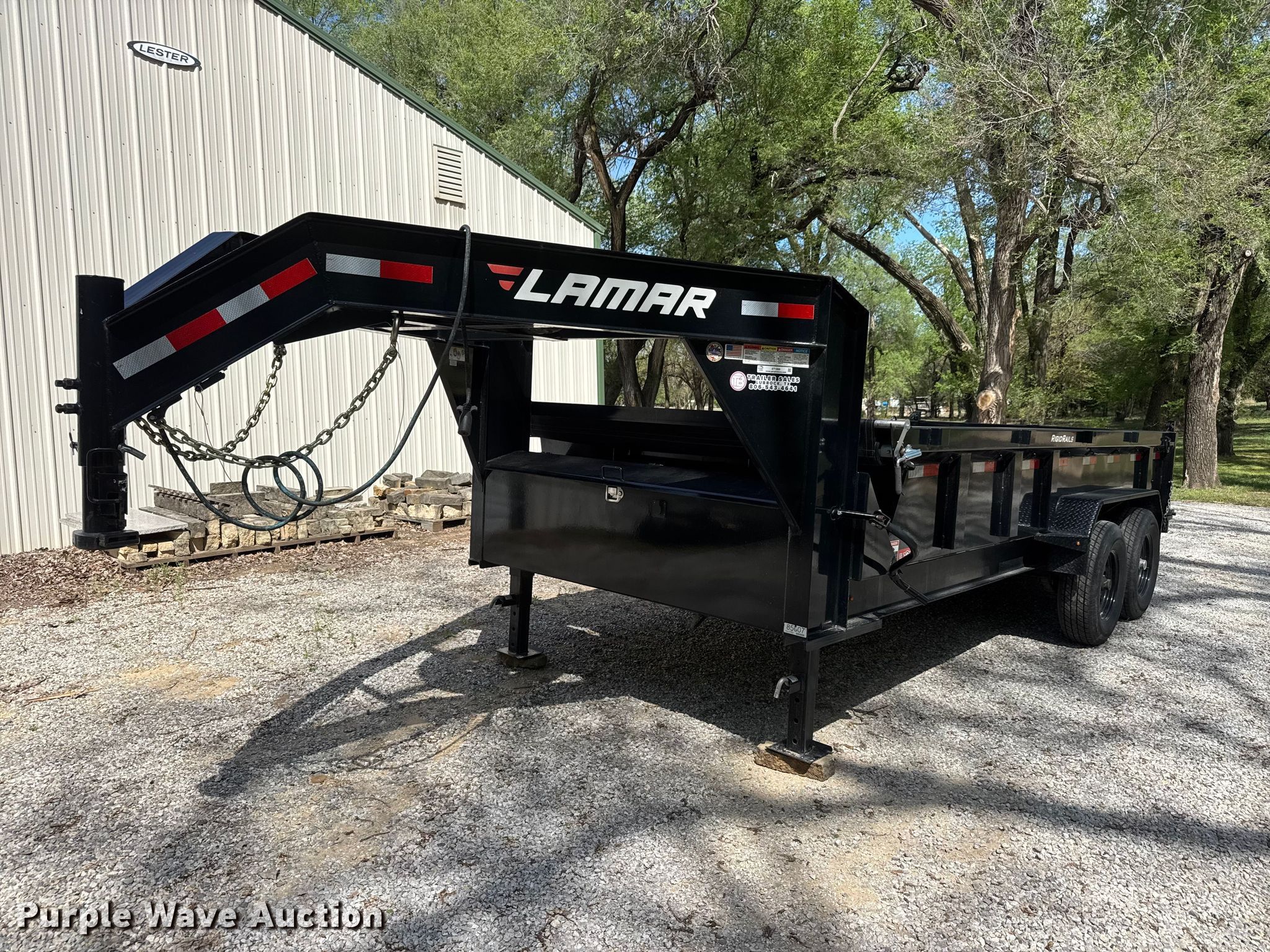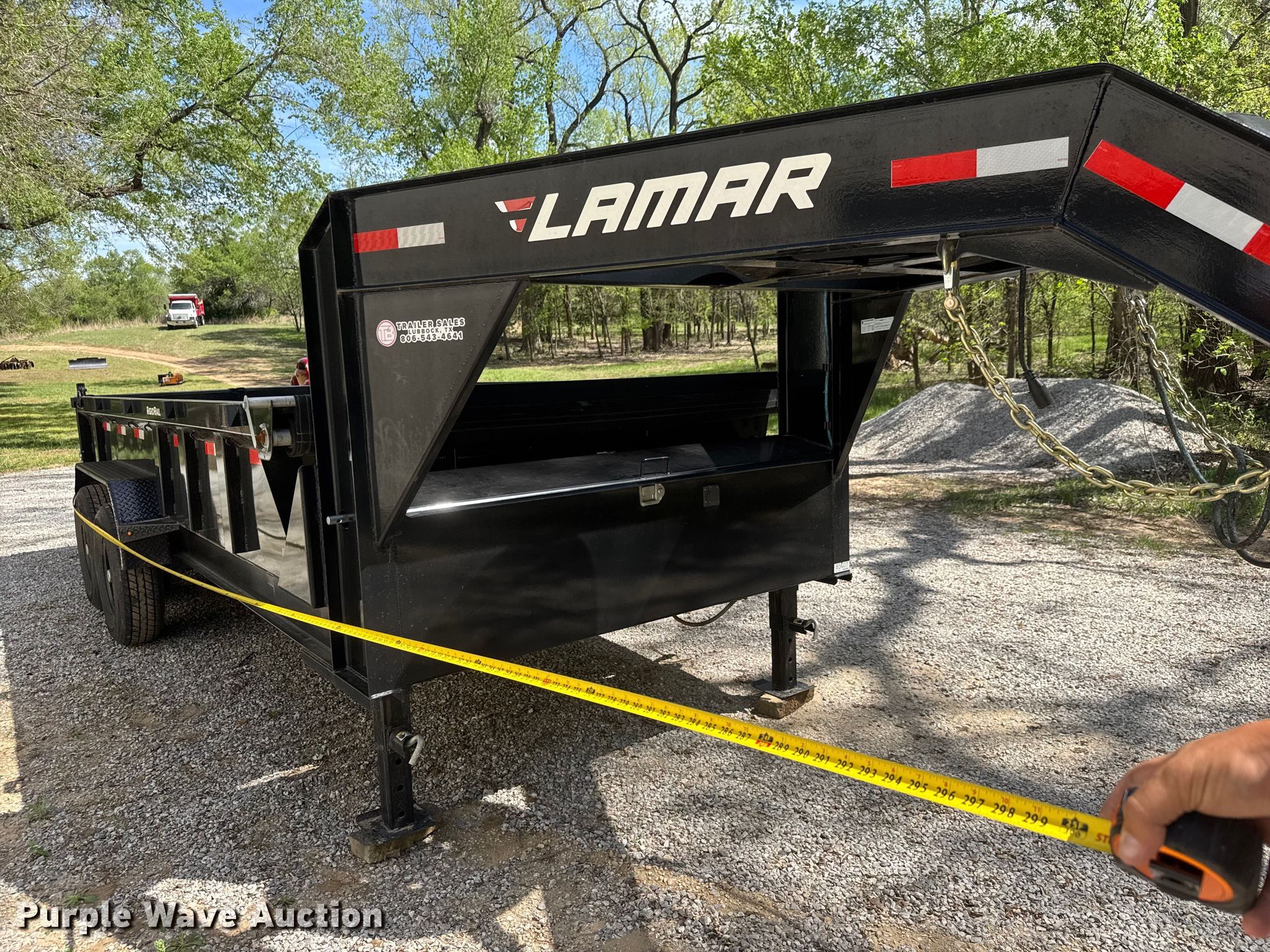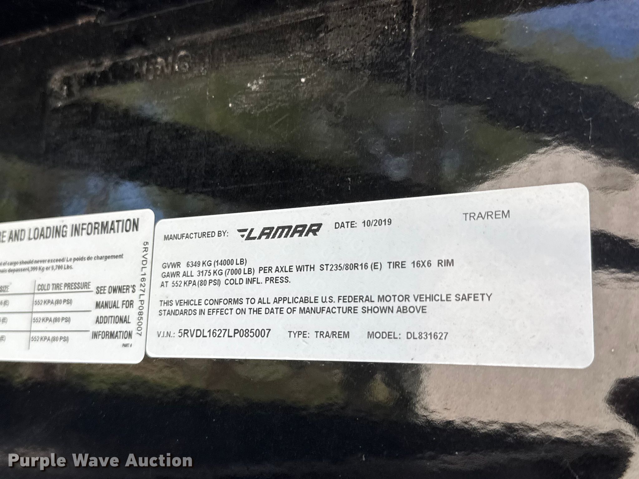2020 Lamar DL831627 dump trailer. VIN: 5RVDL1627LP085007. Dimensions Overall Length: 25', Width: 102", Body Length: 16', Width: 89", Side height: 24". Features Body type: Steel, Ram: Single, End gate: Manual, Roll tarp, Ramps Length: 80". Chassis Hitch: Gooseneck, Landing gear: Dual, Suspension: Spring, Brakes: Electric, Axles: Tandem, GVWR: 14,000 lbs, GAWR: 7,000 lbs. Tires Steel wheels, Size: 235/80R16. Texas title. Title distribution may be delayed up to 14 days from verification of funds. Buhler, KS 67522