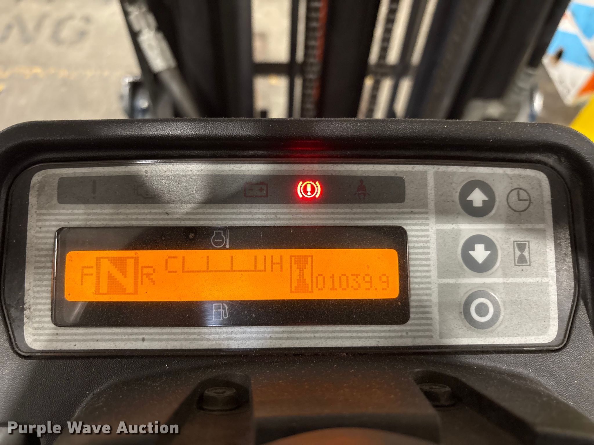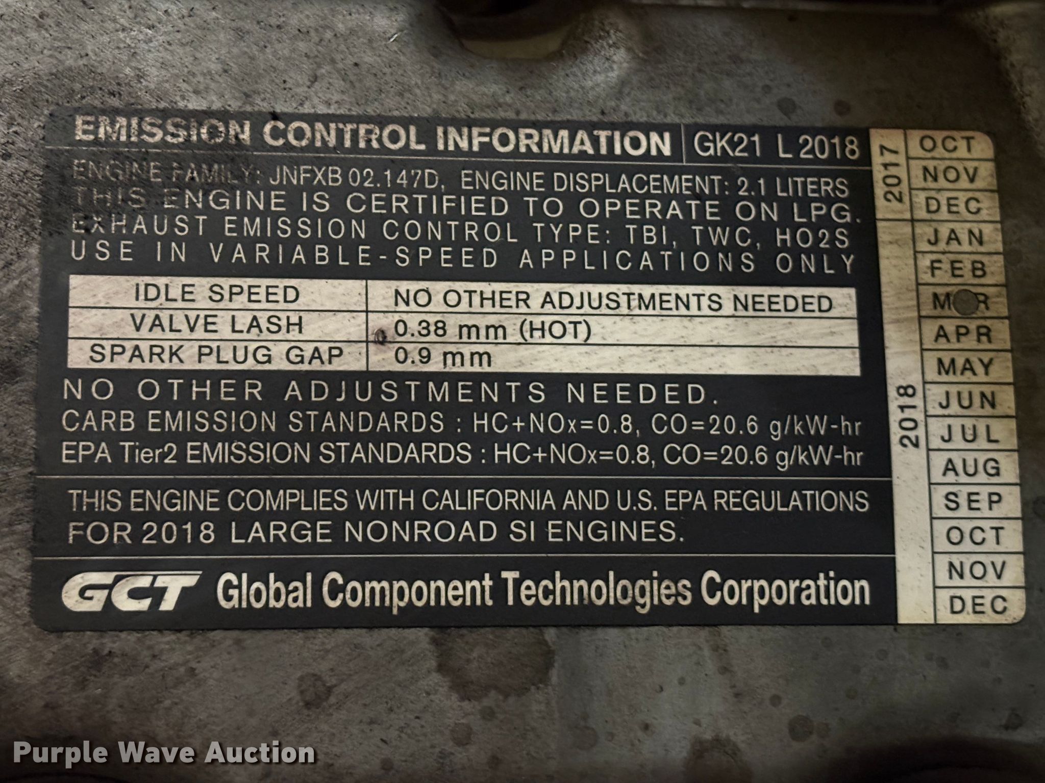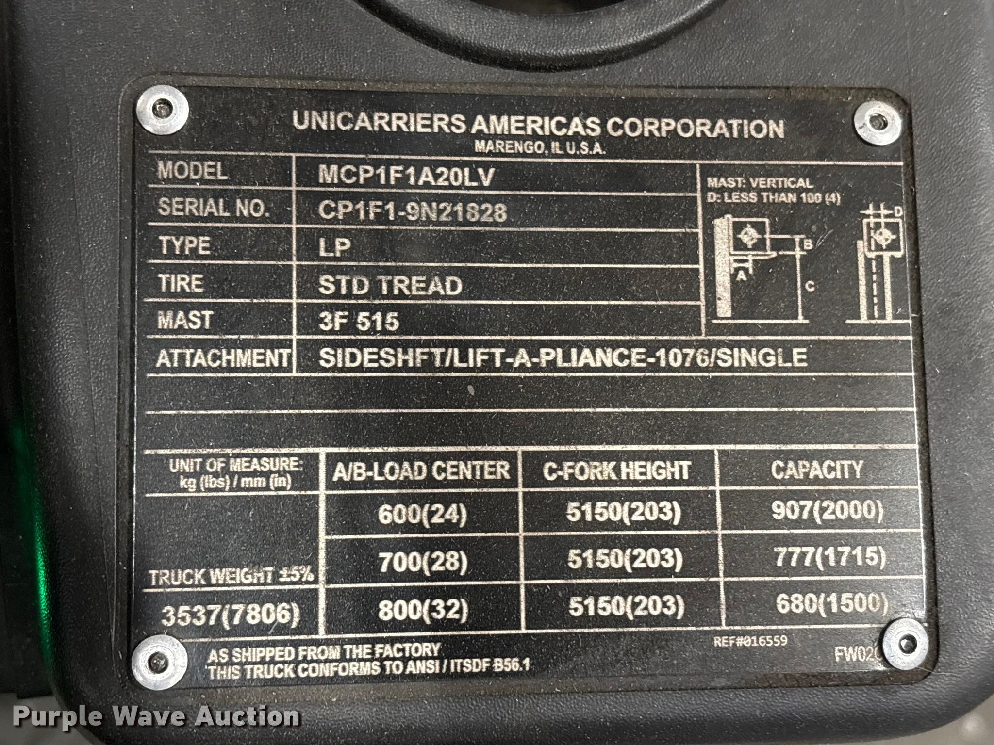 2018 UniCarriers CFS40 forklift. Hours: 1,040 on meter, Miles or hours may vary, unit still in use, Serial: CP1F1-9N21828, Unit #: SFS2875. Engine GCT, Displacement: 2.1L, Cylinders: 4, Fuel type: LPG LP bottle: Not included. Transmission Automatic. Operators station OROPS. Features Maximum lift capacity: 2,000 lbs, Maximum lift height: 203", Collapsed mast height: 88", Mast stages: 3, Side shift, Mast tilt, Fork length: 43". Tires Front: 18x6x12, Rear: 14x5x10, Solid. Notes Warning indicator: Master warning. Ferguson. Lexington, KY 40509