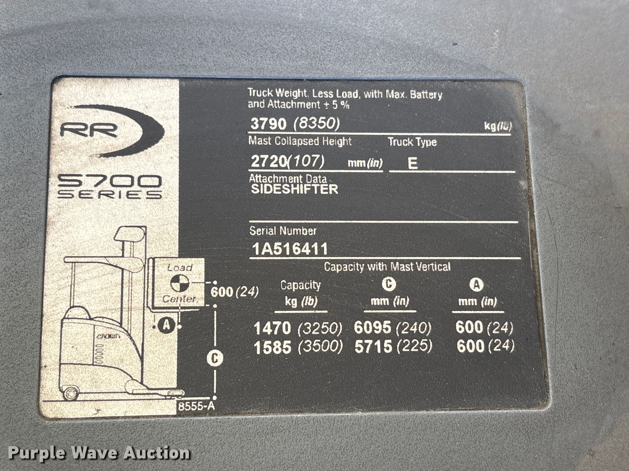 2017 Crown RR5725-35 reach truck. Hours: 3,627 on meter, Serial: 1A516411, Unit #: SFS3220. Electric Motor Volts: 36. Transmission Electric drive. Features Maximum lift capacity: 3,500 lbs, Collapsed mast height: 107", Mast stages: 3, Reach / retract. Notes Unknown operating condition. Ferguson. Houston, TX 77041