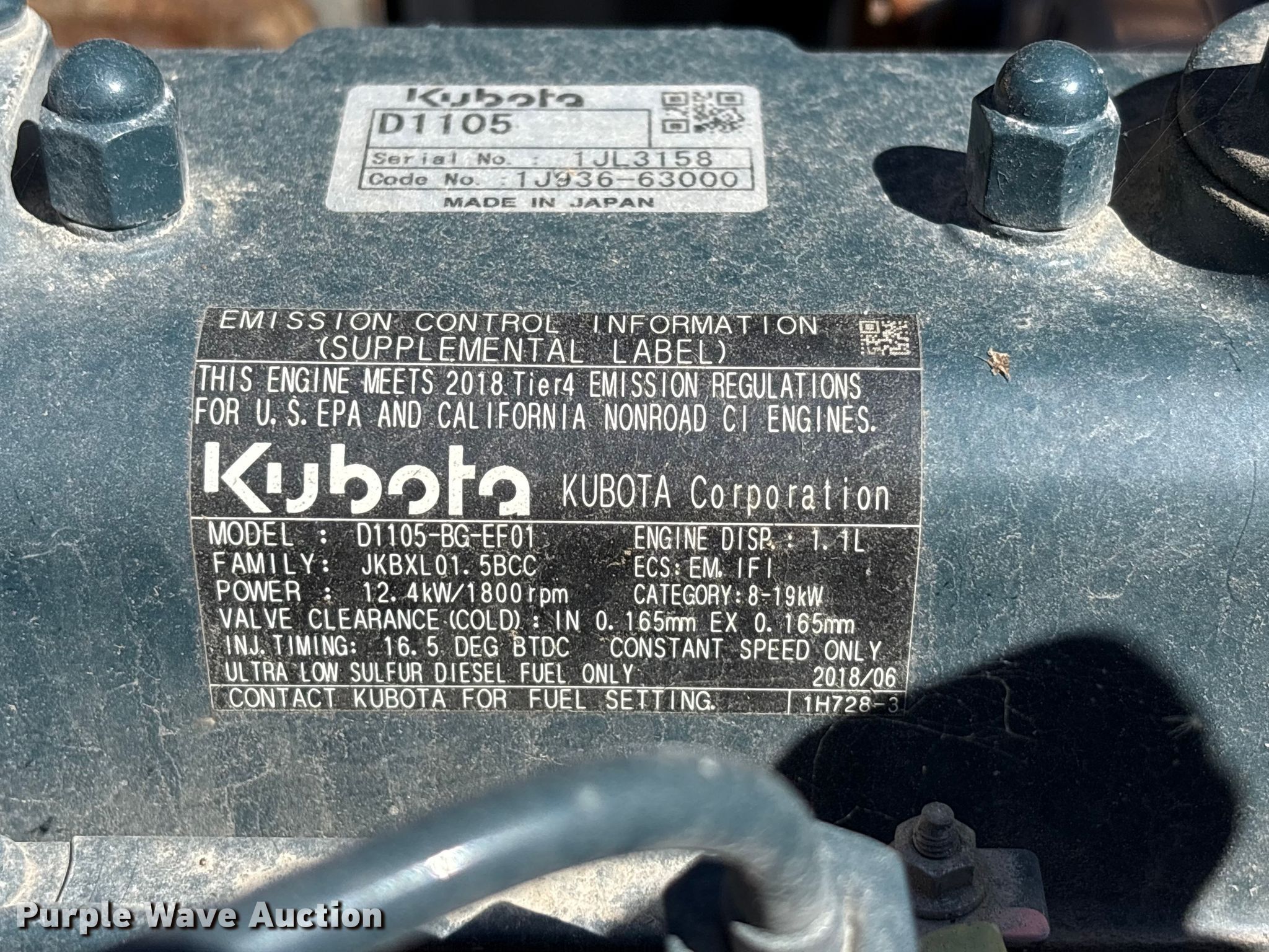 2018 Wacker Neuson light plant. Hours: 7,924 on meter, VIN: 5XFLV0415JM001927, Unit #: 104510. Engine Kubota, Displacement: 1.1L, Cylinders: 3, Fuel type: Diesel. Trailer Ball hitch size: 2", Suspension: Torsion, Axles: Single, Tire size: 175/80D13, GVWR: 2,050 lbs. Notes Engine cover not attached. This is worksite support equipment and will not come with a title. Transfer of ownership documentation will be a bill of sale. Stallion Infrastructure Services Ltd.. Carmichaels, PA 15320