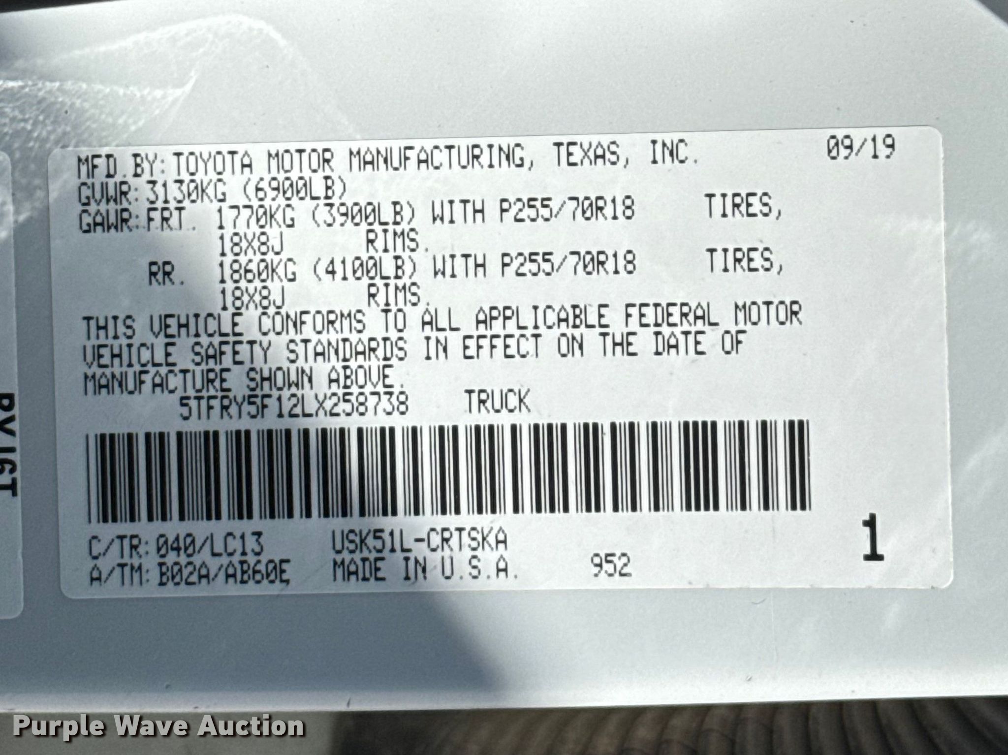 Purple Wave is selling a used 1/2 Ton Pickup or Van in Oklahoma. This item is a 2020 Toyota Tundra Crew Cab pickup truck with the following: Miles: 126,516 on odometer, VIN: 5TFRY5F12LX258738