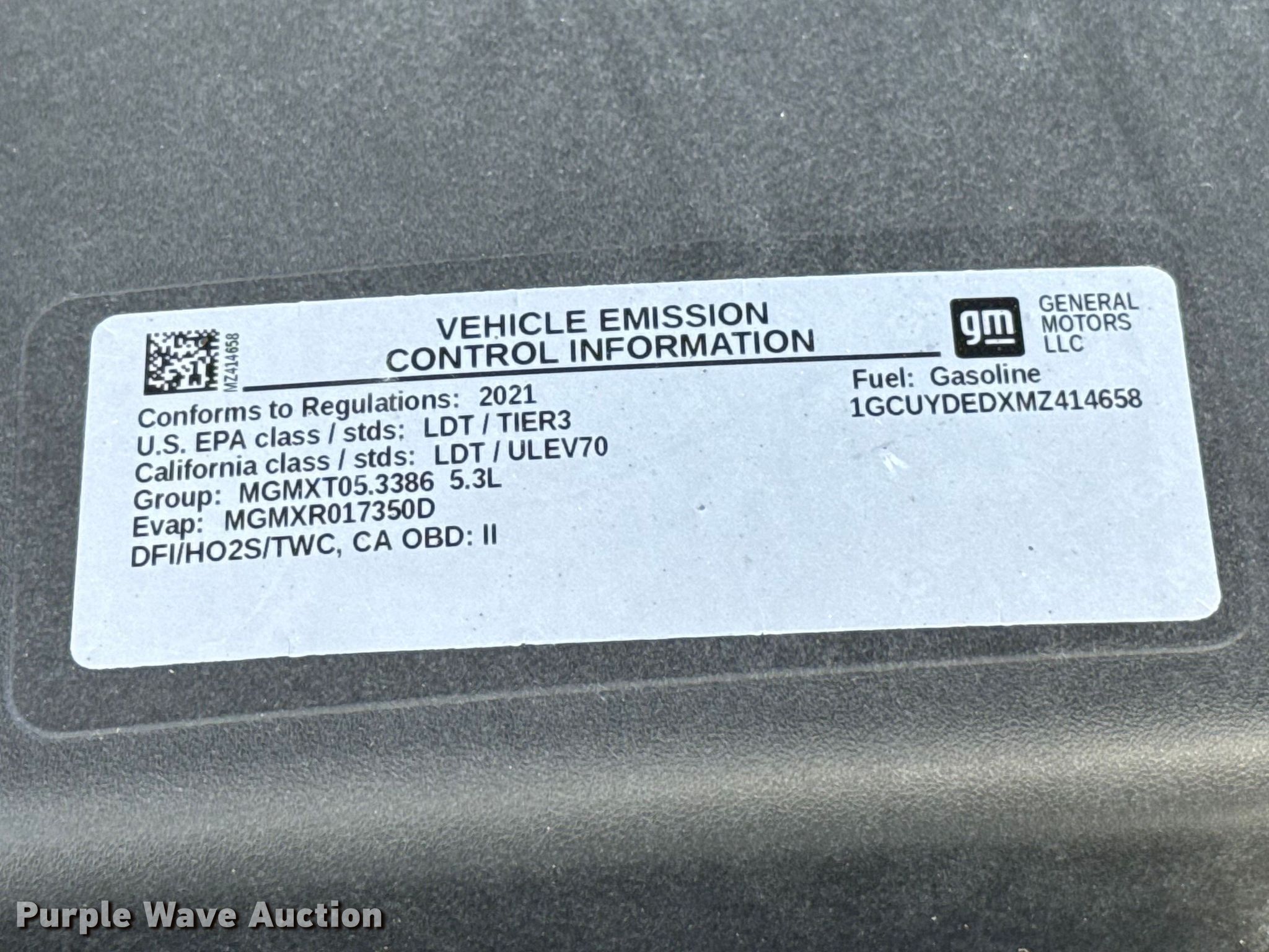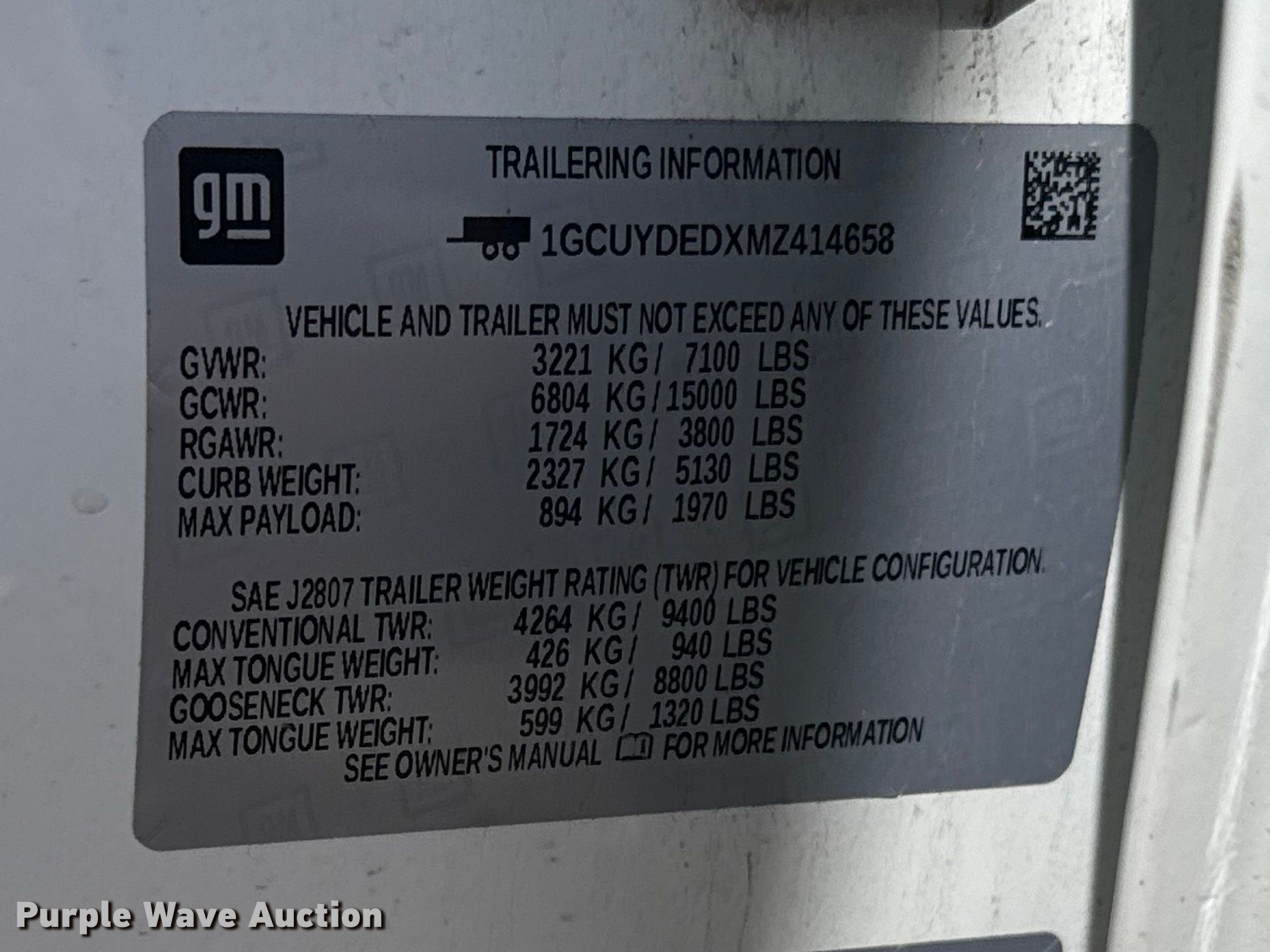 2021 Chevrolet Silverado 1500 Crew Cab pickup truck. Miles: 127,007 on odometer, VIN: 1GCUYDEDXMZ414658. Engine Displacement: 5.3L, Cylinders: 8, Fuel type: Gas. Transmission Automatic, Four wheel drive. Interior AC, Heat, Seat: Heated, Power driver, Power windows, Power locks, Cruise control, Backup camera, Brake controller. Tires Size: 265/65R18. Texas title. Title distribution may be delayed up to 14 days from verification of funds. MMP Holdings LLC. Edmond, OK 73025