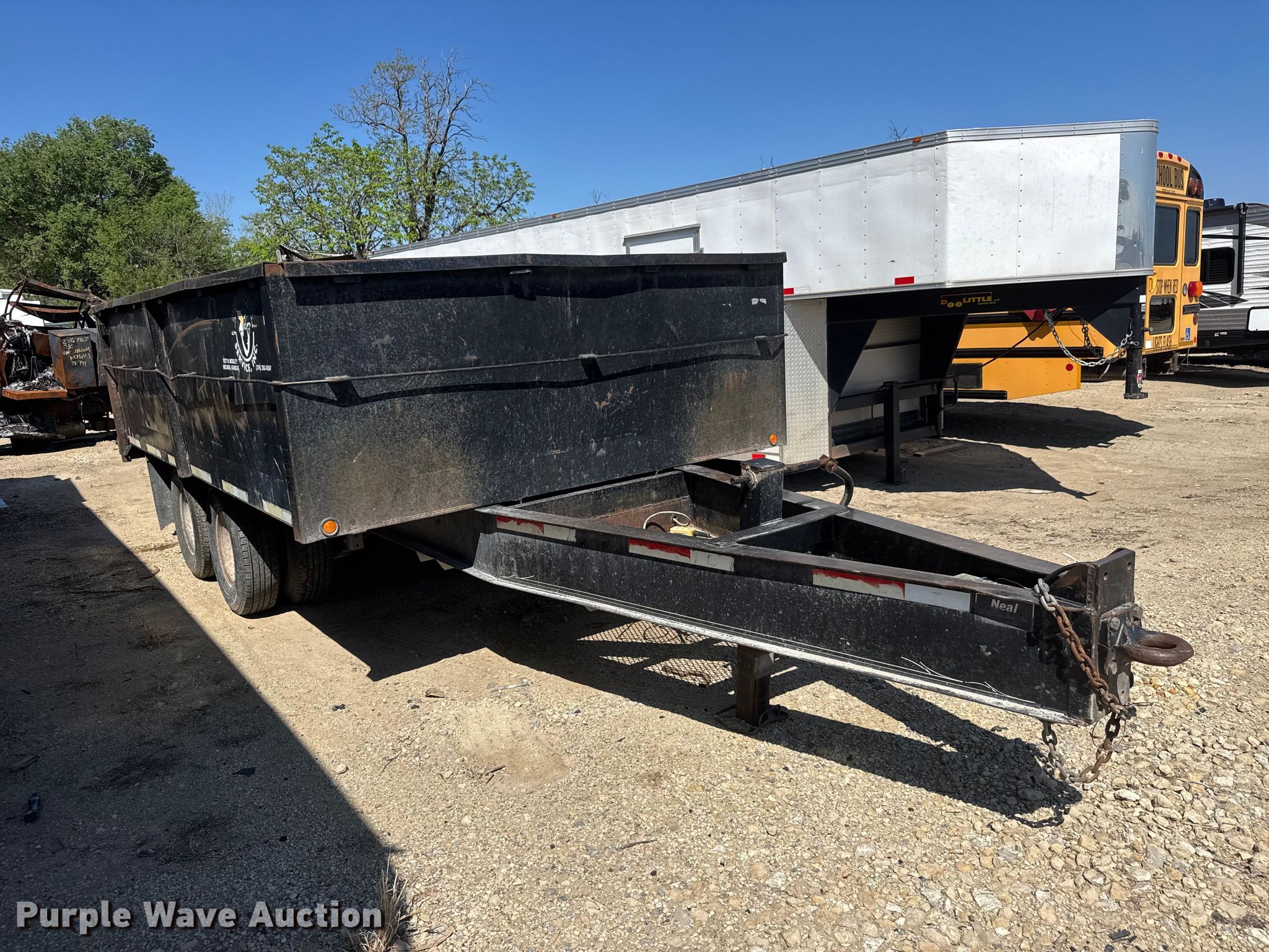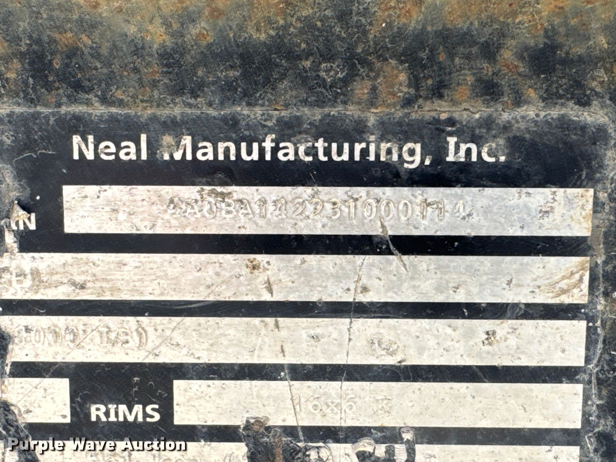 2003 Neal dump trailer. VIN: 4A0BA142231000114, Lot #: 48482486. Dimensions Overall Length: 22', Width: 101", Body Length: 14', Width: 101", Side height: 3'. Features Body type: Steel, Ram: Single, End gate: Manual. Chassis Hitch: Pintle, Landing gear: Single, Suspension: Spring, Brakes: Electric, Axles: Tandem. Tires Steel wheels, Size: 235/85R16. Repossessed item, stored at a secured facility. Please review REQUIRED REMOVAL INSTRUCTIONS. Lender owned. Item condition and history are unknown. No additional information is available. Titles will be distributed after confirmation of payment and removal. Kansas title. Title distribution may be delayed up to 30 days from verification of funds. Lender Owned. Witchita, KS 67216