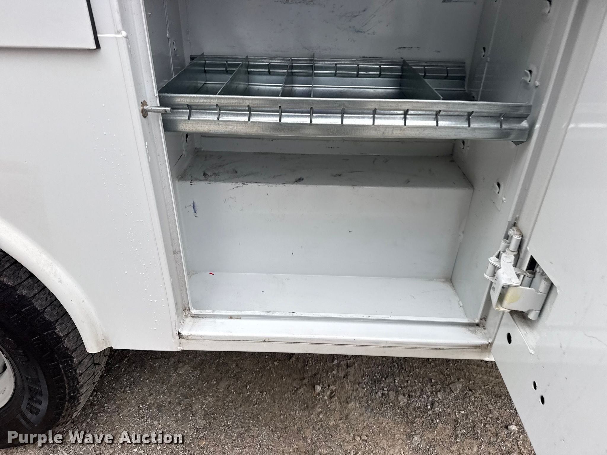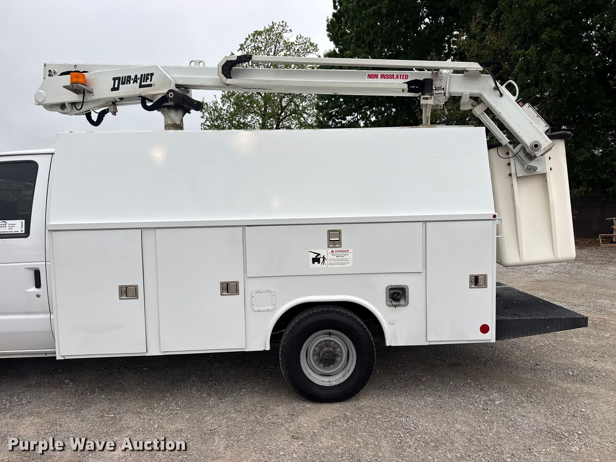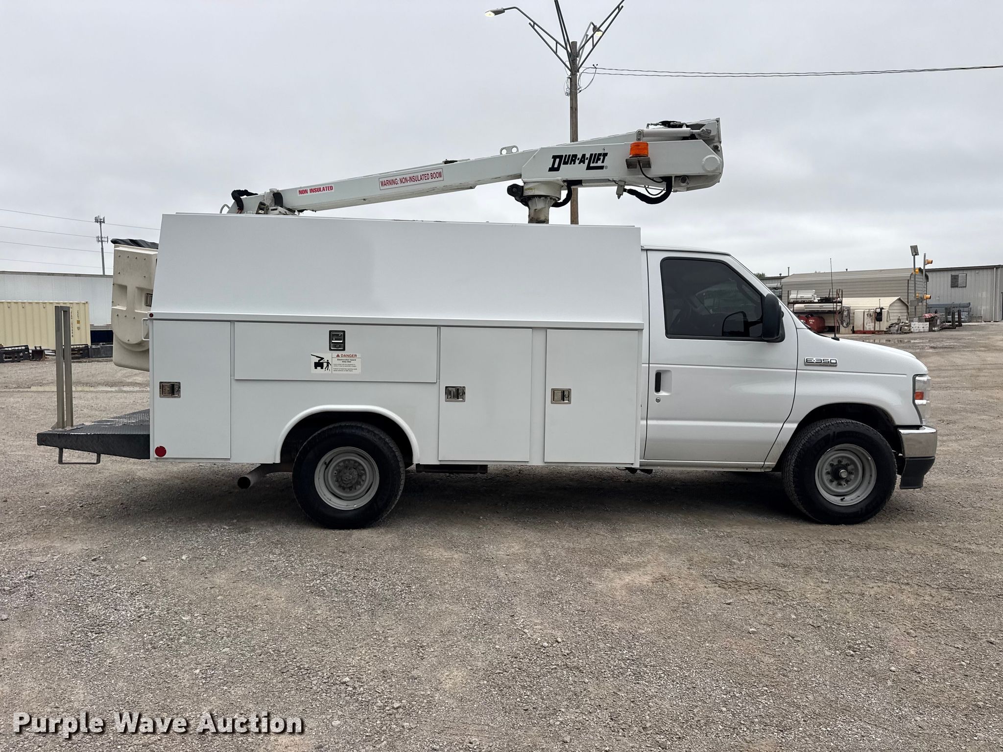 2022 Ford E350 Super Duty van with bucket lift. Miles: 166,700 on odometer, VIN: 1FDWE3FN7NDC30985, Unit #: 204033. Engine Displacement: 7.3L, Cylinders: 8, Fuel type: Gas. Transmission Automatic. Chassis Axles: Single, Suspension: Spring, Brakes: Hydraulic, PTO, GVWR: 10,050 lbs, Wheelbase: 138". Interior AC, Heat, Power windows, Power locks, Cruise control, Auxiliary controls. Features Bed Utility bed, Reading, Length: 11', Width: 84", Boom 2020 Dur-A-Lift Inc DVS-29TS, Serial: A11337, Mast height: 29', Maximum lift capacity: 350 lbs, Boom type: Articulating, Telescopic, Man basket, Boom controls Lower, Basket, Certification valid through: 1/12/27. Tires Size: LT245/75R16. Notes Windshield chipped or cracked. Oklahoma title. Title distribution may be delayed up to 14 days from verification of funds. TLS Group, Inc. Tulsa, OK 74107