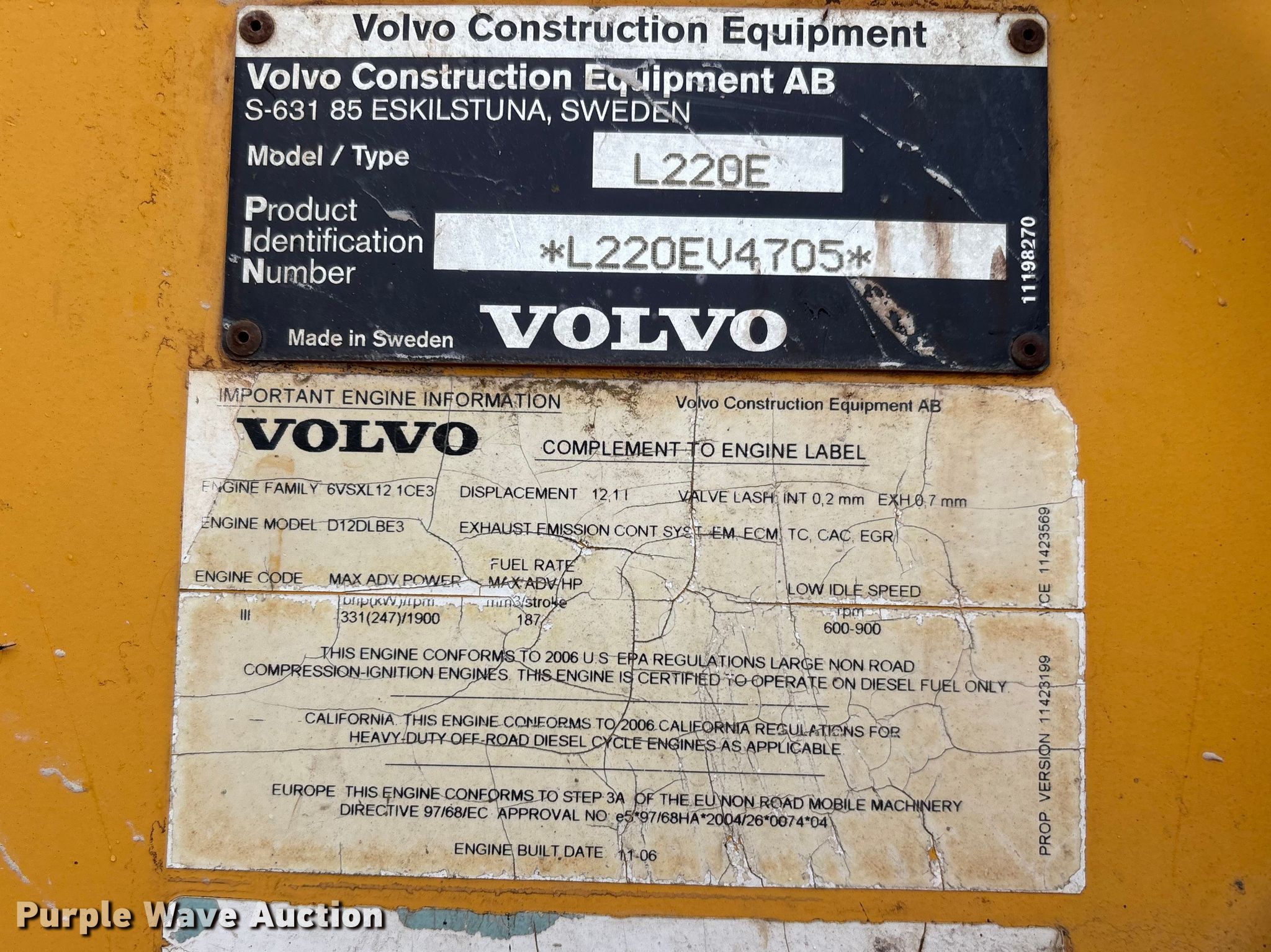 2007 Volvo L220E wheel loader. Hours: 6,038 on meter, Serial: L220EV4705, Unit #: 7510. Engine Volvo, Fuel type: Diesel. Transmission Powershift, 4F - 4R. Chassis Differential lock. Operators station Enclosed cab, AC, Heat, Bucket controls: Two-lever. Features Bucket Width: 130", Cutting edge: Bolt-on. Tires Size: 29.5R25. Notes Oil leak , Bucket damaged. Duffield Gravel. Russellville, AR 72802