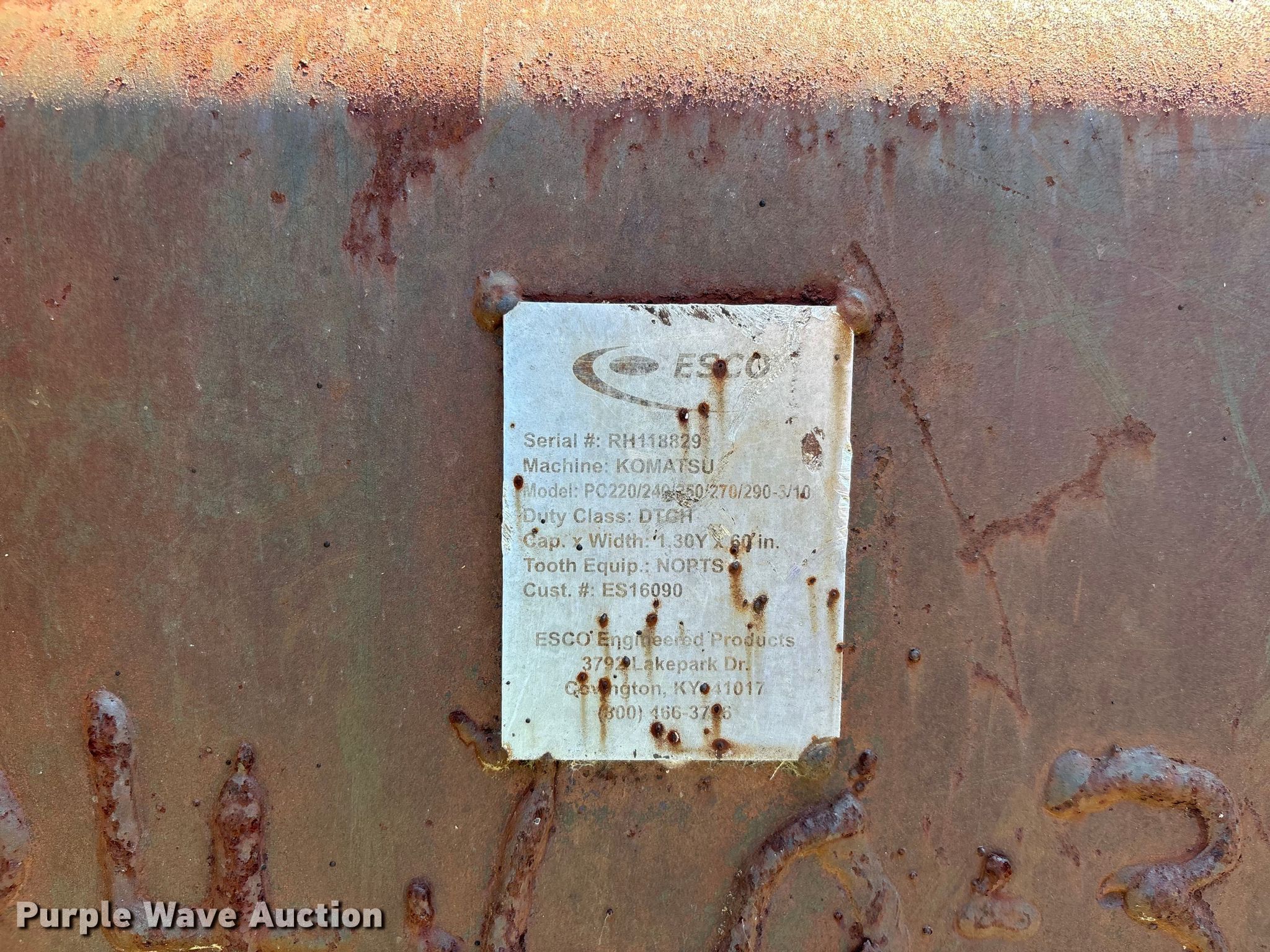 Purple Wave is selling a used Excavator Attach. in Missouri. This item is a Esco bucket with the following: Serial: RH118829, Width: 60", Cutting edge: Weld-on
