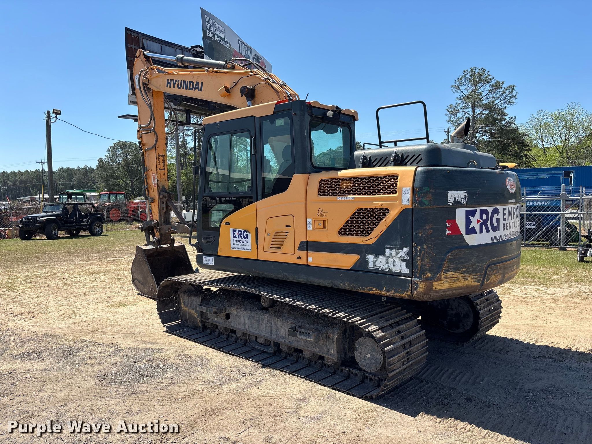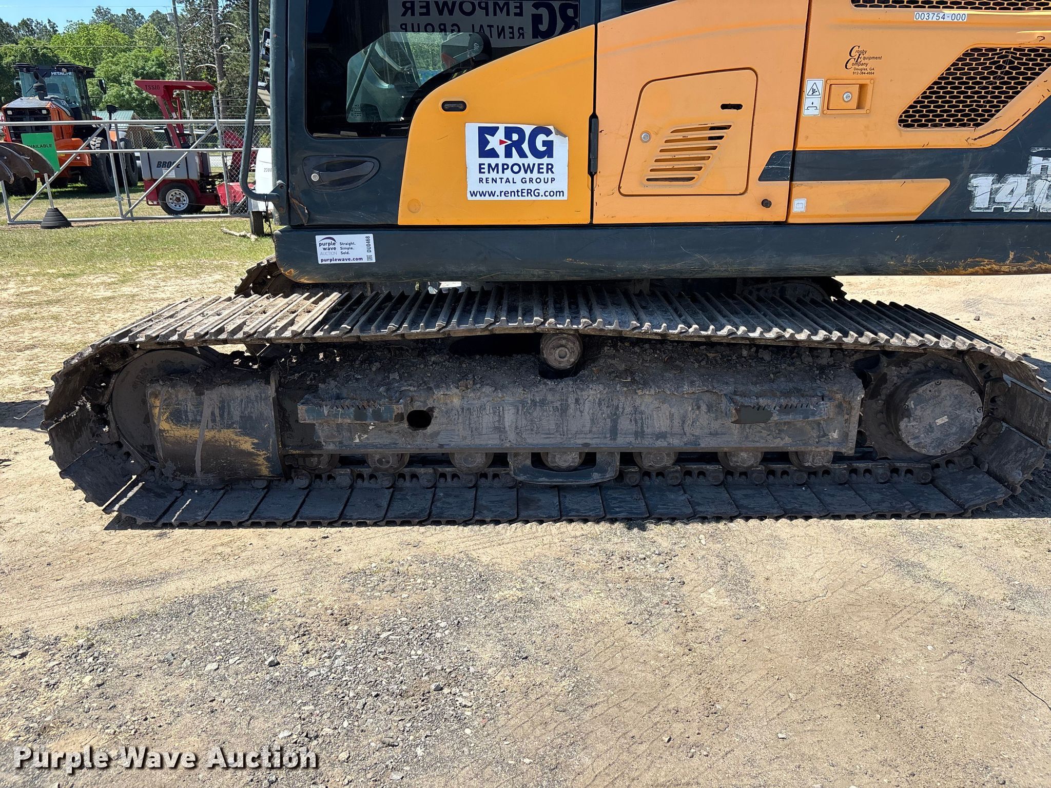 Hyundai HX140L excavator. Hours: 2,807 on meter, Serial: HHKHK401EG0000089, Unit #: 003754-000. Engine Cylinders: 4, Fuel type: Diesel. Transmission Hydrostatic. Operators station Enclosed cab, AC, Heat, Backup camera. Features Auxiliary hydraulics, Counter weights, Boom Standard, Stick Stick length: 9' 11", Quick coupler: Mechanical, Thumb: Manual, Bucket Width: 40", Teeth: 5. Tracks Width: 27.5", Steel, Grouser pads: Triple. Empower Rental Group. Tifton, GA 31793