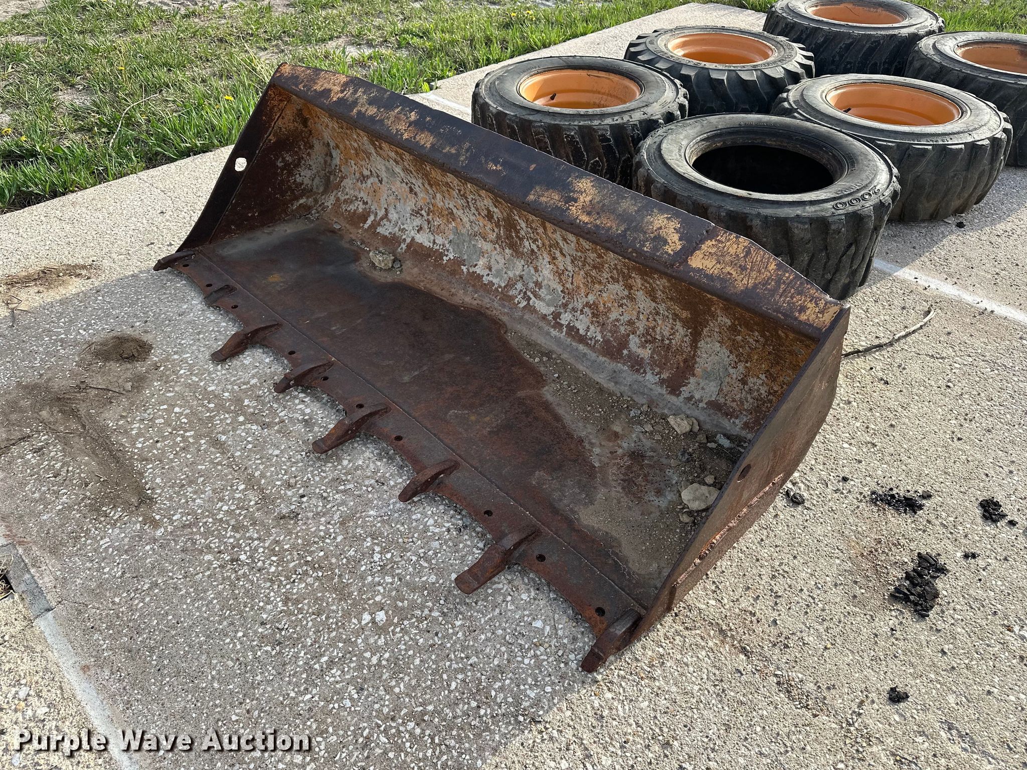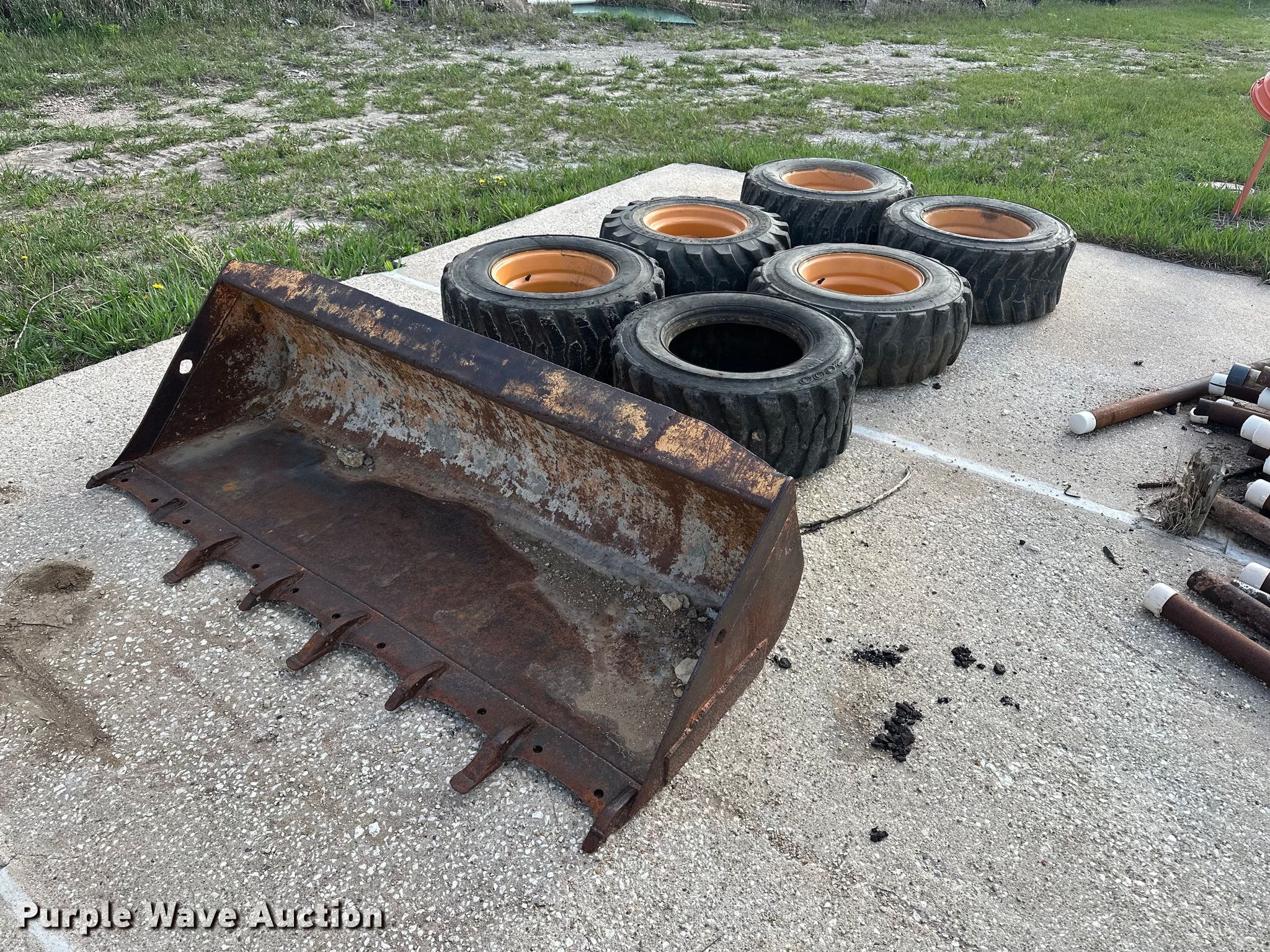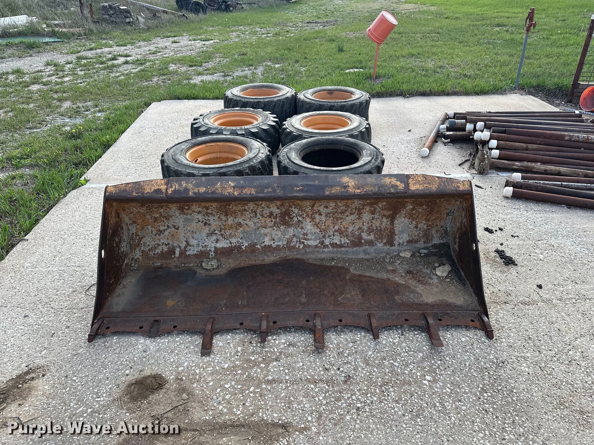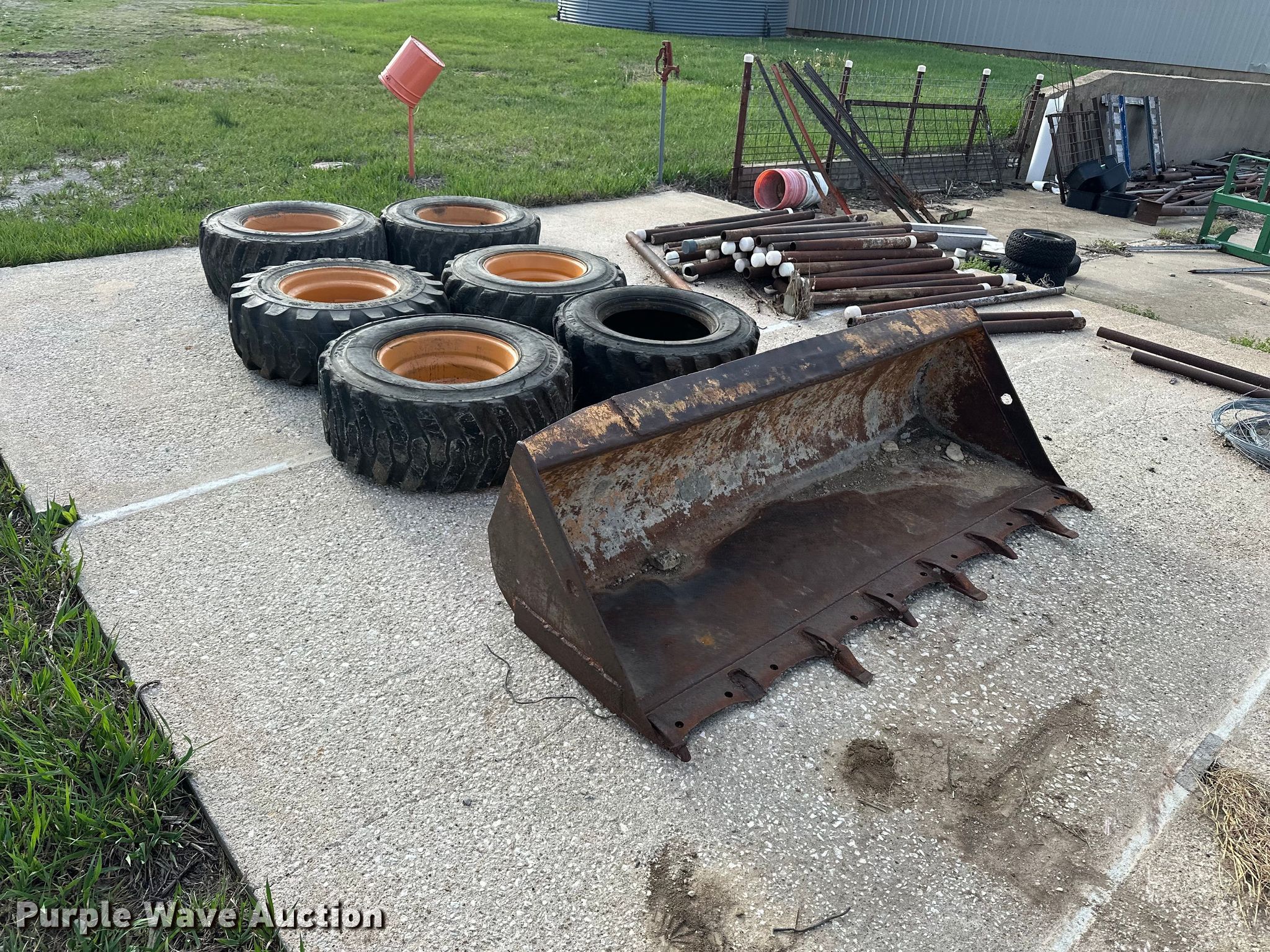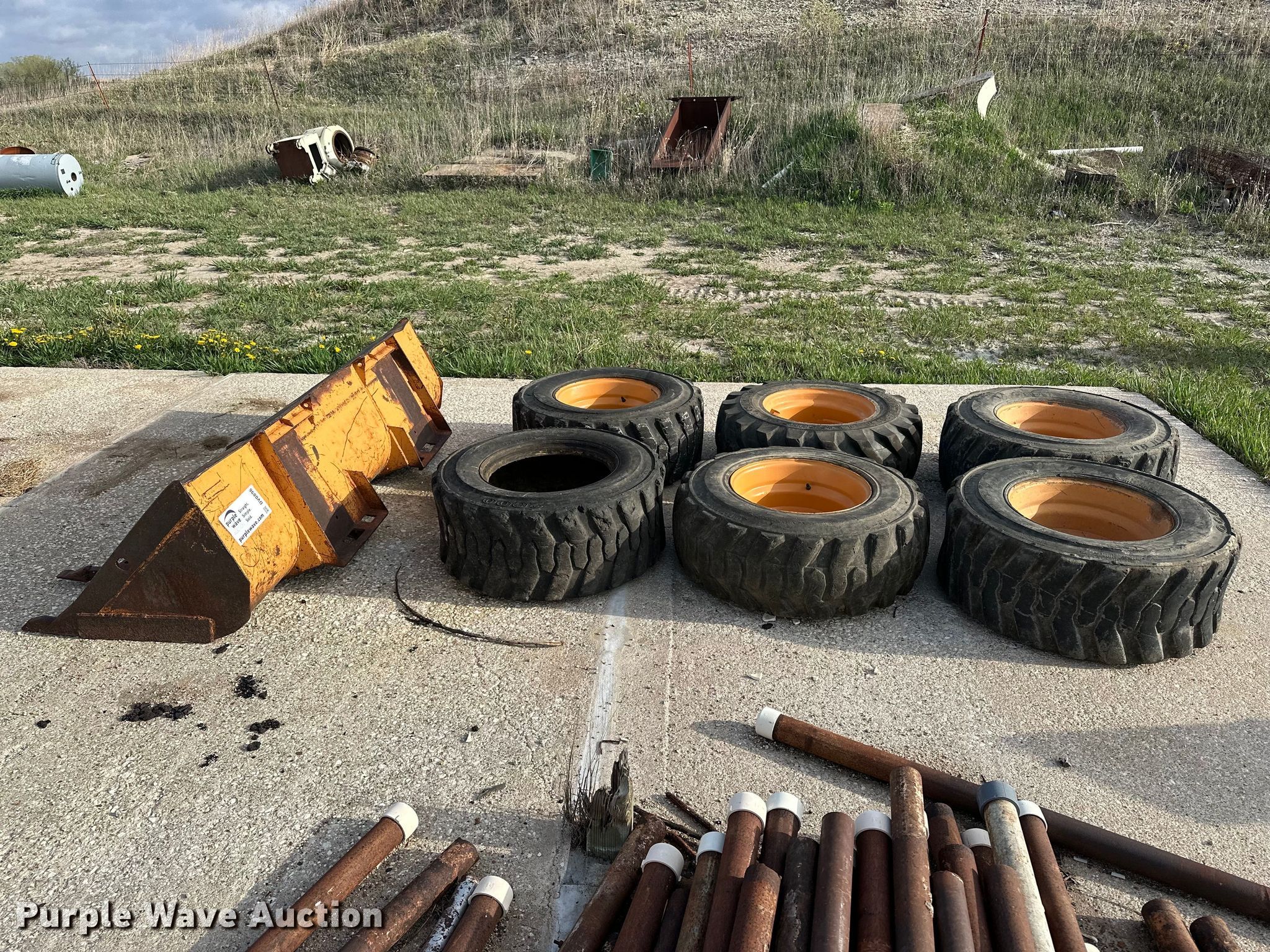 Skid steer attachments. Width: 72", Teeth: Weld-on, (5) 12-16.5 tires and wheels Removed from a Case 1845C, Titan Hd 12-16.5 tire. Westmoreland, KS 66549