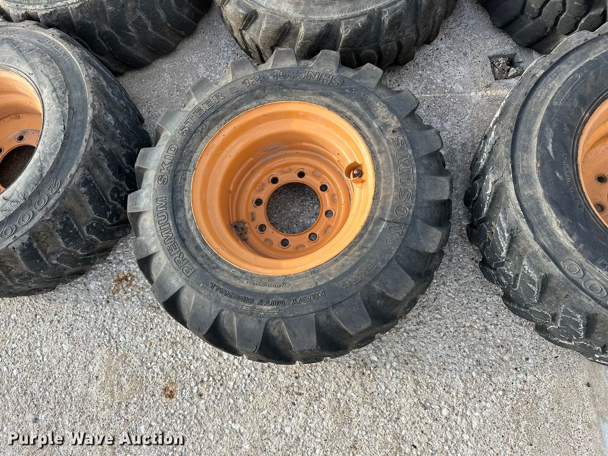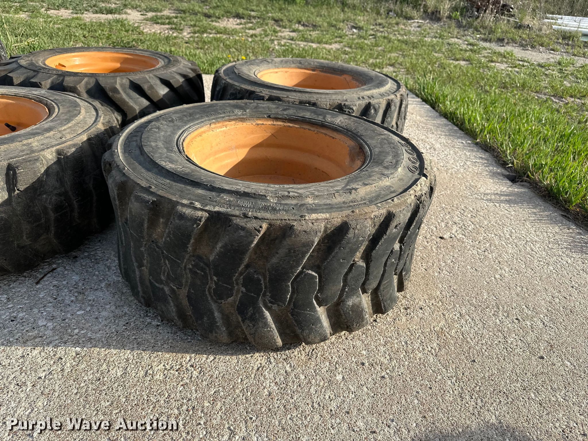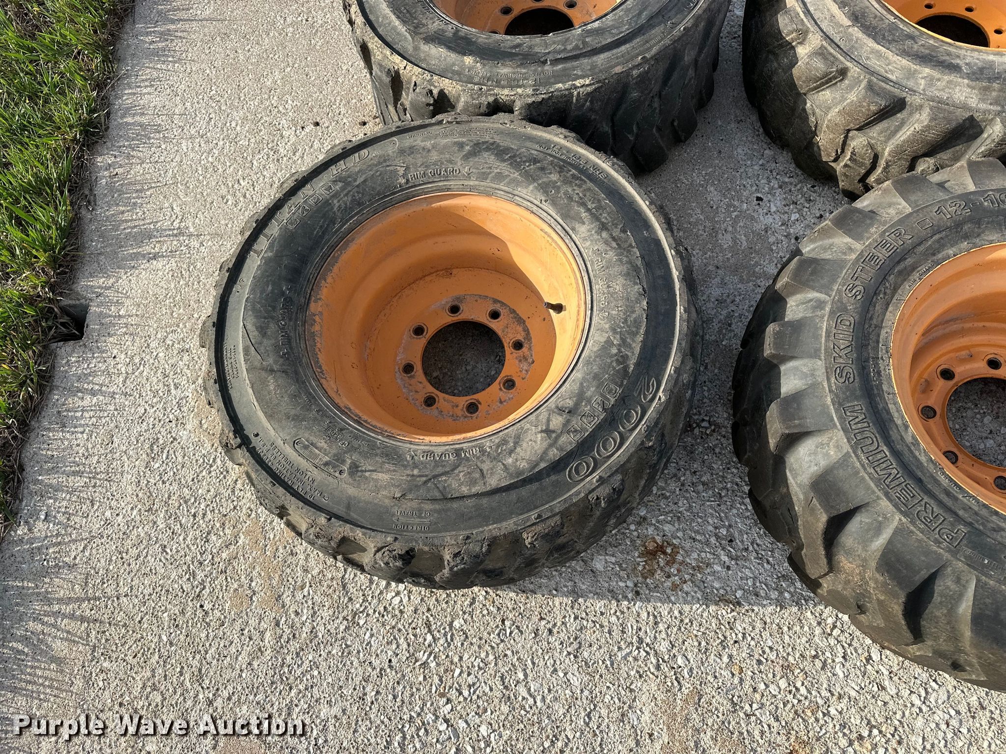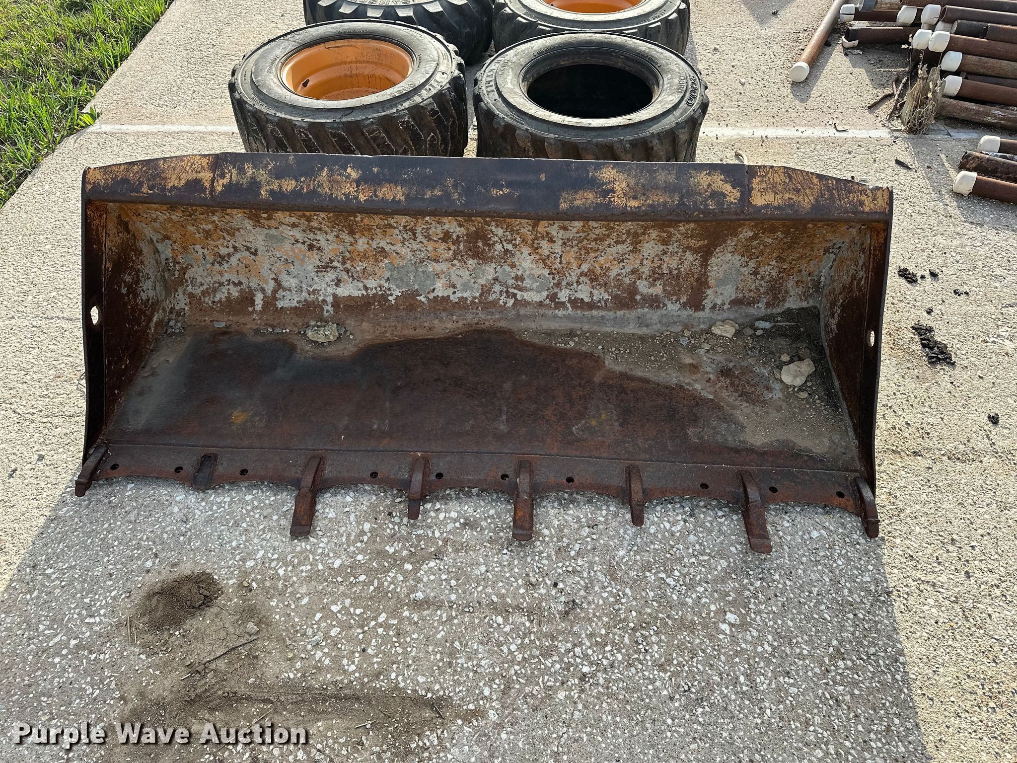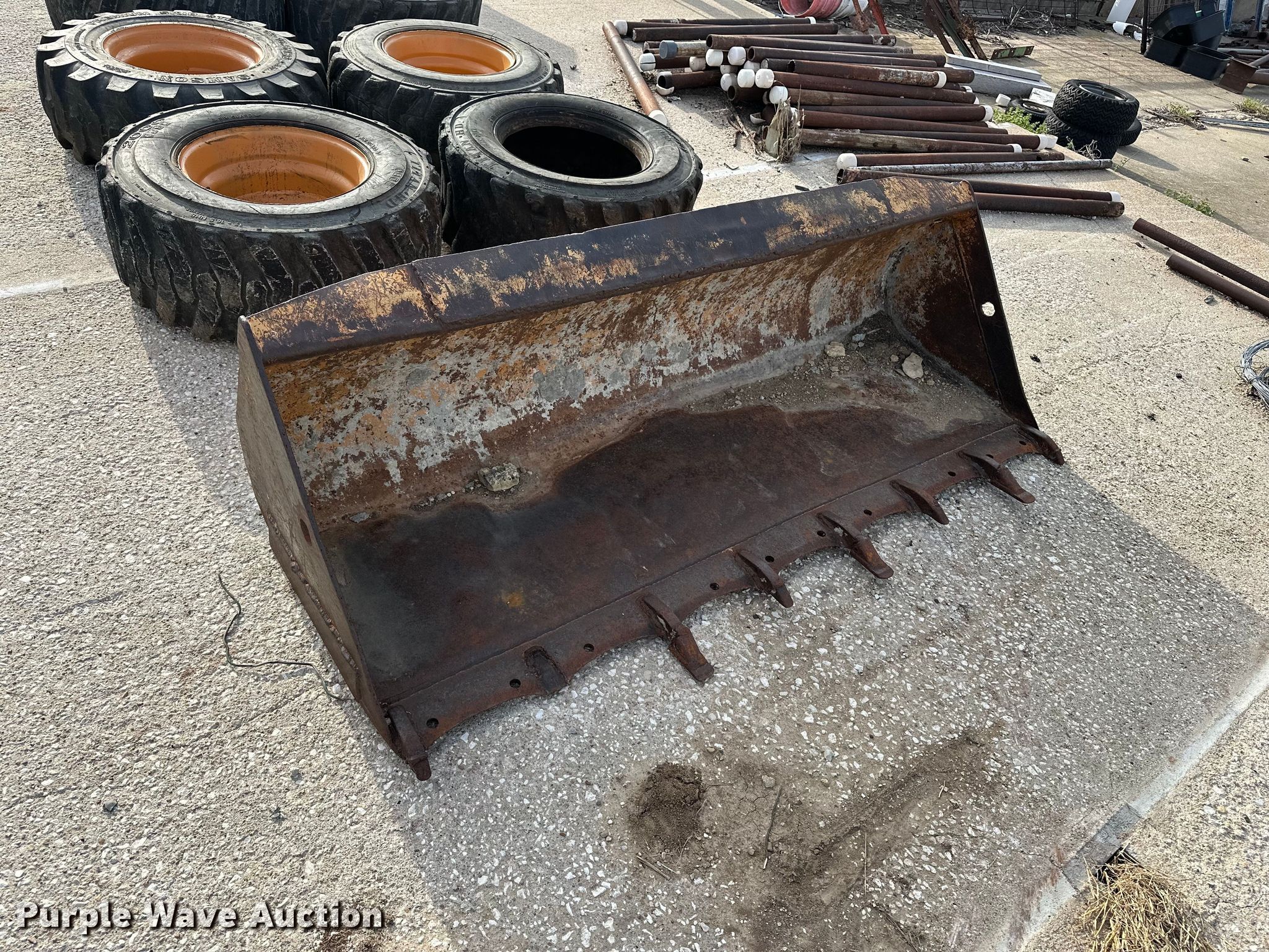 Skid steer attachments. Width: 72", Teeth: Weld-on, (5) 12-16.5 tires and wheels Removed from a Case 1845C, Titan Hd 12-16.5 tire. Westmoreland, KS 66549