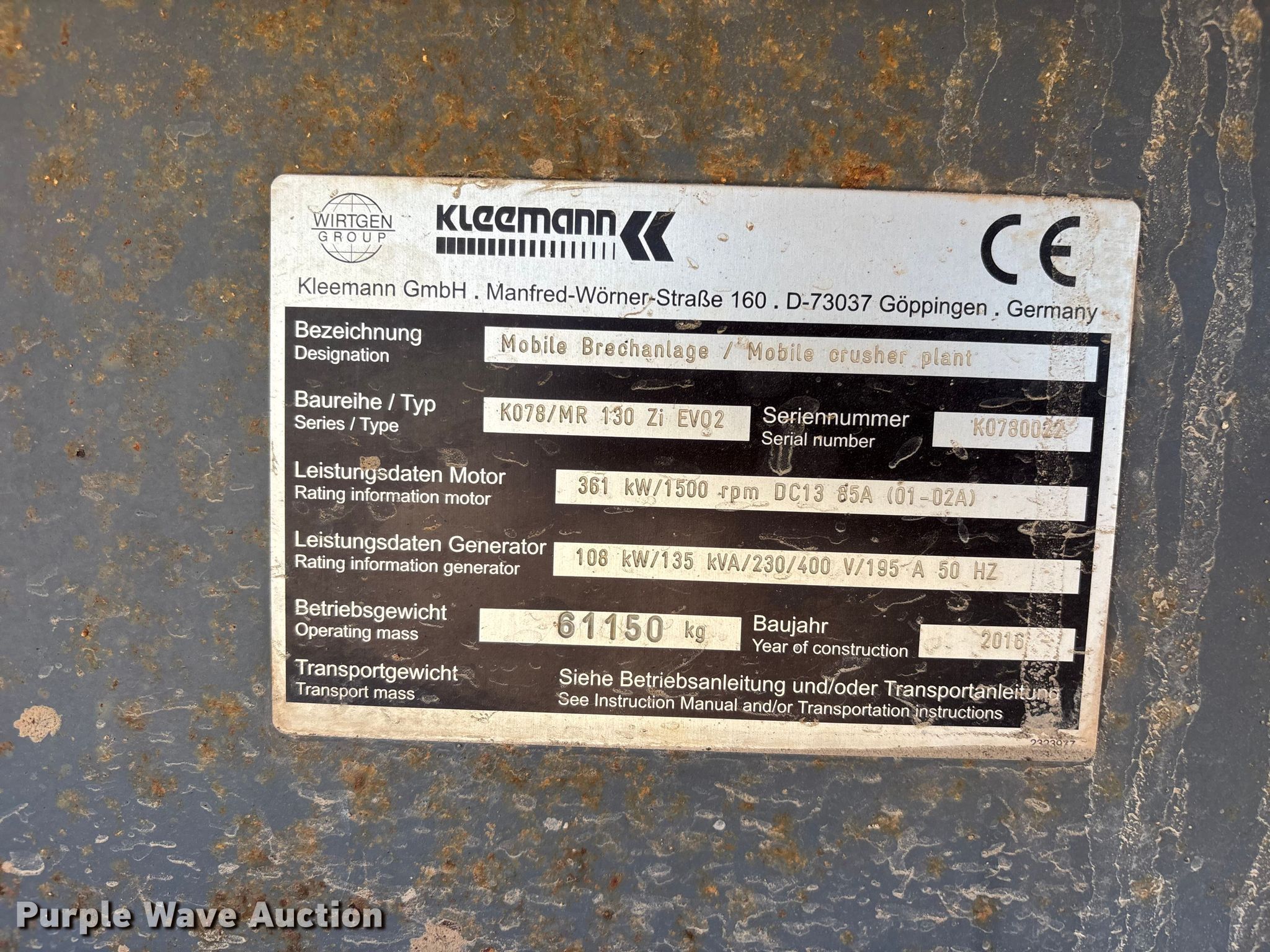 Take a look at this used 2016 Kleemann K078 MR130Zi EVO2 mobile impact crushing plant being sold on May 21st, 2026 in the Thursday May 21 Construction Equipment Auction made by Kleemann. Take a look at all of the item information below or take a look at similar auctions for Quarry and Aggregate.