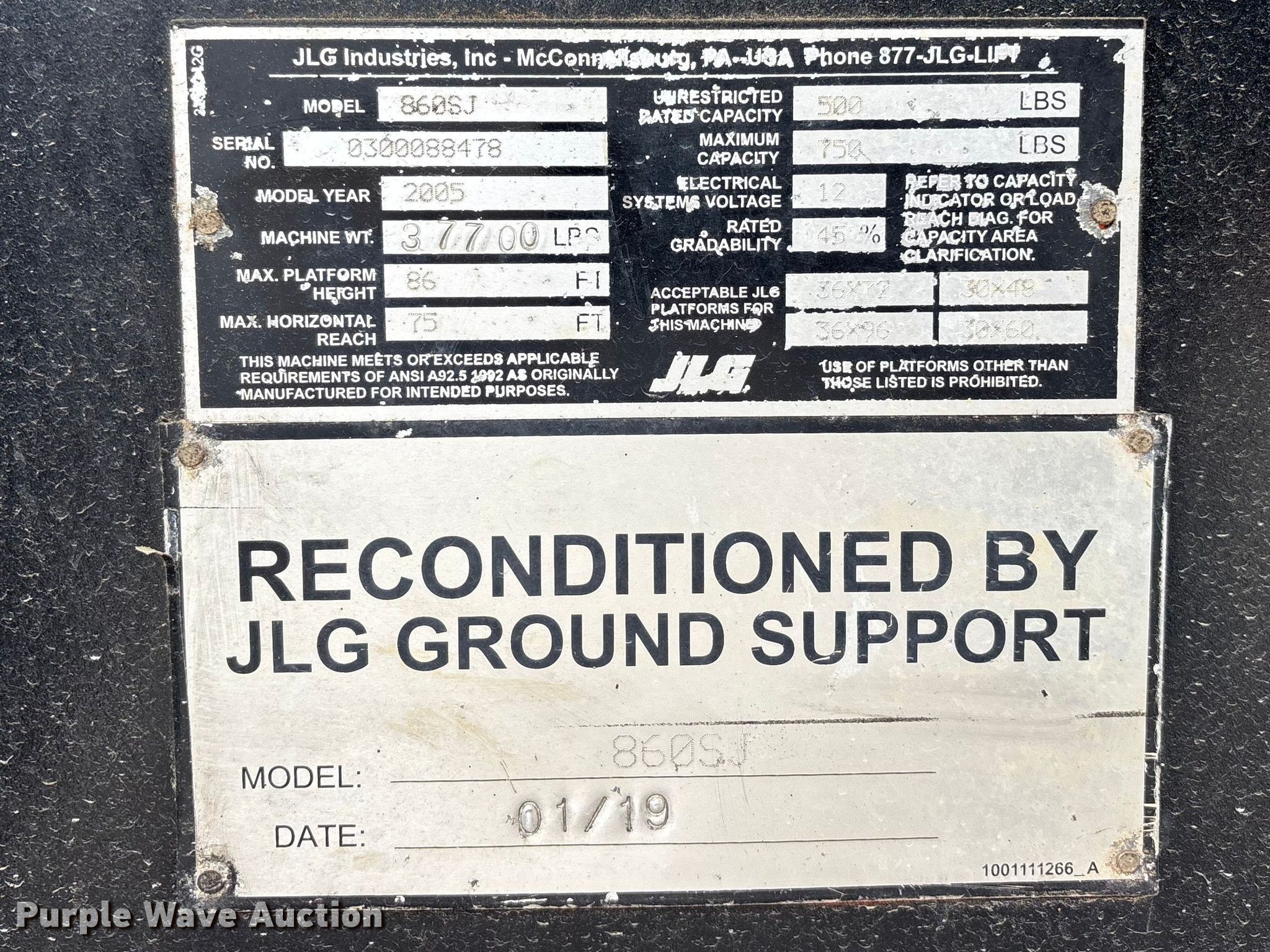 Take a look at this used 2005 JLG 860SJ boom lift being sold on May 21st, 2026 in the Thursday May 21 Construction Equipment Auction made by JLG. Take a look at all of the item information below or take a look at similar auctions for Aerial Lifts.