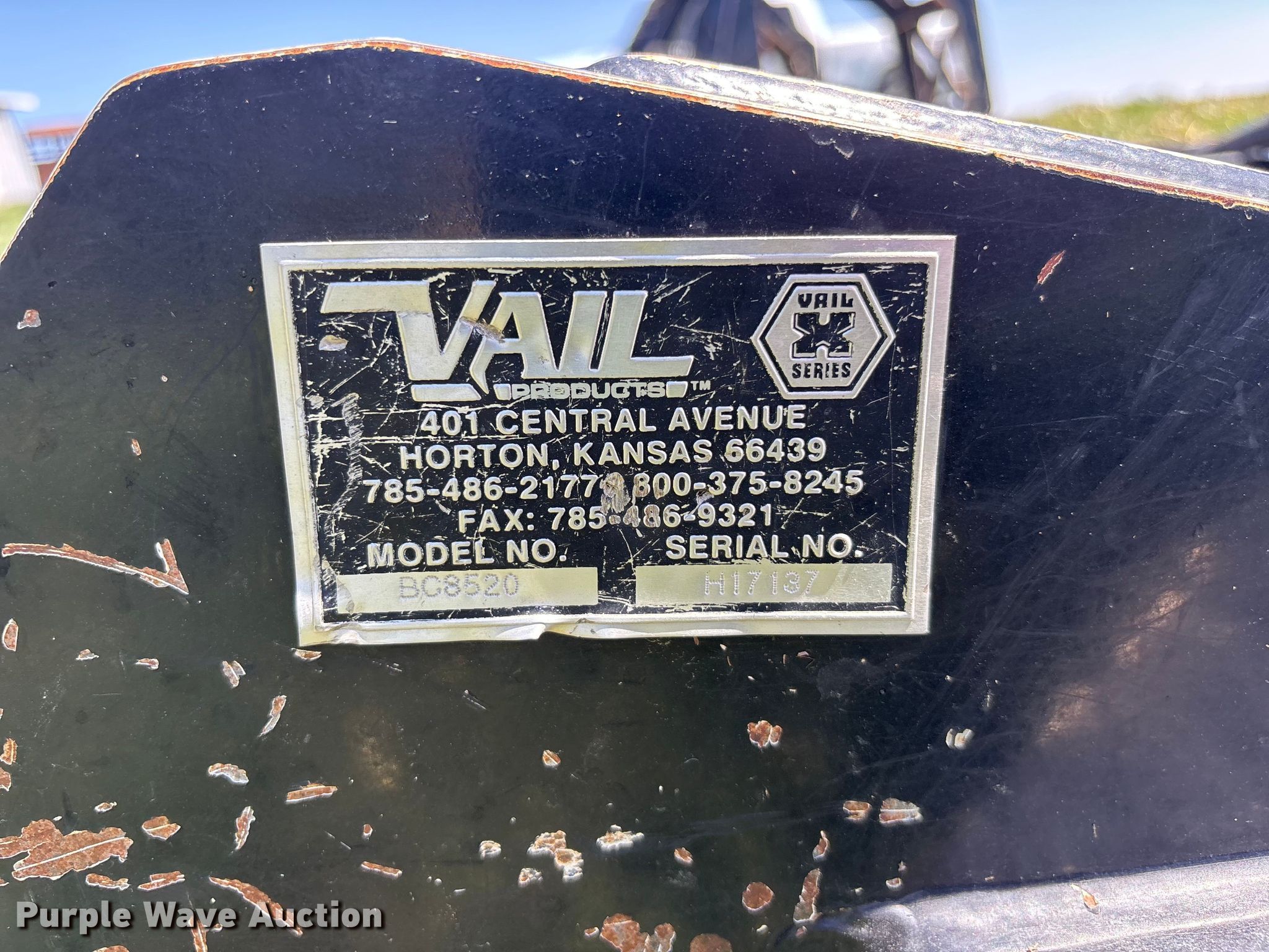 Purple Wave is selling a used Skid Steer Attach. in Kansas. This item is a Vail BC8520 skid steer brush mower with the following: Serial: H17137, Width: 80", High flow