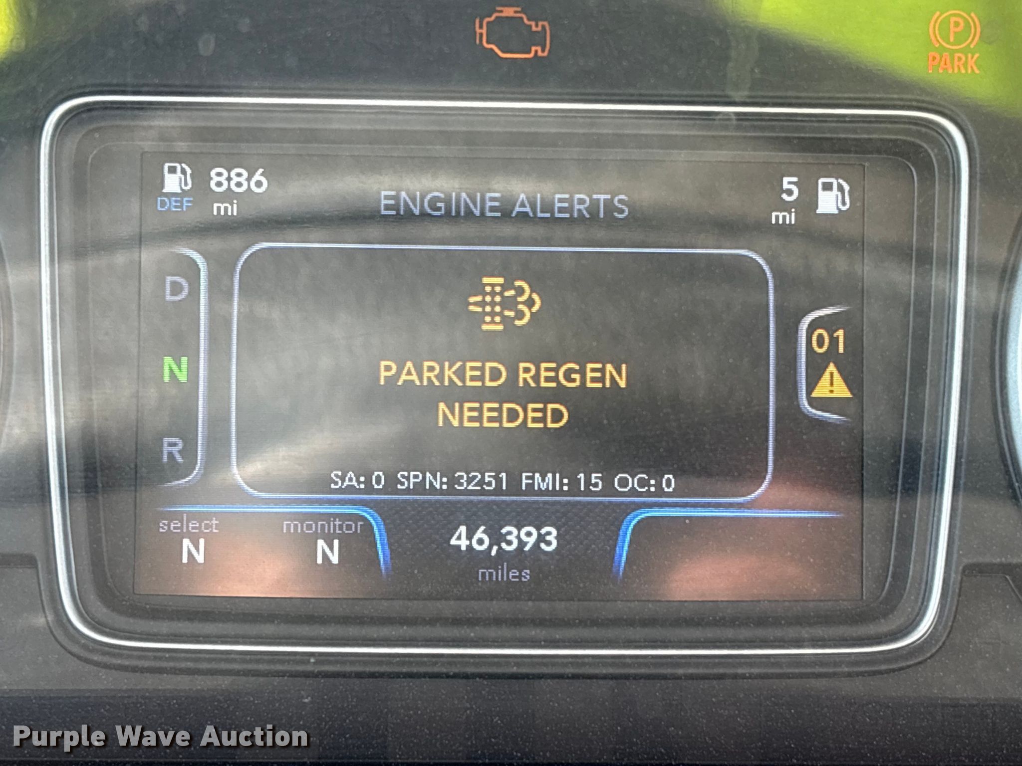 - Dash warning indicator: Check engine, Parked Regen Needed