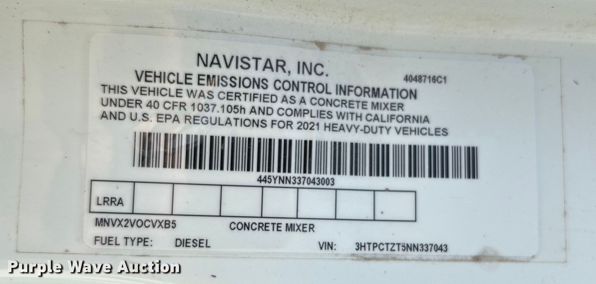 Purple Wave is selling a used Ready Mix or Pump Truck in Texas. This item is a 2022 International HX620 volumetric concrete mixer truck with the following: Miles: 46,393 on odometer, Hours: 901 on meter, VIN: 3HTPCTZT5NN337043