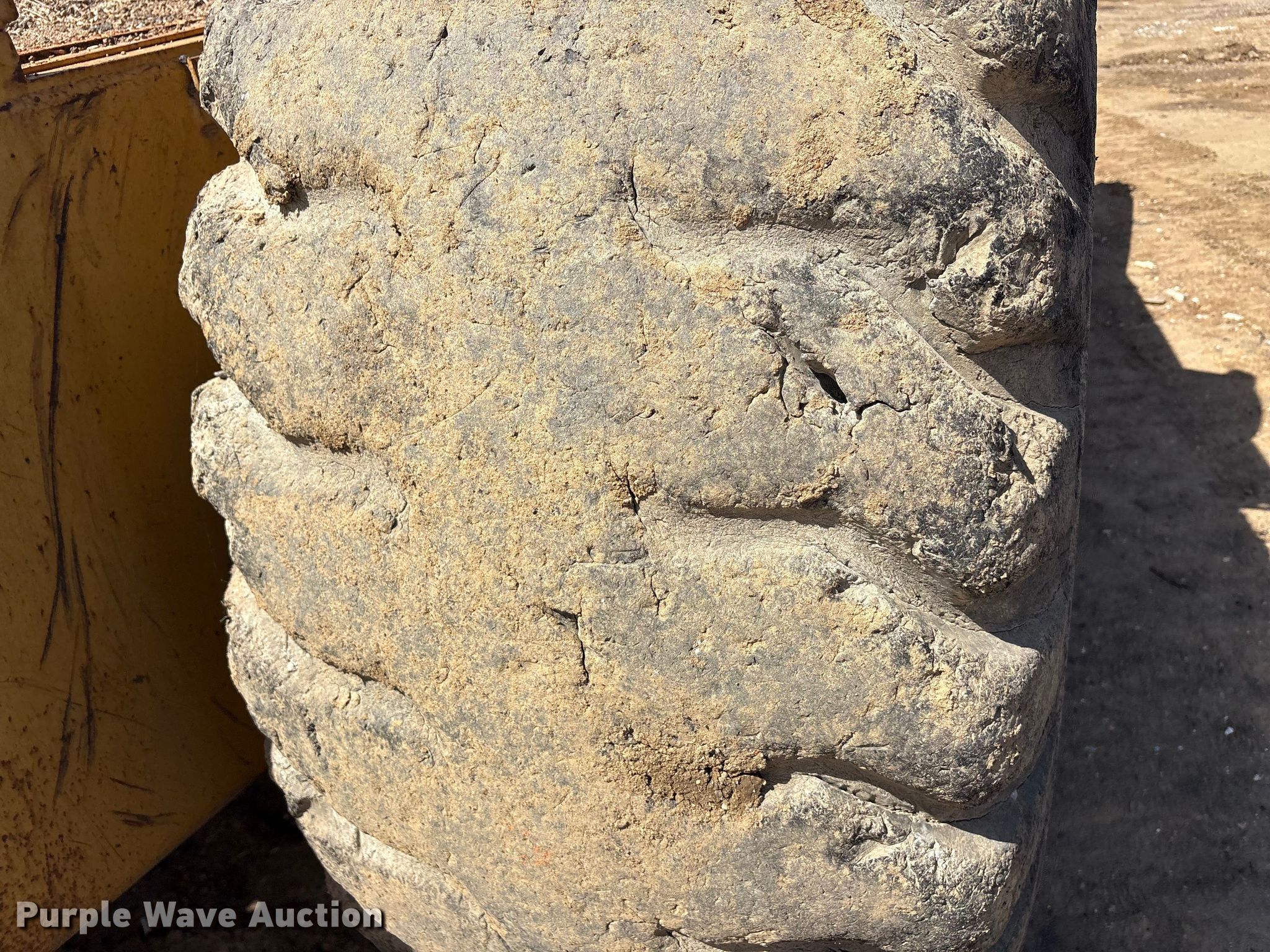 1991 Caterpillar 621E conventional scraper. Serial: 6AB01453. Engine Caterpillar, Fuel type: Diesel. Transmission Powershift, 8F - 1R. Chassis Brakes: Hydraulic. Operators station OROPS. Features Hydraulic lift, Scraper controls: Lever controls No. of controls: 3, Rear push block. Tires Size: 29.5-35, Brand: Firestone. Notes Batteries need replaced, Dead battery, Jump start required during on-site data collection. Precise Concrete Works. Memphis, TN 38106