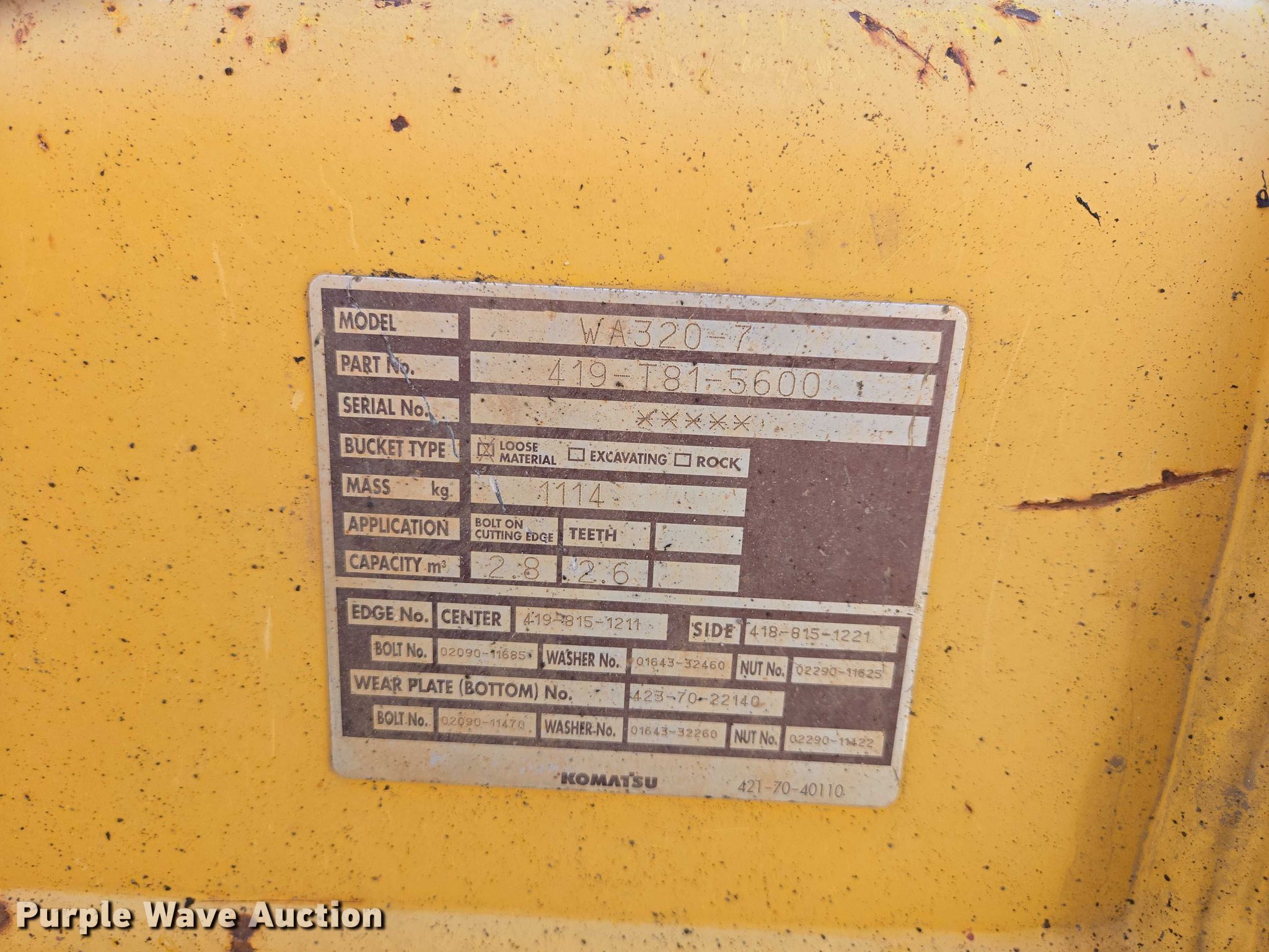 2014 Komatsu WA320-7 wheel loader. Hours: 9,997 on meter, Serial: 80185. Engine Komatsu, Serial: 26602400, Displacement: 6.7L, Cylinders: 6, Fuel type: Diesel, HP: 170, kW: 127. Transmission Powershift, 4F - 4R. Operators station Enclosed cab, AC, Heat, Bucket controls: Joystick. Features Bucket Komatsu WA320-7, Width: 106", Cutting edge: Bolt-on. Tires Size: 20.5R25. LEi. Rapid City, SD 57701