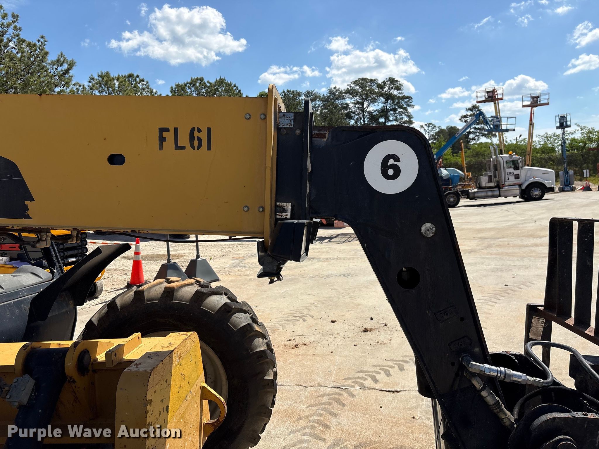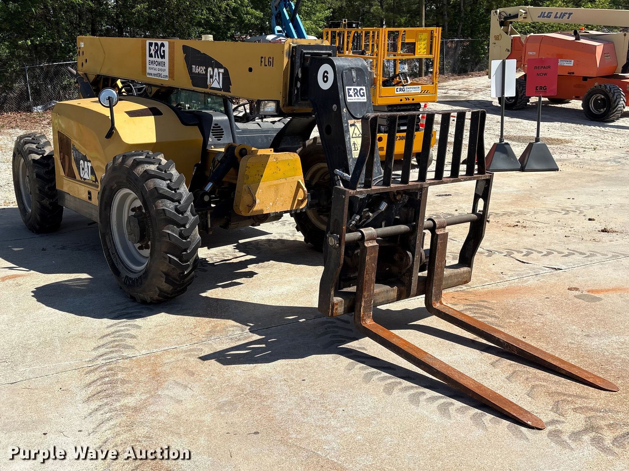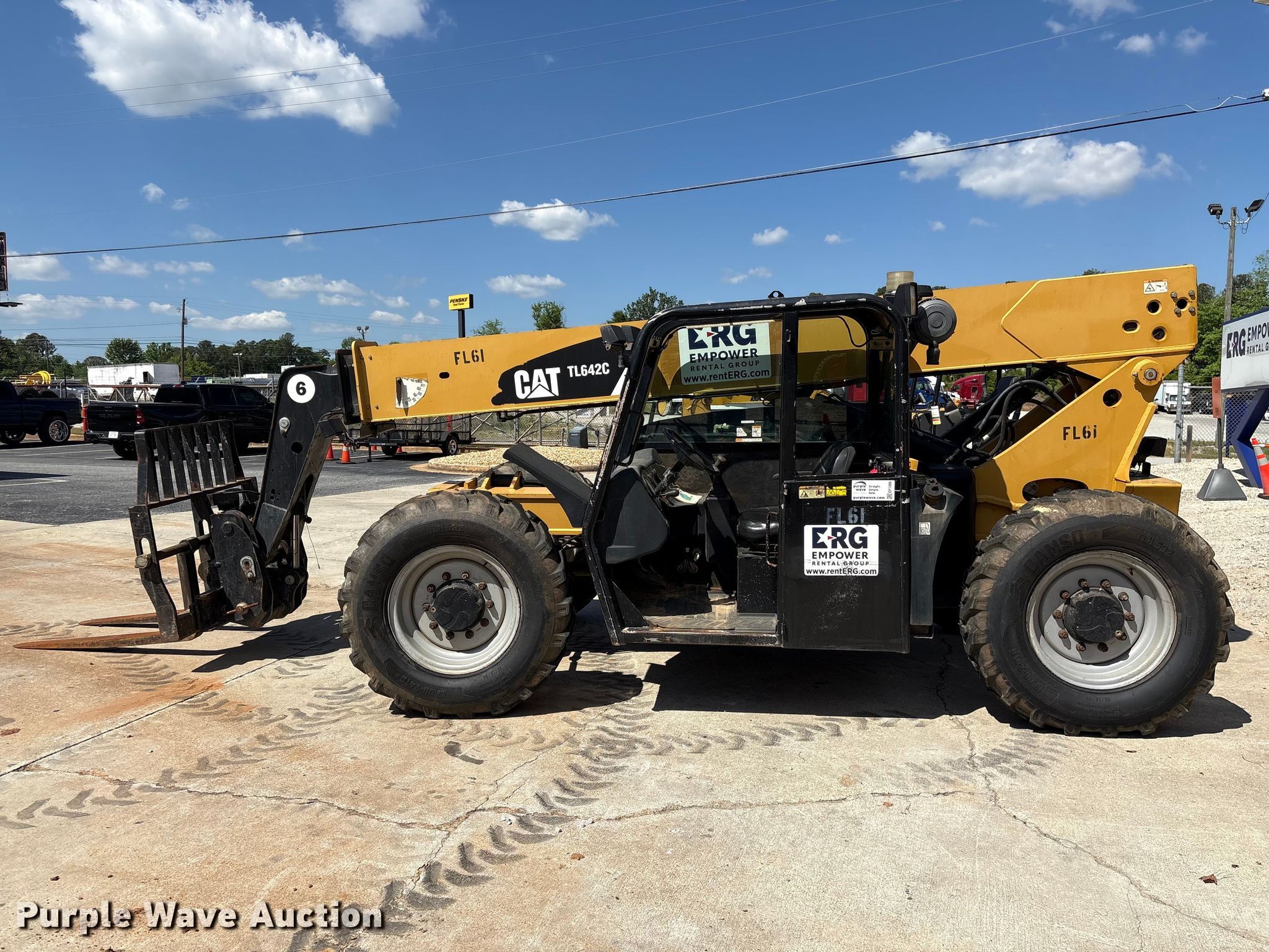 Purple Wave is selling a used Telehandler in Georgia. This item is a 2013 Caterpillar TL642C telehandler with the following: Hours: Unknown, Serial: THG00352, Unit #: FL61