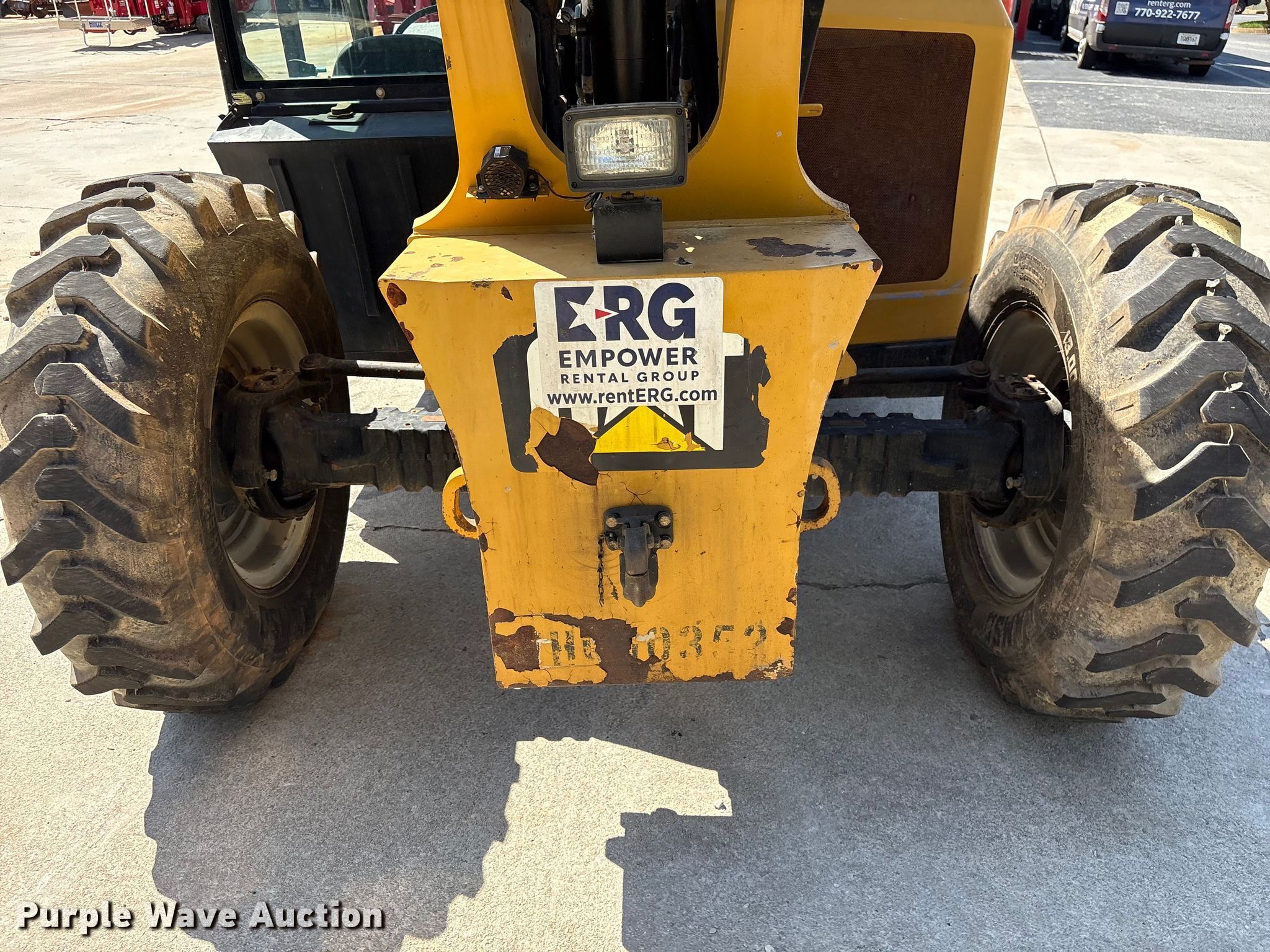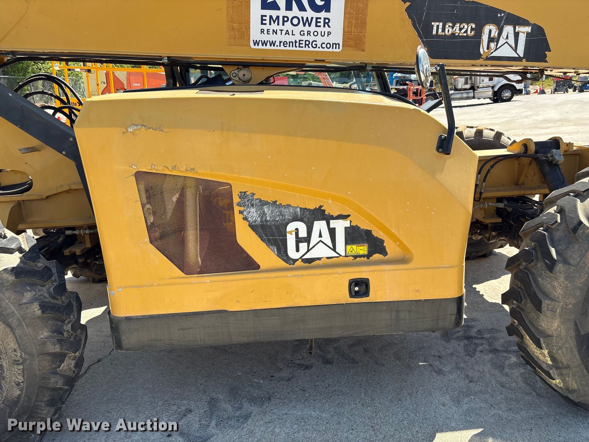 2013 Caterpillar TL642C telehandler. Hours: Unknown, Serial: THG00352, Unit #: FL61. Engine Caterpillar 3706/2200, Displacement: 3.4L, Cylinders: 4, Fuel type: Diesel. Transmission Powershift, Four wheel drive, Differential lock. Operators station OROPS, Steering: Crab, Four wheel. Features Maximum lift capacity: 6,600 lbs, Maximum lift height: 42', Boom stages: 3, Fork length: 42", Auxiliary hydraulics, Tilt carriage, Hydraulic leveling, Quick attach: Manual. Tires Size: 13.00-24GT. Notes Non-operational hour meter. Empower Rental Group. Conyers, GA 30012