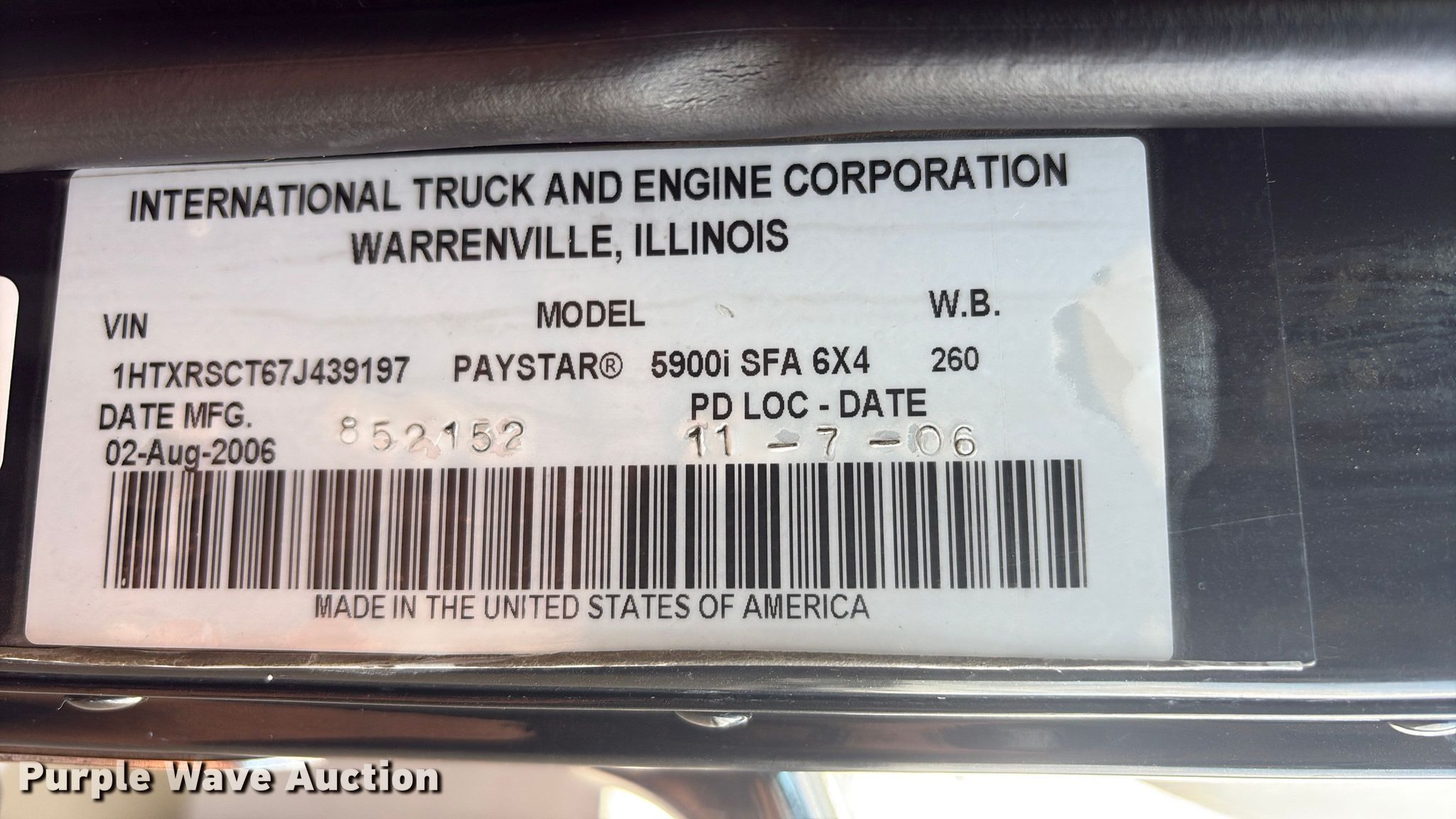 2007 International 5900i water truck. Miles: 600,133 on odometer, VIN: 1HTXRSCT67J439197. Engine Caterpillar C-15 ACERT, Displacement: 15.2L, Cylinders: 6, Fuel type: Diesel. Transmission Eaton Fuller, Manual, Speed: 18. Chassis Axles: Tandem, Pusher axle, Differential lock: Inter-axle, Suspension: Spring over walking beam, Brakes: Air, PTO. Interior Power windows, Power locks, Cruise control, Auxiliary controls. Features Bed Tank bed, Serial: MMN7466, Length: 21' 2", Width: 96", Capacity: 6,000 gallons, Side discharge, Top fill, Sight tube. Tires Front: 385/65R22.5, Rear: 11R24.5, Lift axle: 385/65R22.5. Oklahoma title. Seller is an Oklahoma licensed motor vehicle dealer. Buyers may be required to provide identification to the licensed dealer to comply with state laws. Title will be assigned and distributed by the dealer. Please contact the seller for distribution questions. Title distribution may be delayed up to 30 days from verification of funds. Collinsville, OK 74021
