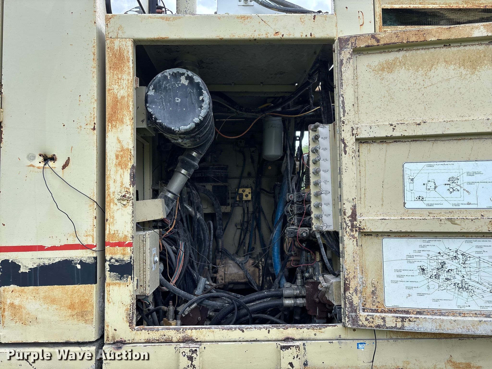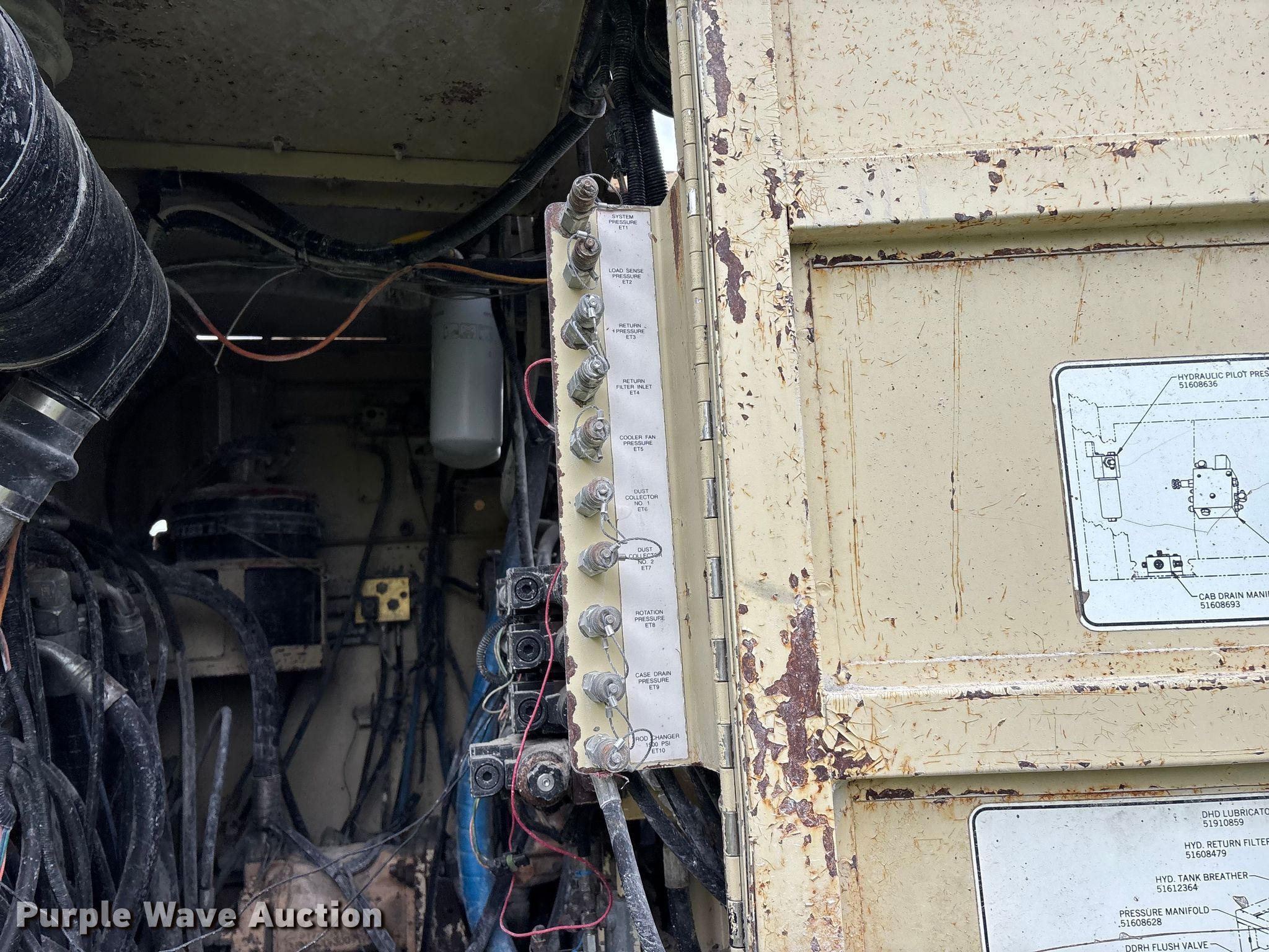 1996 Ingersoll Rand CM695D drilling rig. Hours: 10,565 on meter, Actual hours unknown, Serial: R18017AD. Engine Cylinders: 6, Fuel type: Diesel. Transmission Hydrostatic. Interior AC, Heat. Features Down hole hammer drill, Dust collector system, Water suppression system. Tracks Width: 14", Steel. Notes Rear doors will be installed prior to auction close, Door latch issues, Glass cracked, Dust collector hoses need replaced, Drill stems not included, Warning indicator: High hydraulic oil temp, Oil leak, Engine shut off issues, must be shut off at fuel solenoid. Sams Drilling Service Inc. Seligman, MO 65745