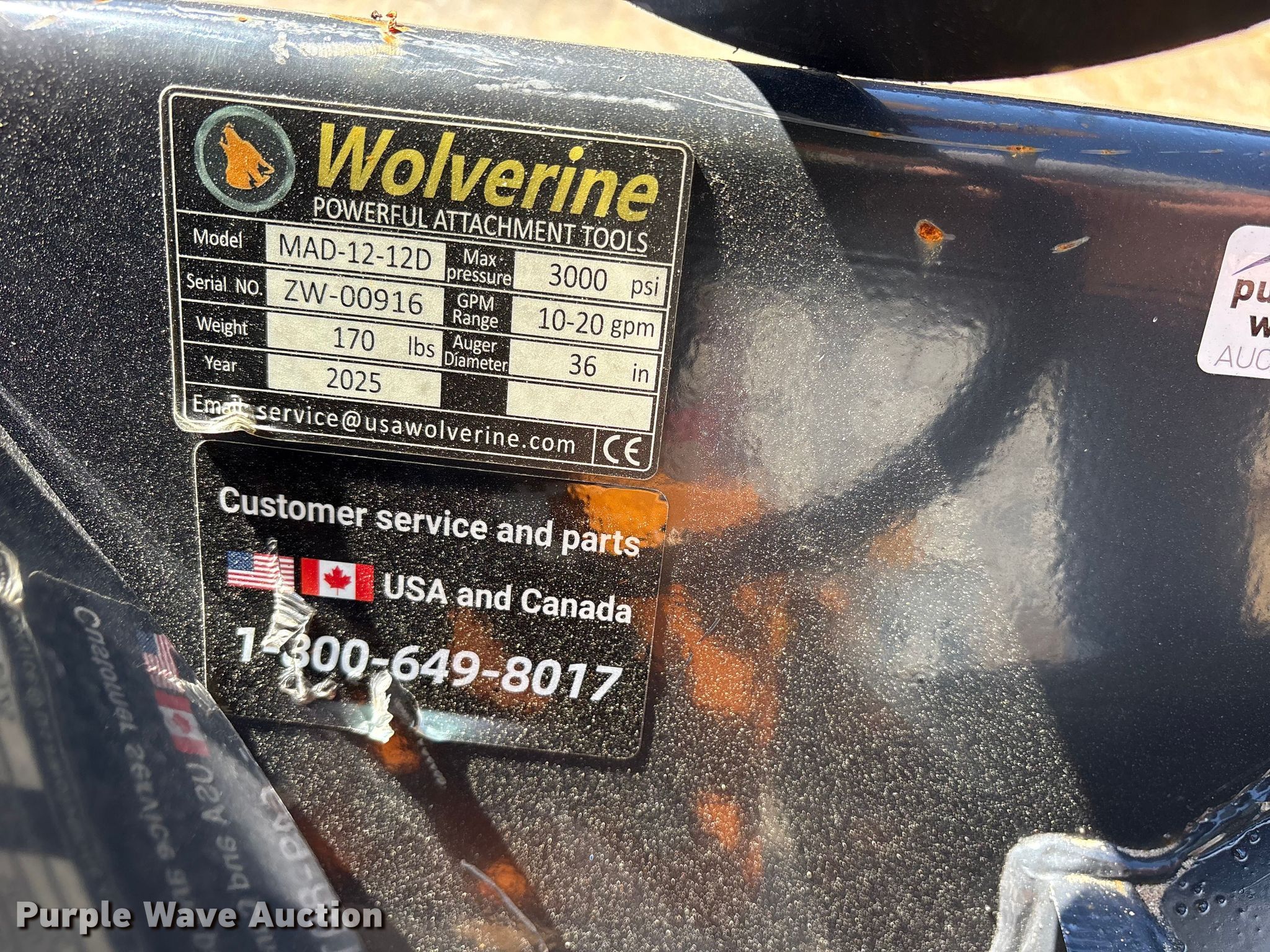 Purple Wave is selling a used Skid Steer Attach. in Texas. This item is a 2025 Wolverine MAD-12-12D compact utility loader auger with the following: Serial: ZW-00916, Bit diameter: 12"