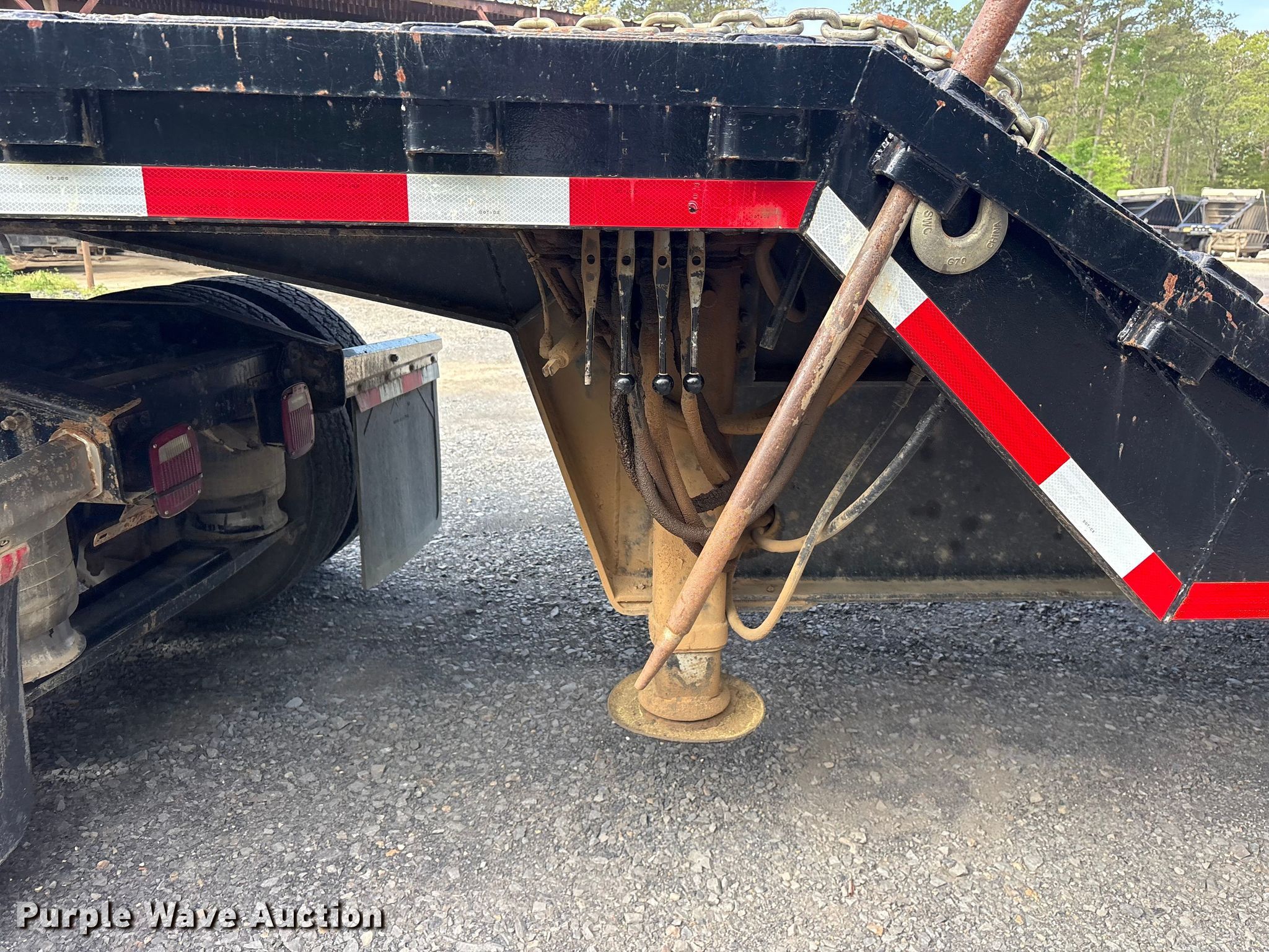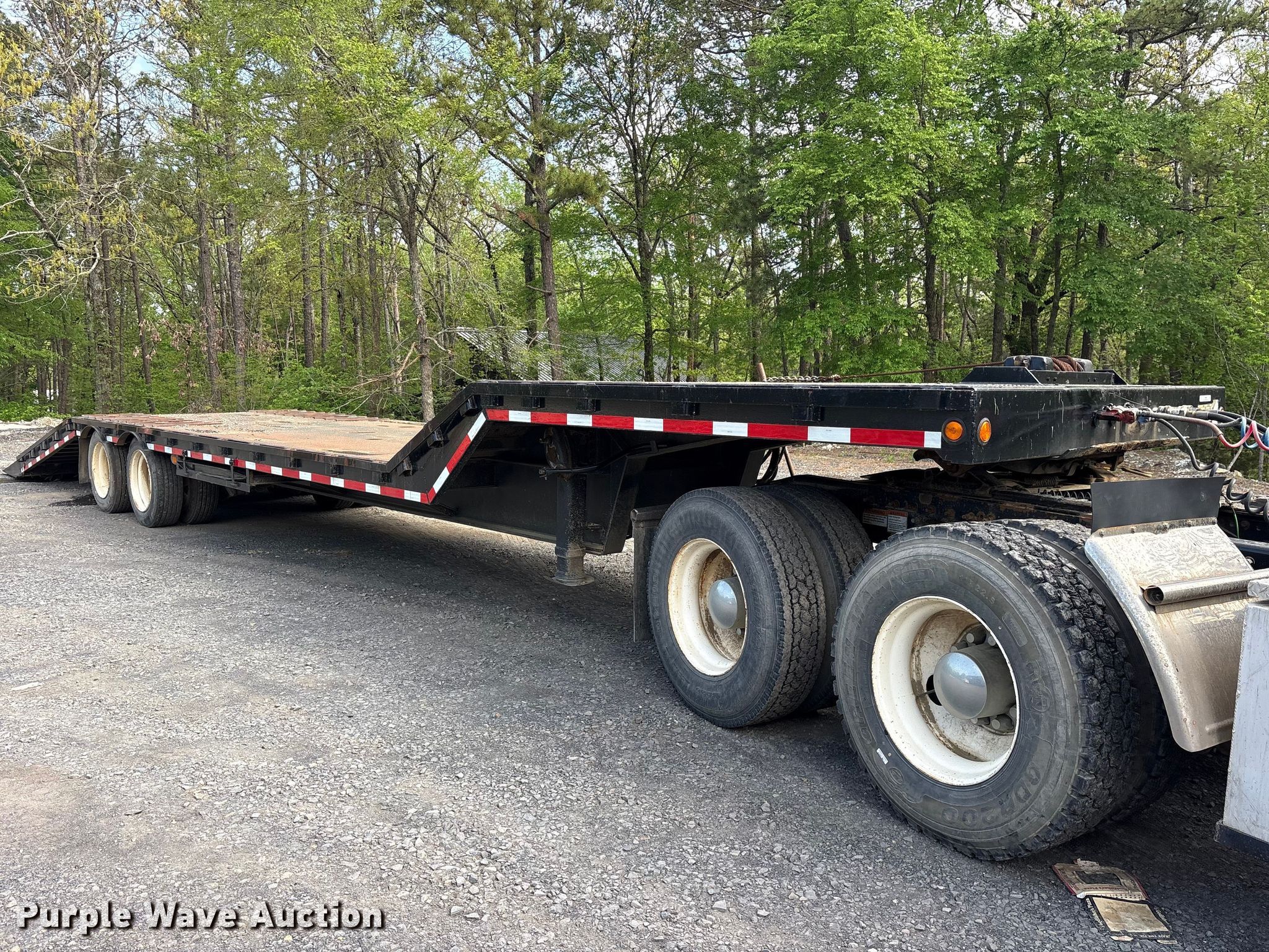 1997 Ledwell HT43102 hydraulic tail equipment trailer. VIN: 1L9GB72A5VL033552. Dimensions Overall Length: 43', Width: 8' 5", Deck Length: 22', Width: 8' 1", Top deck length: 9', Deck height: 39", Hydraulic tail length: 9'. Features Deck type: Steel, Winch, Hydraulic controls: Manual. Chassis Landing gear: Dual, Suspension: Spring, Brakes: Air, Axles: Tandem, GVWR: 70,000 lbs, GAWR: 20,280 lbs. Tires Steel wheels, Size: 255/70R22.5. Notes Unit still in use, Truck not included. Oklahoma title. Title distribution may be delayed up to 14 days from verification of funds. Broken Bow, OK 74728