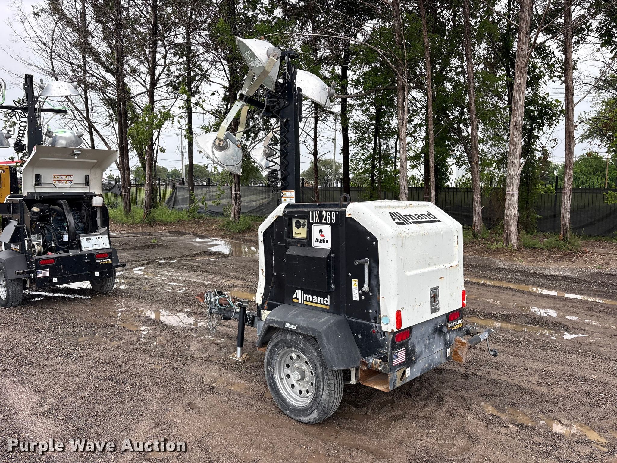 2019 Allmand Nite-Lite V-Series light plant. Hours: 10,290 on meter, VIN: 5AEA1DA18KH002758, Unit #: LIX269. Engine Kubota D1005-BG-EF02, Displacement: 1.0L, Cylinders: 3, Fuel type: Diesel, kW: 19. Features Generator Pancake 201CSA5420, kVA: 8, kW: 8, Phase: Single, Electric start, Fuel tank, Light plant Bulbs: 4, Watts: 350, Tower height: 25', Hoist: Manual, Stabilizers. Trailer 2019 Allmand, 9' L x 60" W, Ball hitch size: 2", Suspension: Spring, Axles: Single, Tire size: ST175/80R13, GVWR: 2,200 lbs. This is worksite support equipment and will not come with a title. Transfer of ownership documentation will be a bill of sale. Austin Commercial. Dallas, TX 75236