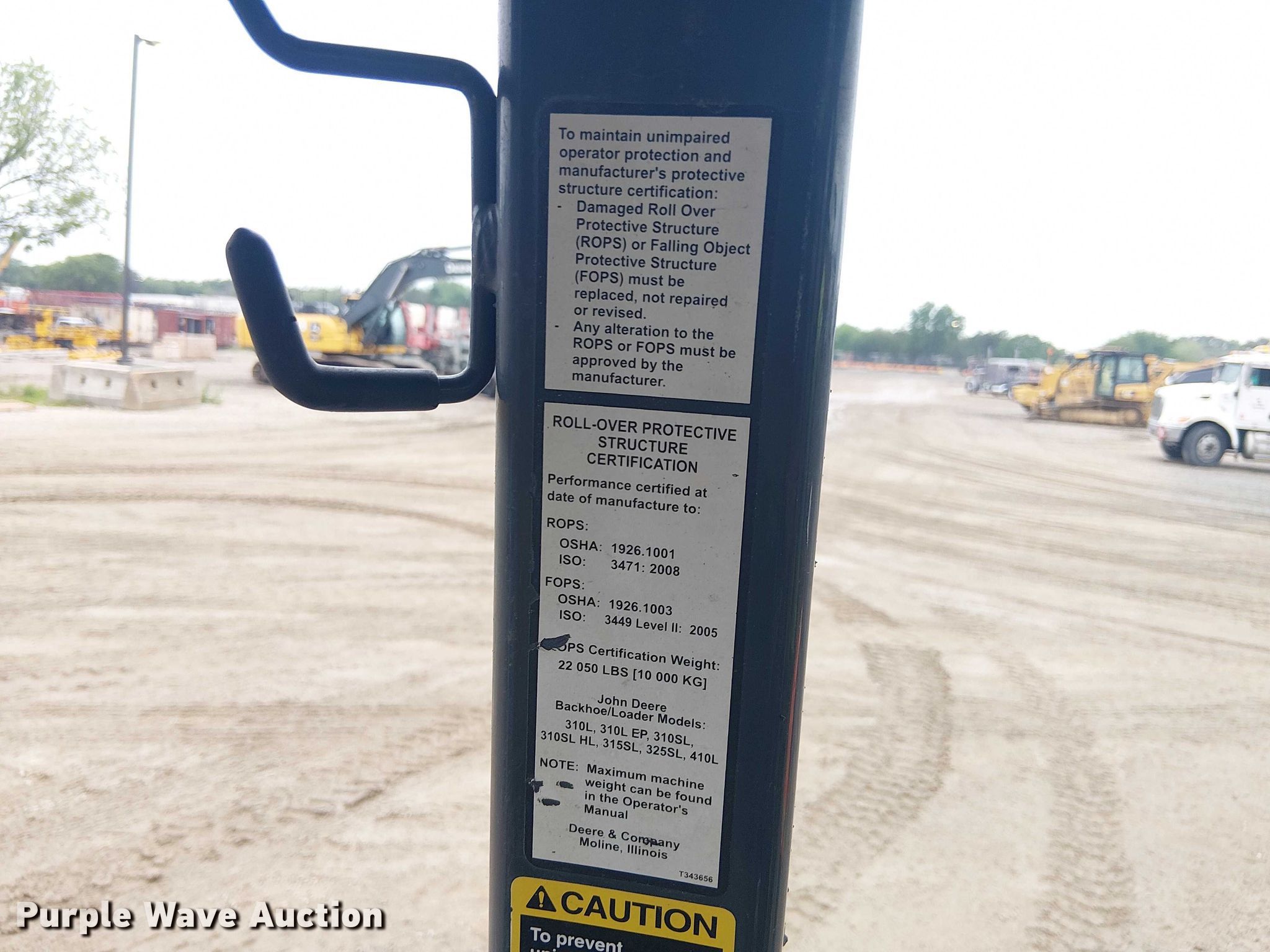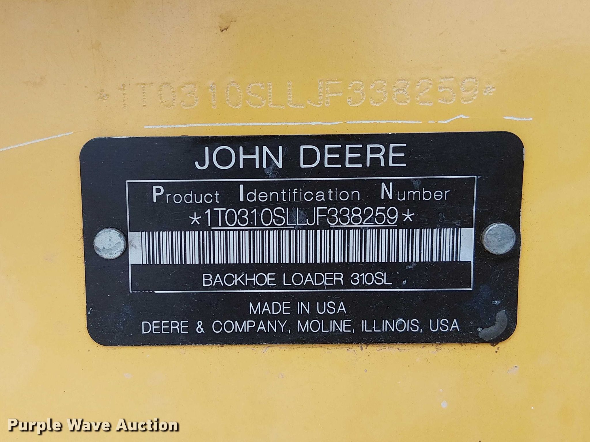 2018 John Deere 310SL backhoe. Hours: 7,674 on meter, Serial: 1T0310SLLJF338259, Unit #: TLX1125. Engine John Deere 4045HT096, Serial: R564401, Displacement: 4.5L, Cylinders: 4, Fuel type: Diesel. Transmission Powershift, 4F - 3R. Chassis Four wheel drive. Operators station OROPS, Backhoe controls: Pilot control, Pattern changer. Features Loader Quick coupler: Hydraulic, Auxiliary hydraulics, Bucket John Deere AT308966, Bucket leveler, Capacity: 131 cu.yd., Width: 90", Cutting edge: Bolt-on, Backhoe Quick coupler: Manual, Bucket Width: 21", Teeth: 5.. Tires Size: 15.5L24. Austin Bridge & Road. Dallas, TX 75236