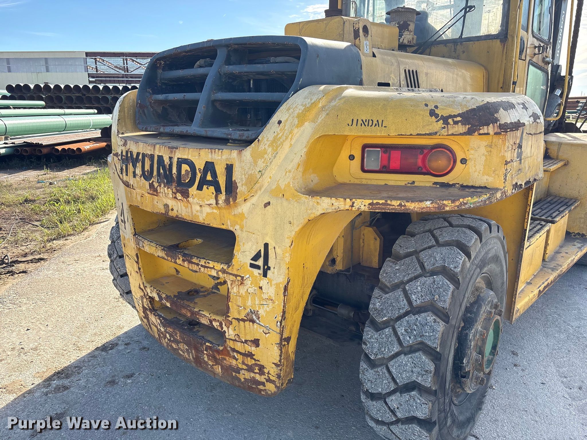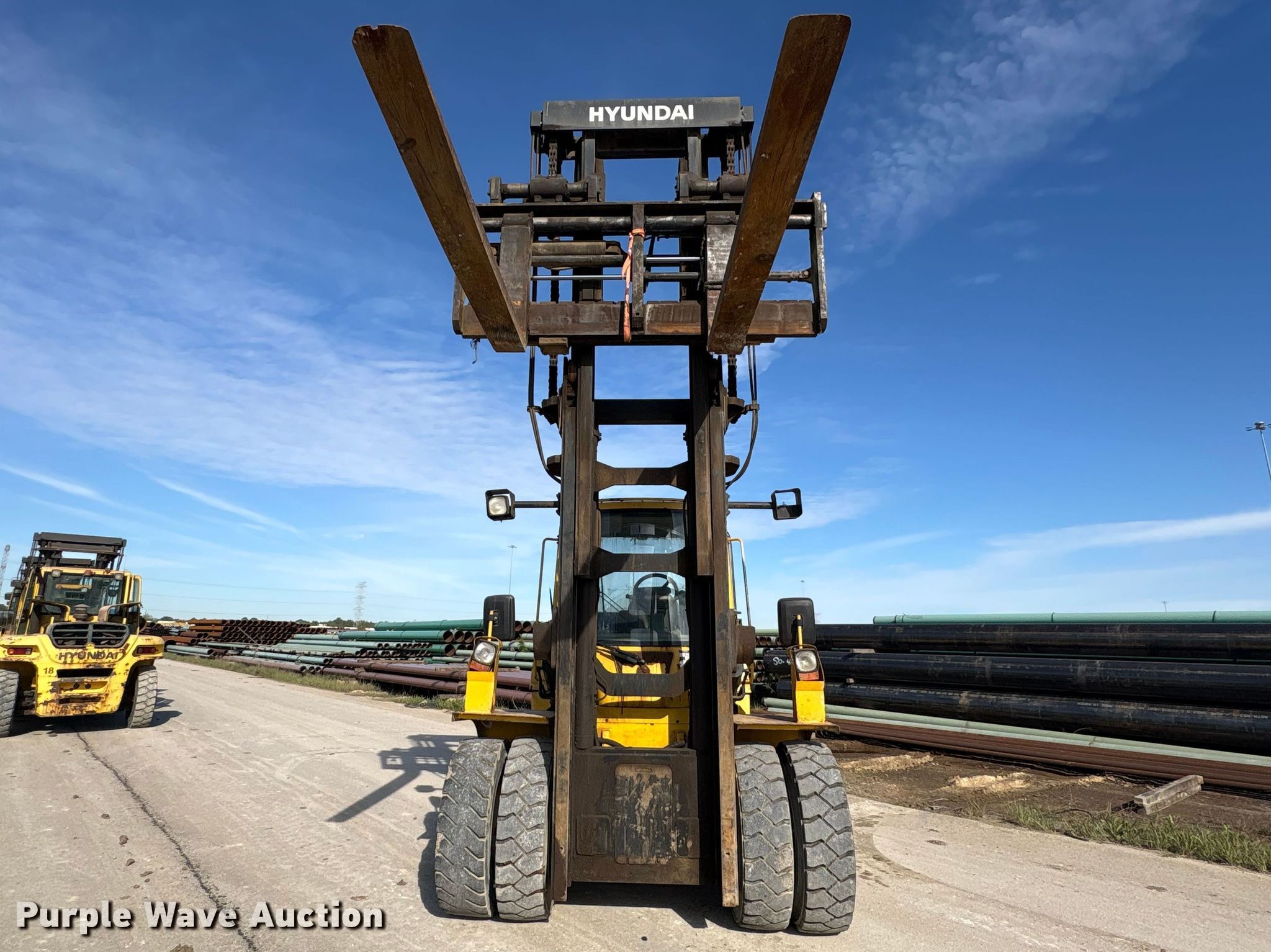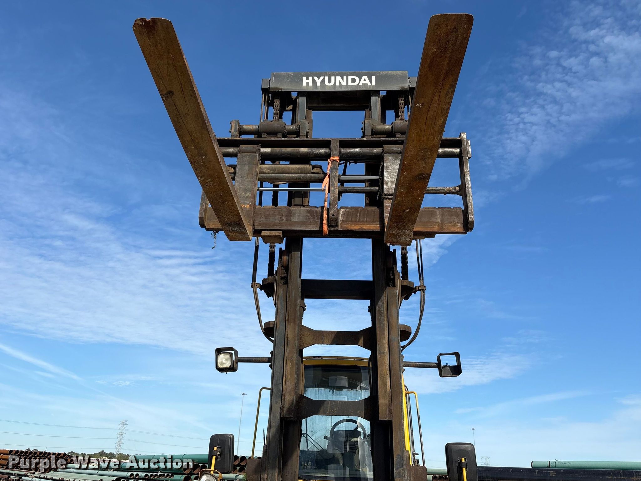 Hyundai 160D-7E forklift. Serial: HHIHFT08VB0000469. Engine Cummins QSB6.7, Serial: 73304715, Displacement: 6.7, Cylinders: 6, Fuel type: Diesel. Transmission Powershift, 3F - 3R. Operators station Enclosed cab, AC, Heat. Features Maximum lift height: 157", Collapsed mast height: 148", Mast stages: 2, Fork length: 90". Tires Size: 12.00-20. Notes Glass cracked, Non-operational cluster, Hydraulic issues, Non-operational HVAC. Jindal Saw USA, LLC. Baytown, TX 77523