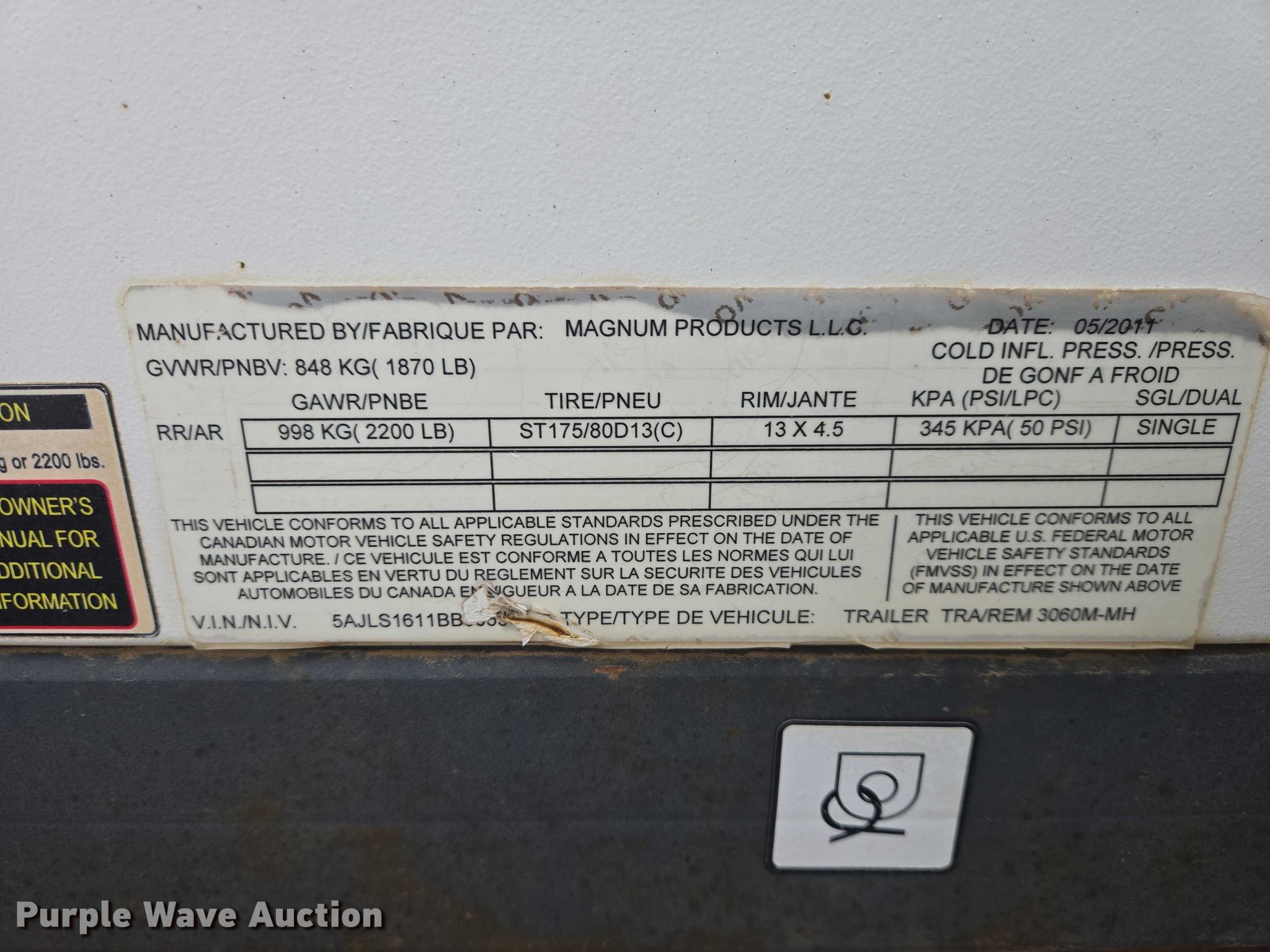 2011 Magnum MLT3060M light plant. Hours: 4,128 on meter, Serial: 1105311. Engine Mitsubishi L3E, Displacement: 1.0L, Cylinders: 3, Fuel type: Diesel. Features Generator kVA: 6, kW: 6, Phase: Single, Electric start, Fuel tank, Light plant Bulbs: 4, Watts: 1,500, Hoist: Manual, Stabilizers. Trailer Ball hitch size: 2", Suspension: Spring, Axles: Single, Tire size: 175/80D13. Notes Light damaged. This is worksite support equipment and will not come with a title. Transfer of ownership documentation will be a bill of sale. Elite Enterprises, LLC. Watford City, ND 58854