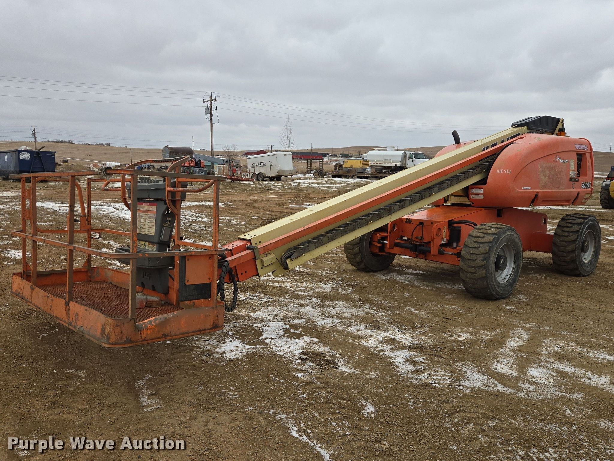 2008 JLG 600S boom lift. Hours: 5,559 on meter, Serial: 0300128841. Engine Deutz, Cylinders: 4, Fuel type: Diesel. Features Rough terrain, Boom type: Telescopic, Maximum lift capacity: 1,000 lbs, Maximum reach length: 49', Maximum lift height: 60', Platform: 96" L x 36" W, AC power outlet, Air outlet, Controls: Platform, Ground. Tires Tire size: 15-19.5, Foam filled. Elite Enterprises, LLC. Watford City, ND 58854