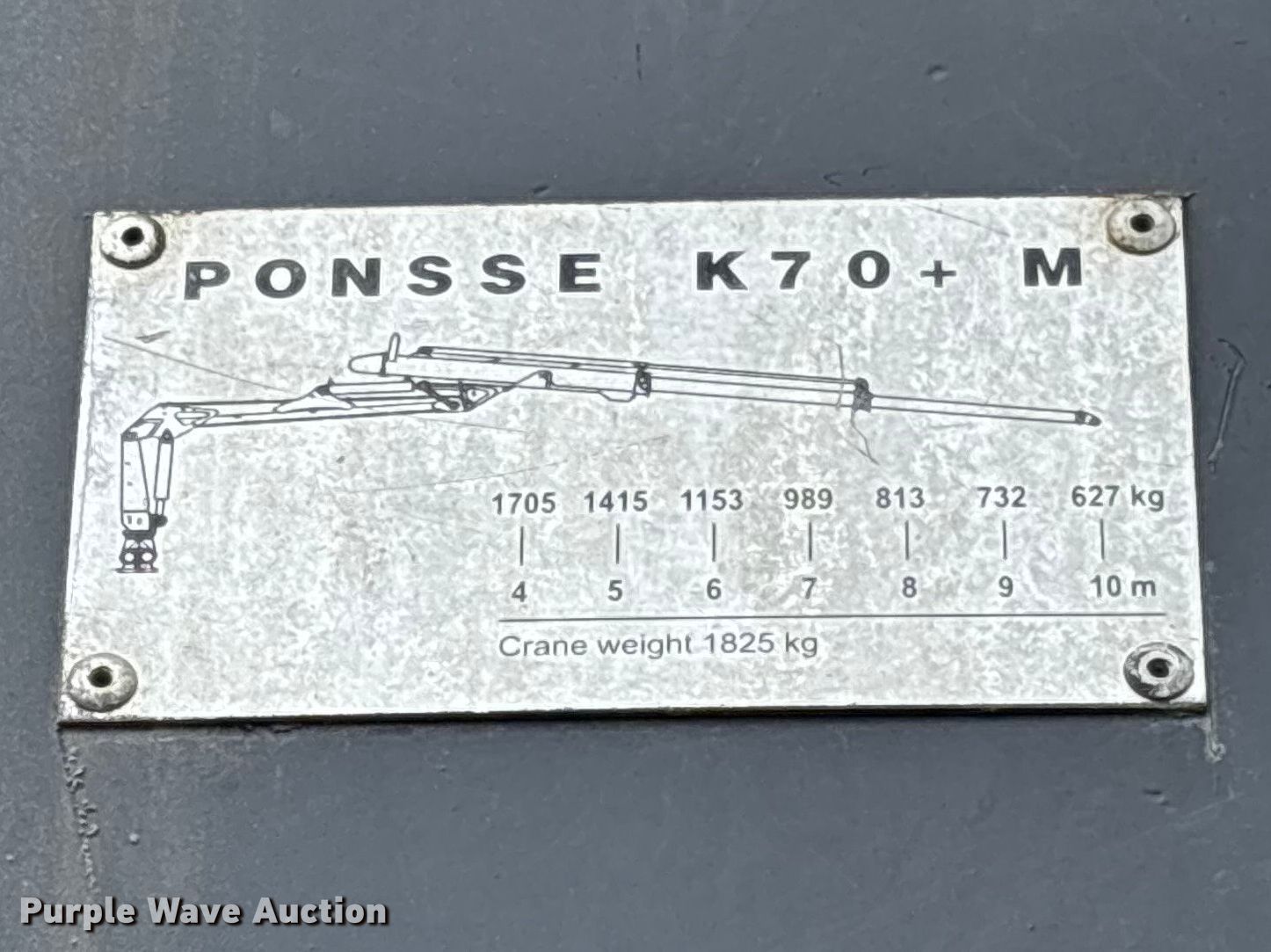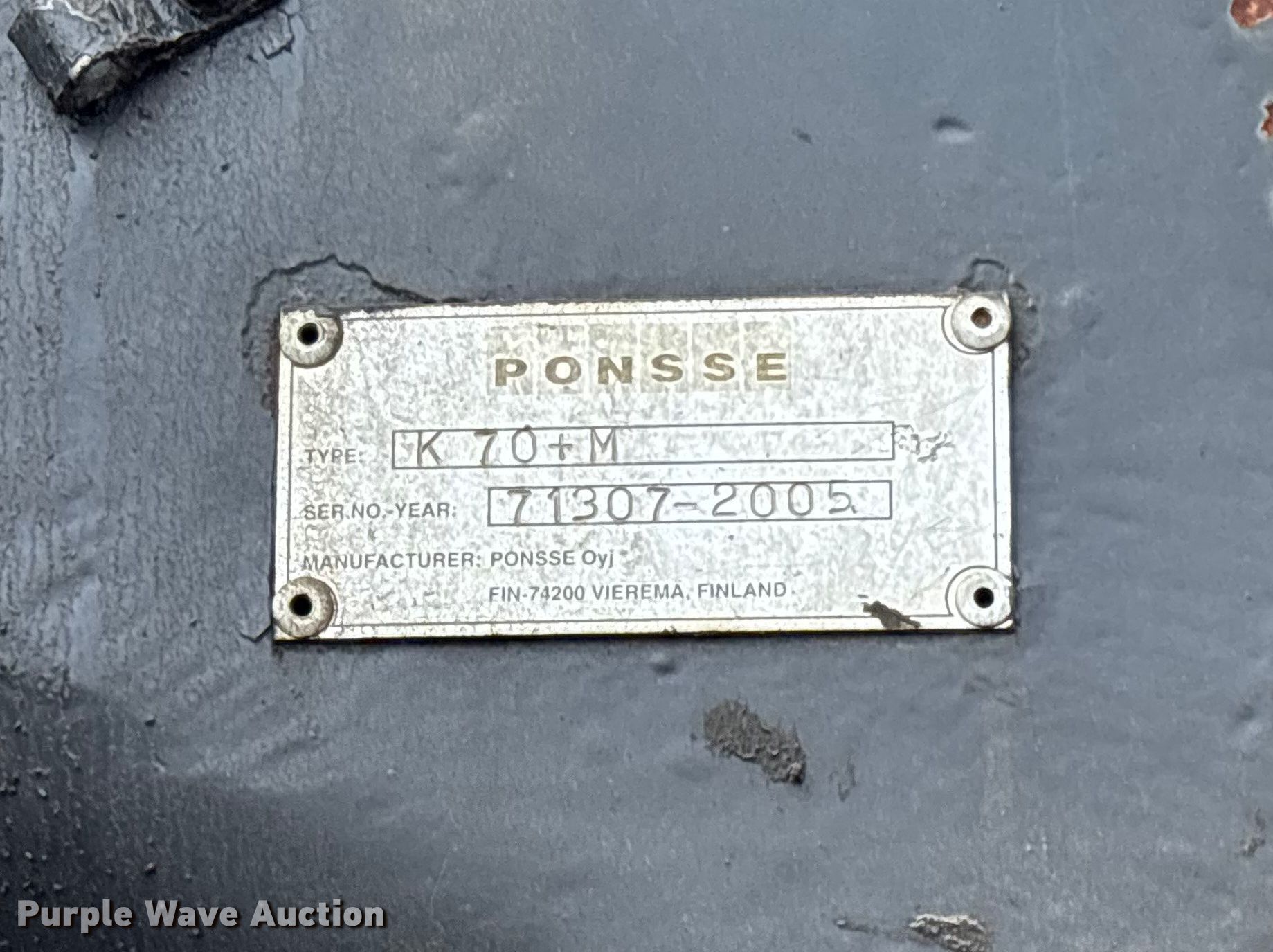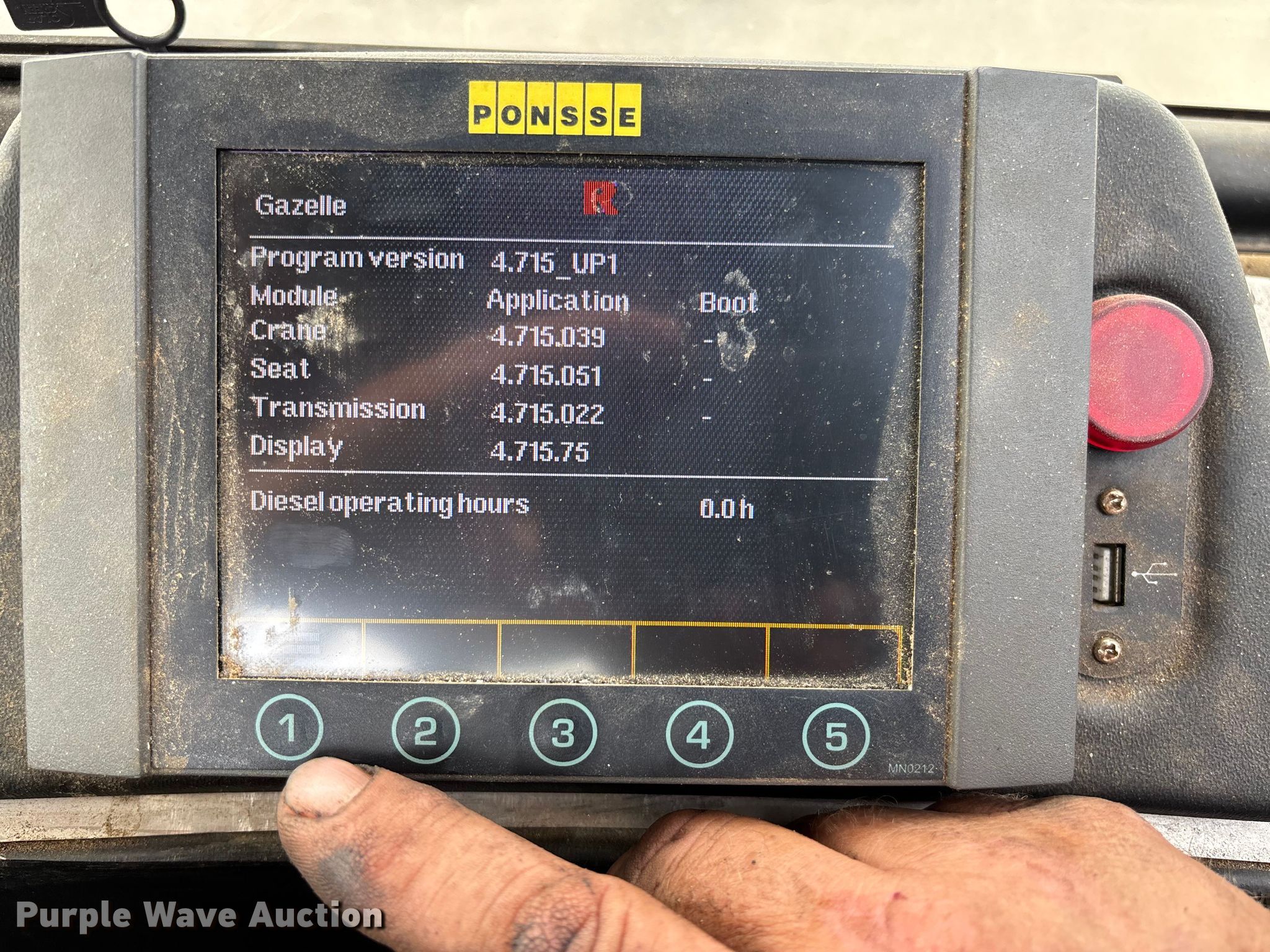 2004 Ponsse Gazelle forwarder. Hours: 19,835 on meter, Serial: 0110002. Engine Cylinders: 6, Fuel type: Diesel. Transmission Hydrostatic. Chassis Eight wheel drive. Features 2005 Ponsse K70+M crane, Serial: 71307, Rotating grapple. Tires Size: 710/40-22.5. Notes Crane boom hydraulic hose leak, Dash warning indicators: Accumulator voltage, Brake circuit pressure. Hamilton, MO 64644