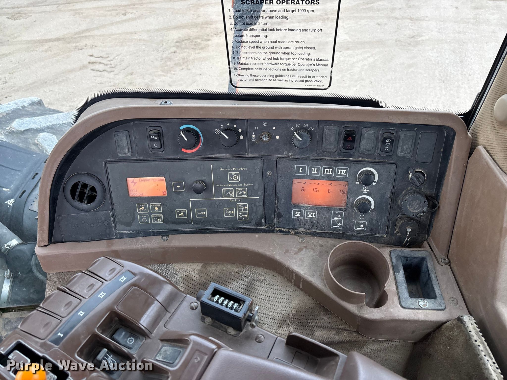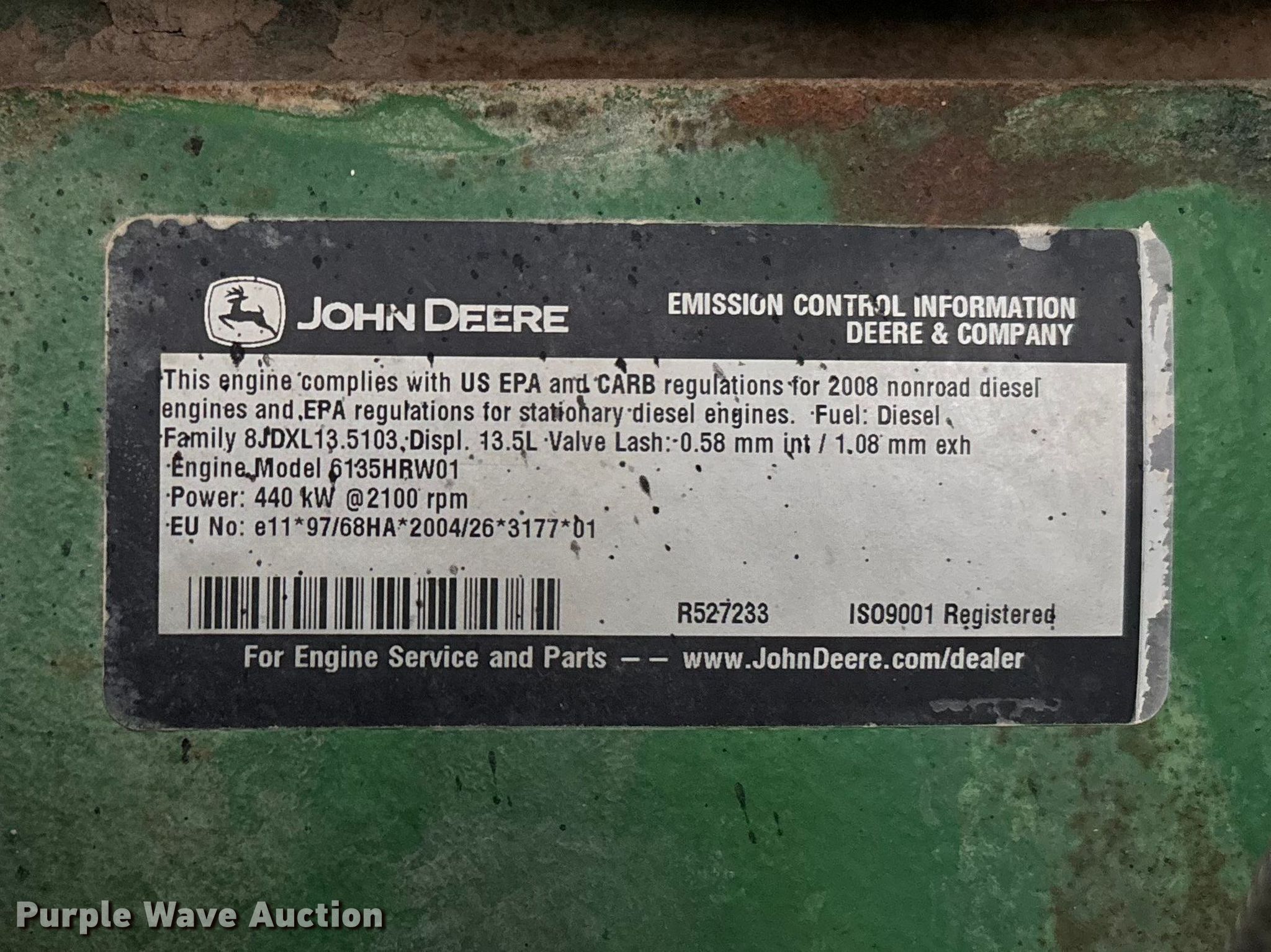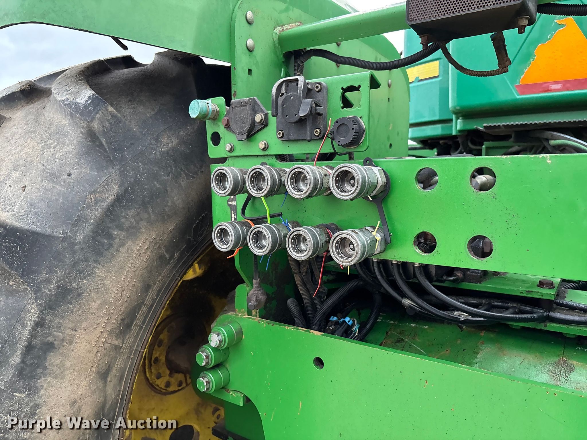 2008 John Deere 9630 Scraper Special 4WD tractor. Hours: 9,027 on meter, Serial: RW9630E004672. Engine John Deere 6135HRW01, Displacement: 13.5L, Cylinders: 6, Fuel type: Diesel. Transmission Powershift, 18F - 6R, Differential lock. Operators station AC, Heat. Features Seven pin outlet, ISOBUS outlet, Hydraulic remote sets Rear: 4, Suitcase weights: 22. Tires Front: 710/70R42, Wheel weights: 6, Wheelbase: 135", Duals. Notes Warning indicator: Engine system, Fan Speed Low, Fan System. Palmyra, MO 63461