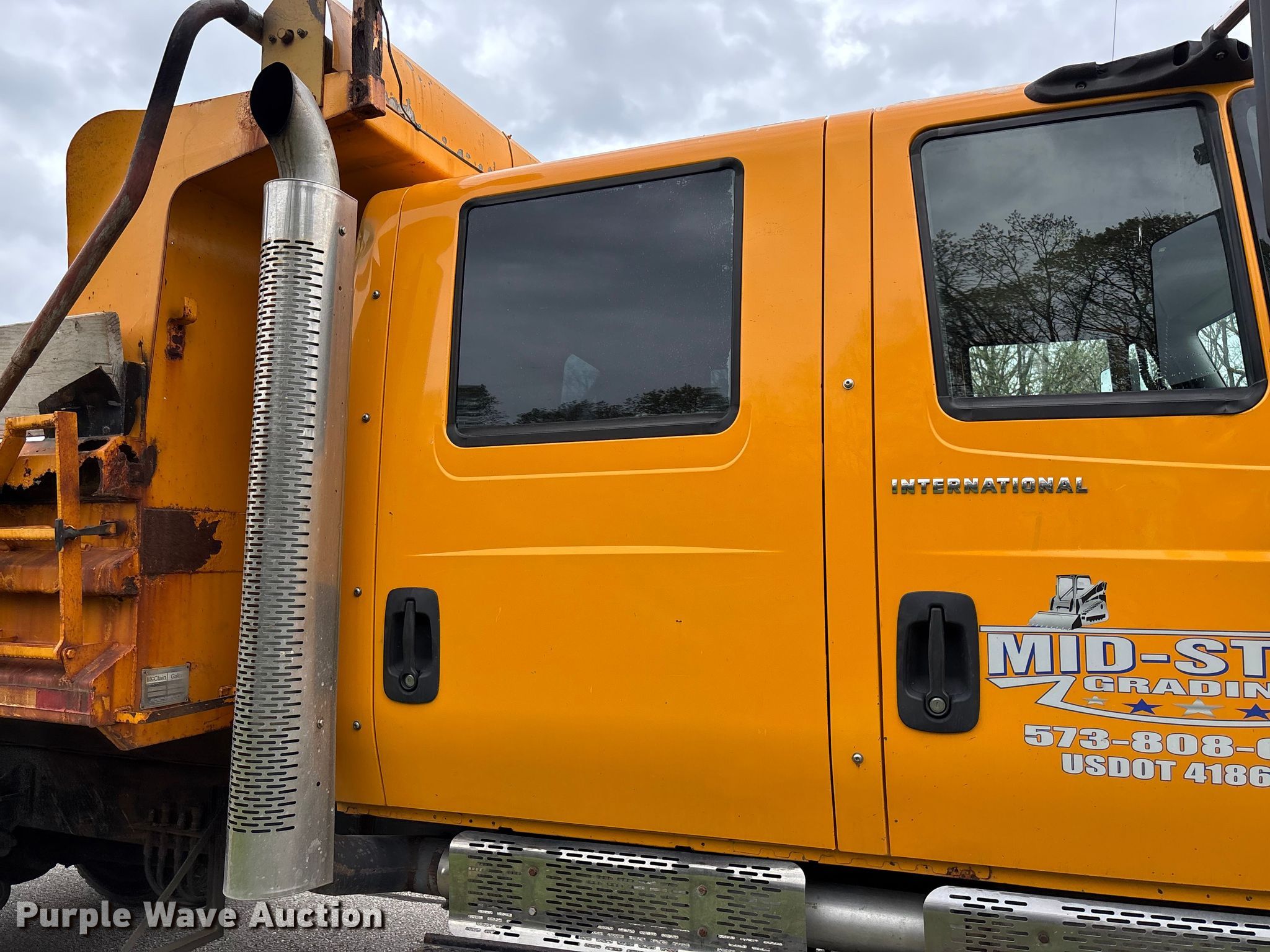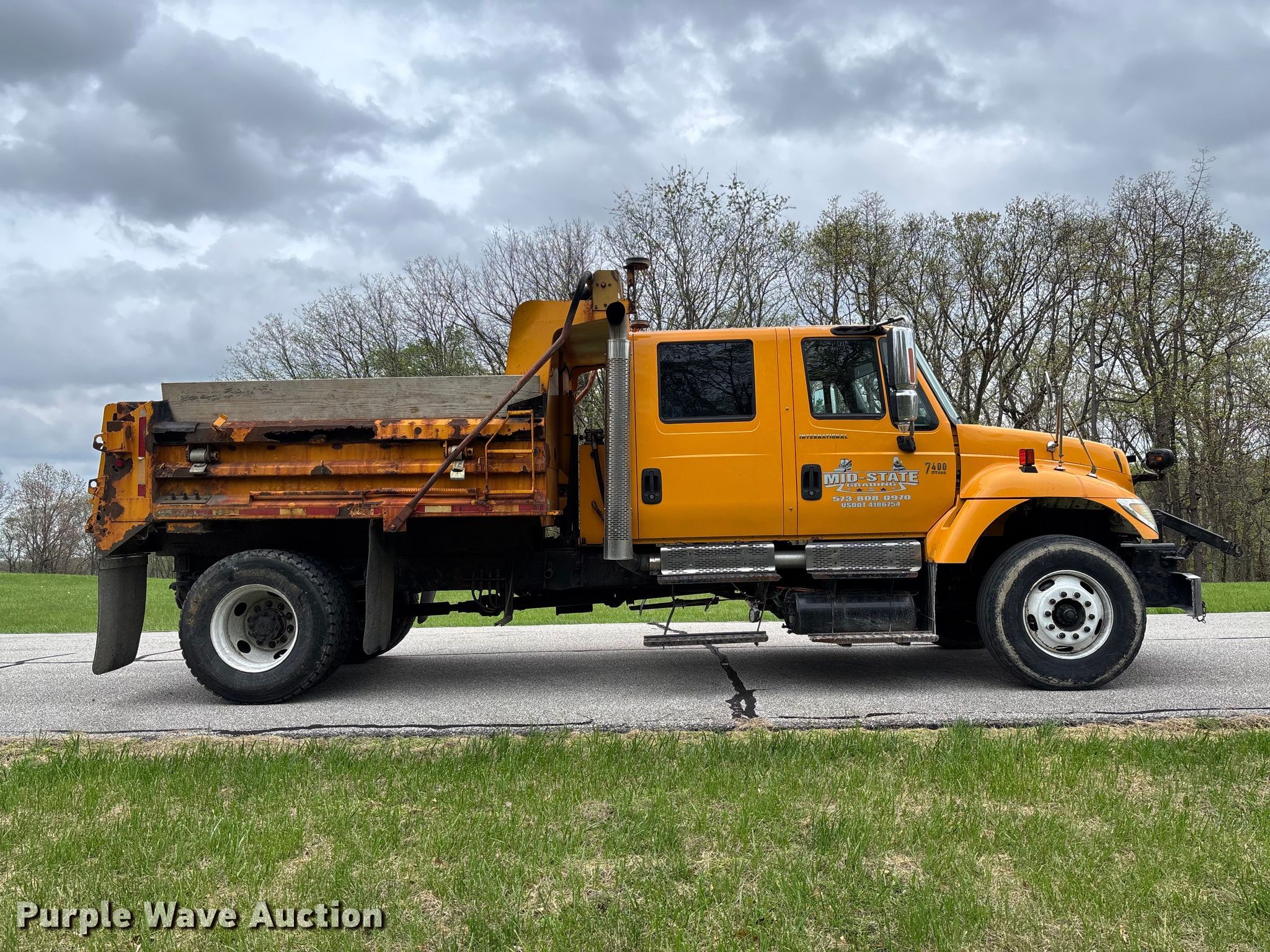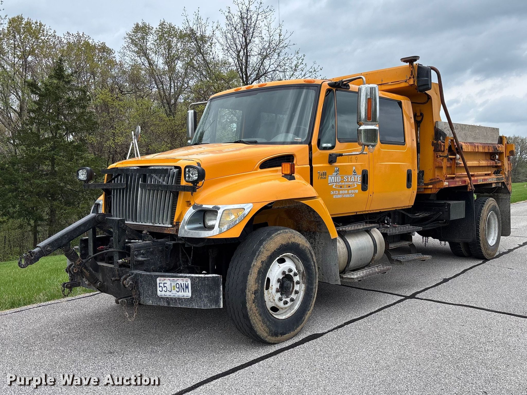 2005 International 7400 Crew Cab dump truck. Miles: 211,828 on odometer, Hours: 14,276 on meter, VIN: 1HTWDAAR05J179985. Engine International DT466, Displacement: 7.6L, Cylinders: 6, Fuel type: Diesel. Transmission Allison, Automatic. Chassis Axles: Single, Suspension: Spring, Brakes: Air, Front mount PTO, Wheelbase: 216". Interior AC, Heat, Heated mirrors, Power windows, Cruise control, Brake controller. Features Bed Dump bed, McClain Galion 402FT, Serial: 10444, Length: 10', Width: 8', Side height: 24", Side board height: 12", Bed type: Steel, Bed vibrator, Roll tarp, Ram: Single, End gate: Air operated, Spreader Monroe snow and ice MV-120-78-50-MO, Plow Width: 144". Tires Front: 315/80R22.5, Rear: 11R22.5. Notes CB radio not included, Shovels not included, Decals will be removed prior to auction, Dash warning indicator: ABS, Fuel filter, Non-operational roll tarp, Non-operational vibratory bed, Intermittent passenger window issues. Missouri title. Title distribution may be delayed up to 14 days from verification of funds. Mid-State Grading LLC. Columbia, MO 65203