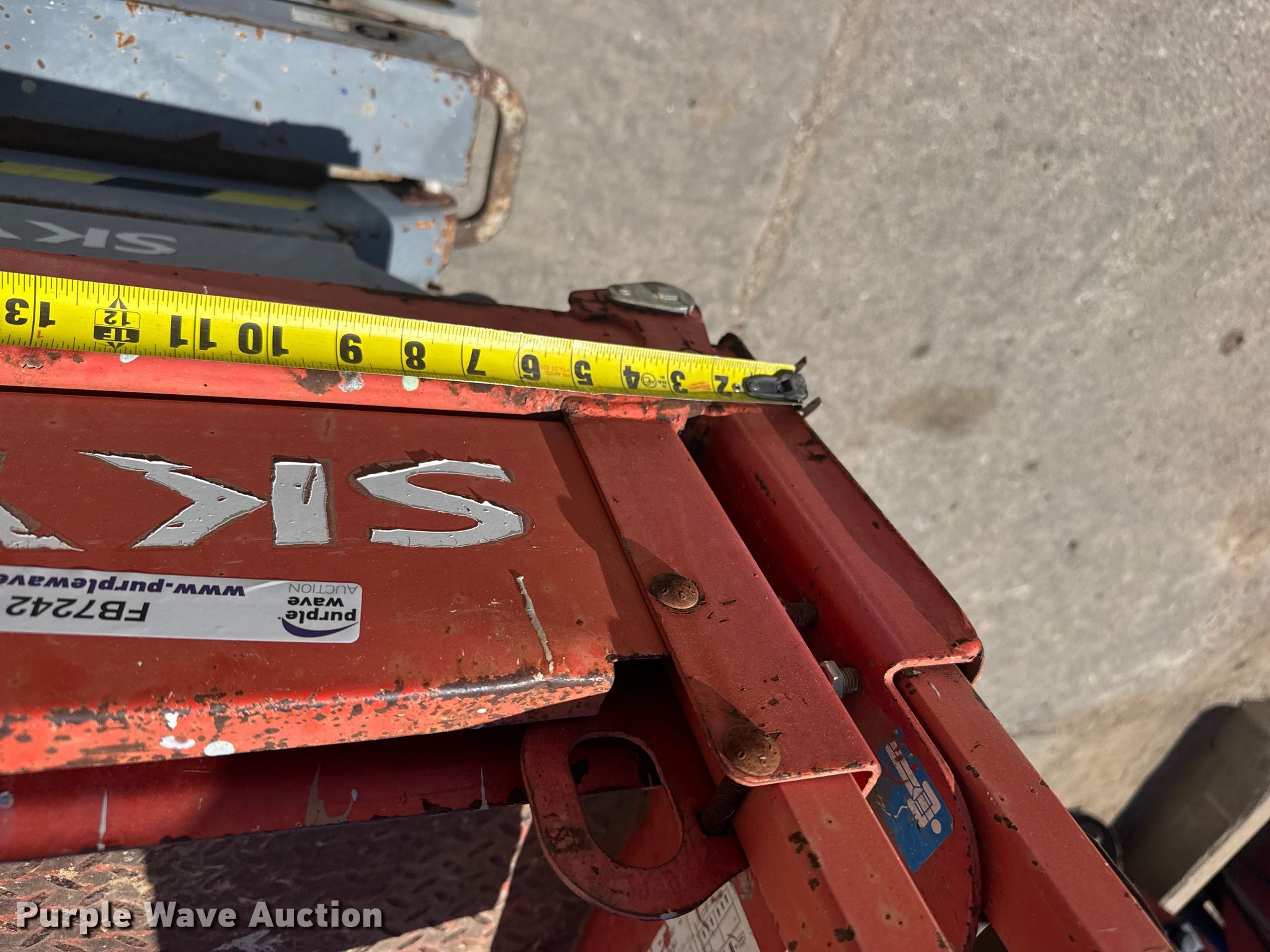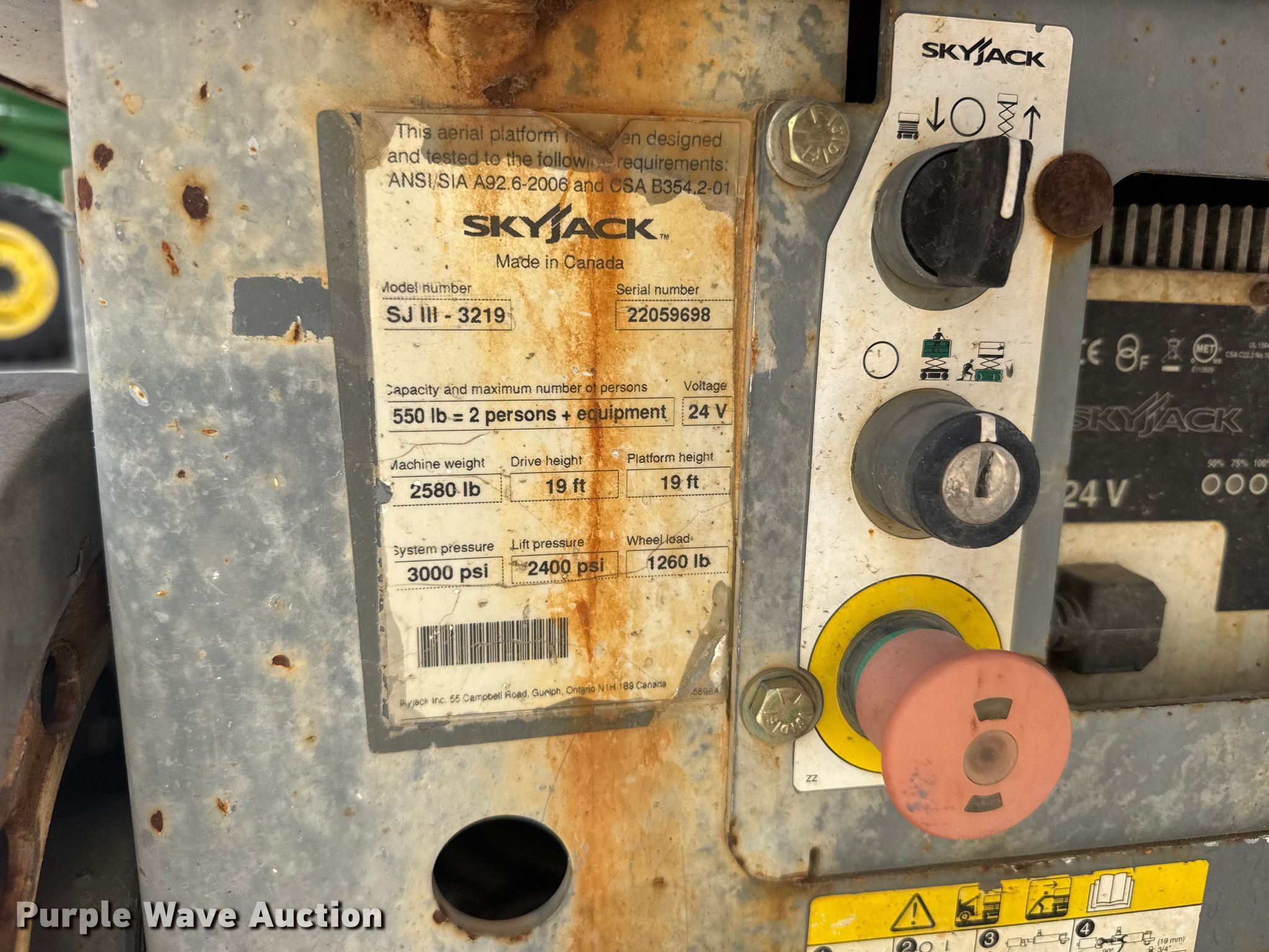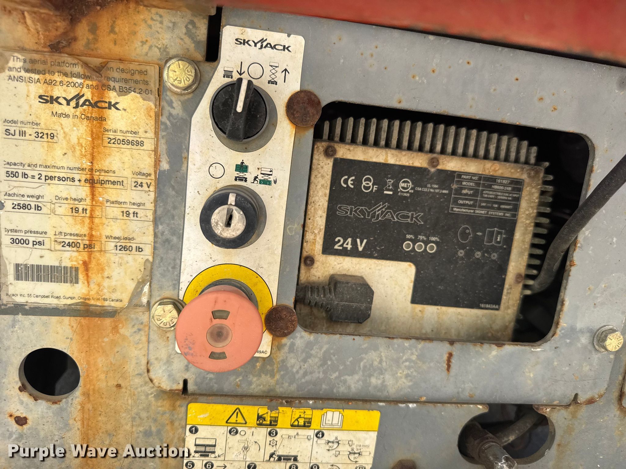 2014 Skyjack SJIII 3219 scissor lift. Serial: 22059698. Electric Motor Volts: 24. Features Maximum lift capacity: 550 lbs, Maximum lift height: 19', Platform: 32" L x 29" W, AC power outlet, Controls: Platform, Ground, Platform extensions: Manual. Tires Tire size: 4x12, Non-marking. Salina, KS 67401