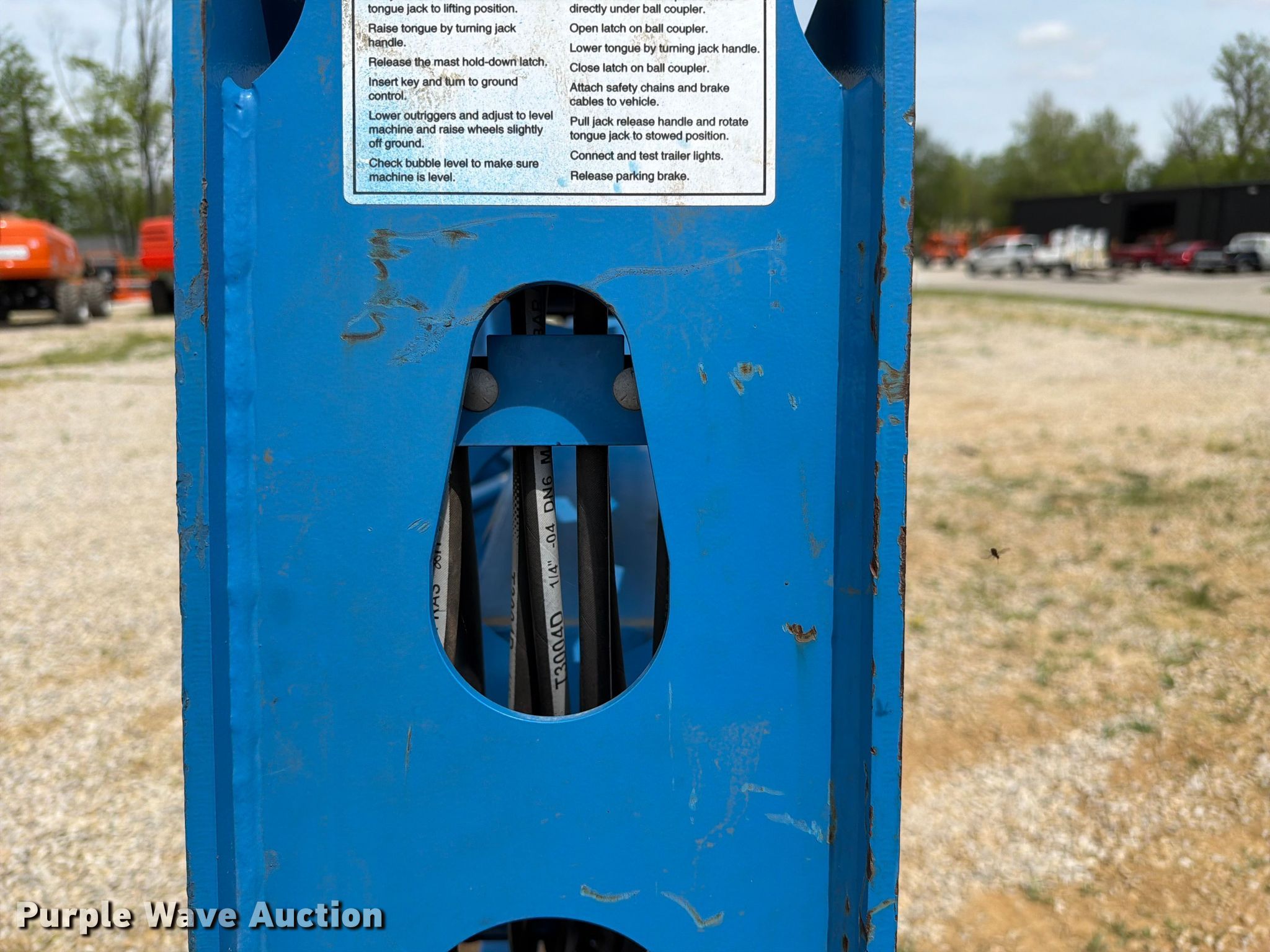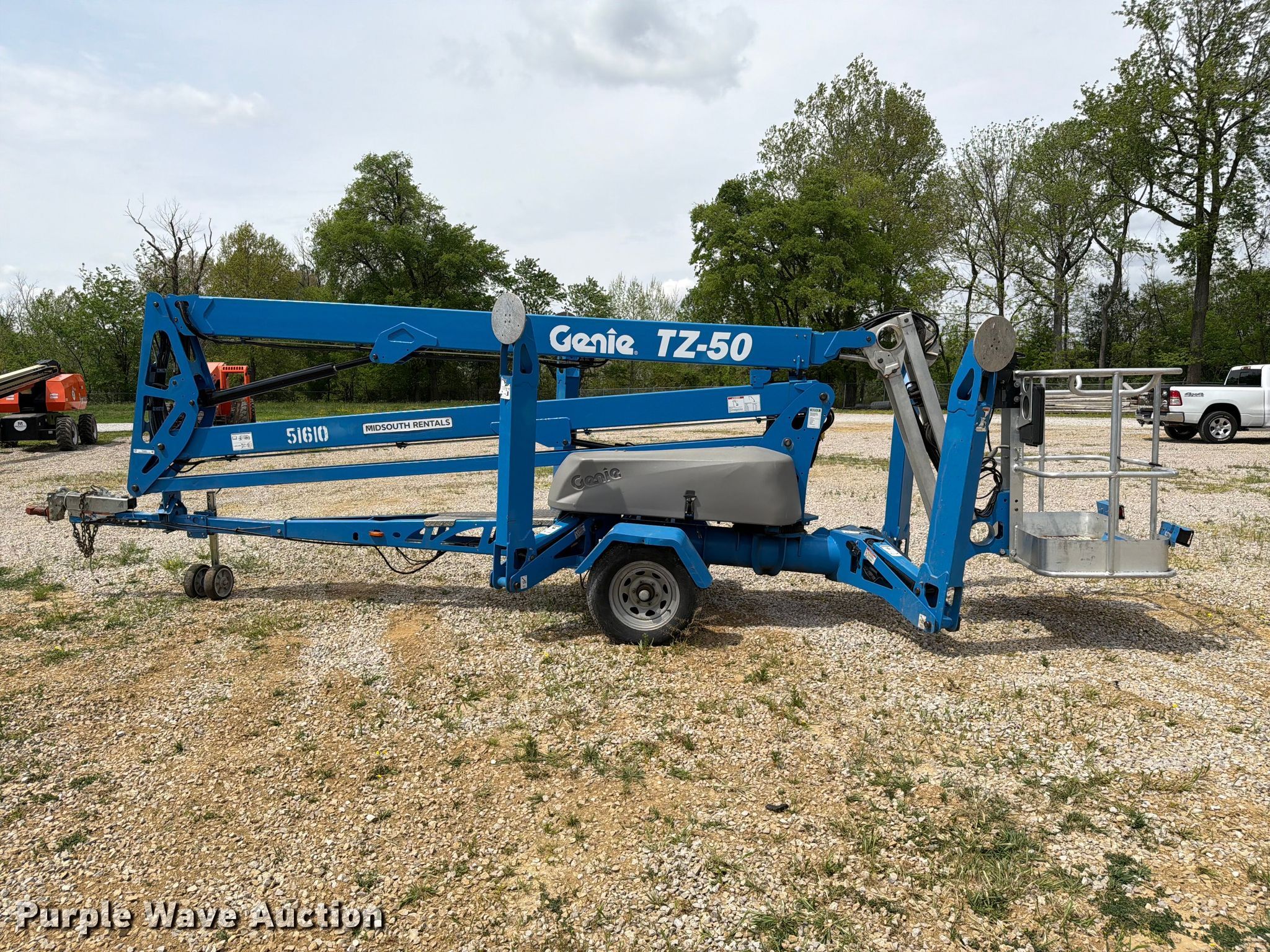 2020 Genie TZ-50 DC boom lift. Hours: 189 on meter, Serial: TZ50J-4146. Electric Motor Volts: 24 VDC. Features Tow behind, Boom type: Articulating, Telescopic, Maximum lift capacity: 500 lbs, Maximum reach length: 29', Maximum lift height: 50', Hydraulic outriggers, Hydraulic leveling, Platform: 28" L x 46" W, AC power outlet, Controls: Platform, Ground, Safety alarm, Certification valid through: 10/2025, Suspensions: Spring, Ball hitch: 2", Brakes: Hydraulic. Tires Tire size: 225/75D15. This is worksite support equipment and will not come with a title. Transfer of ownership documentation will be a bill of sale. Midsouth Rentals LLC. Owensboro, KY 42303