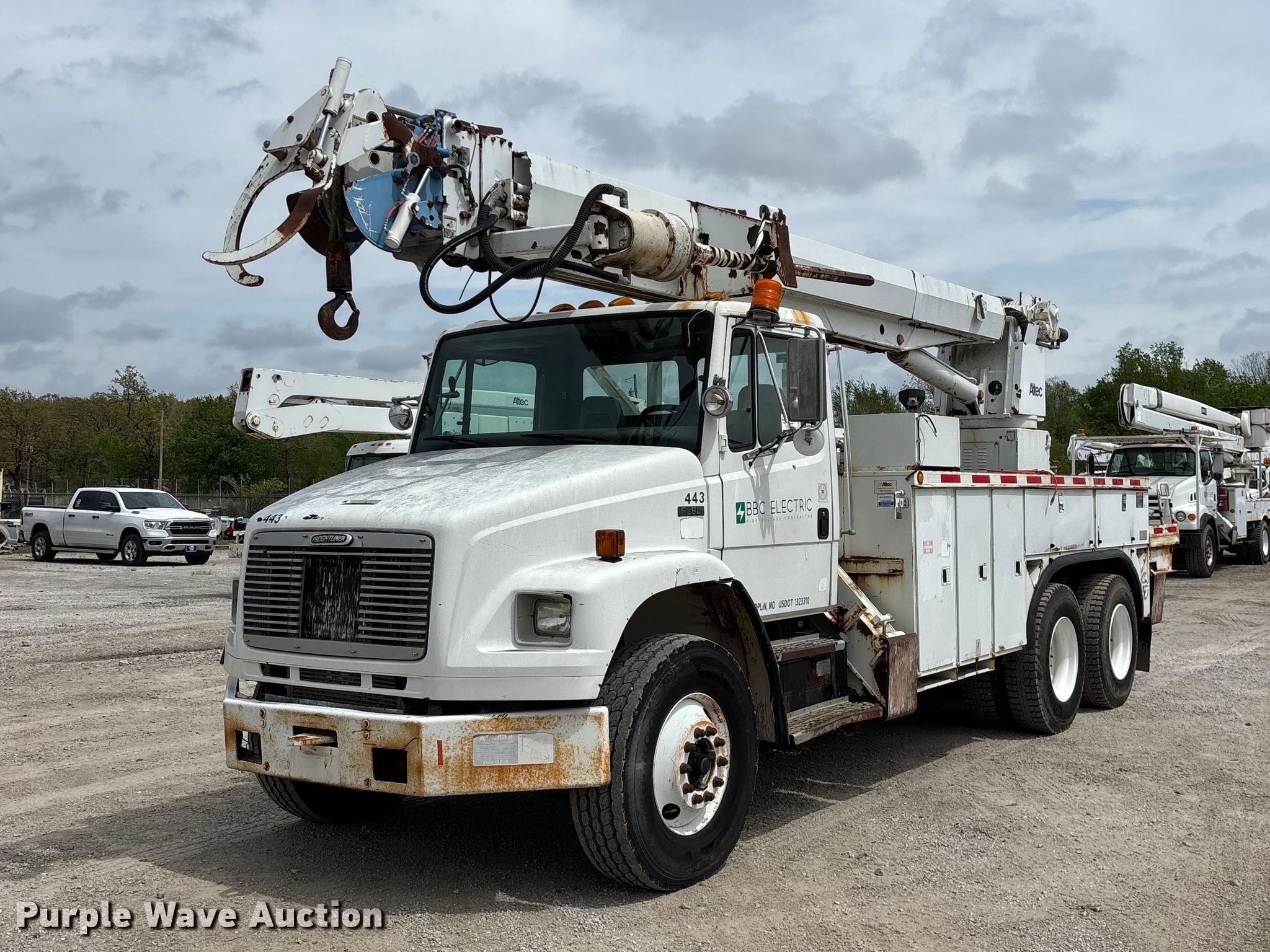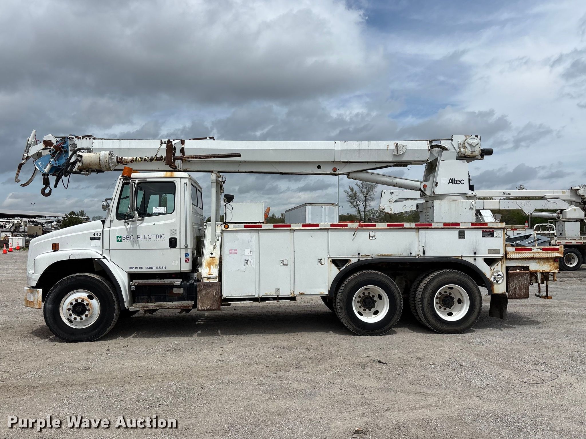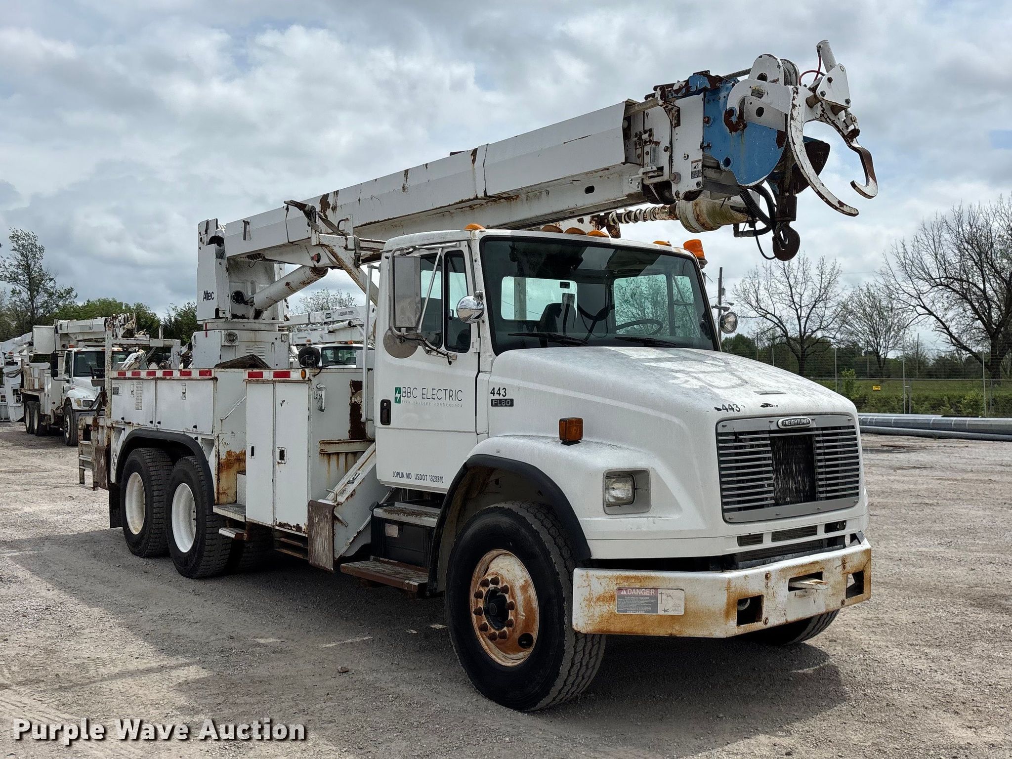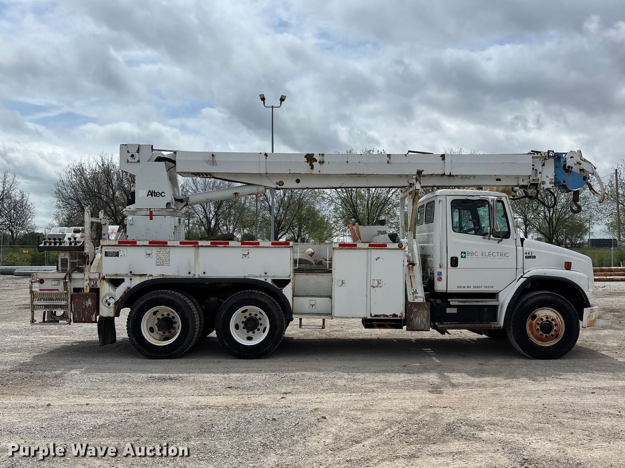 2002 Freightliner FL80 digger derrick truck. Miles: 148,371 on odometer, Hours: 2,375 on meter, VIN: 1FVHBXAK62HK95927, Unit #: 443. Engine Caterpillar 3126, Serial: CKM42554, Displacement: 7.2L, Cylinders: 6, Fuel type: Diesel, HP: 246, kW: 330. Transmission Automatic. Chassis Axles: Tandem, Differential lock: Full, Suspension: Spring, Brakes: Air, PTO, GVWR: 50,000 lbs. Interior AC, Heat, Cruise control, Brake controller. Features Bed Altec, Serial: 37-74778 10/02, Length: 15' 2", Width: 95", Height: 46", Boom Altec D3055T R, Serial: 0897CA0199, Maximum lift capacity: 26,570 lbs, Maximum lift height: 55', Boom type: Insulated, Telescopic, Boom controls Platform, Material handler, Pole guide. Tires Front: 315/80R22.5, Rear: 11R22.5. Notes Contents not included, Decals will be removed prior to auction, Auger stow seized, will not let down, Possible AC issues, may need recharged, Dash warning indicator: ABS. Missouri title. Title distribution may be delayed up to 14 days from verification of funds. BBC Electrical Services. Joplin, MO 64804