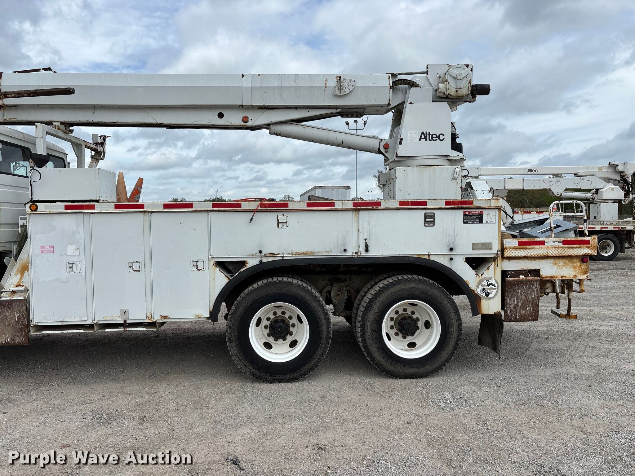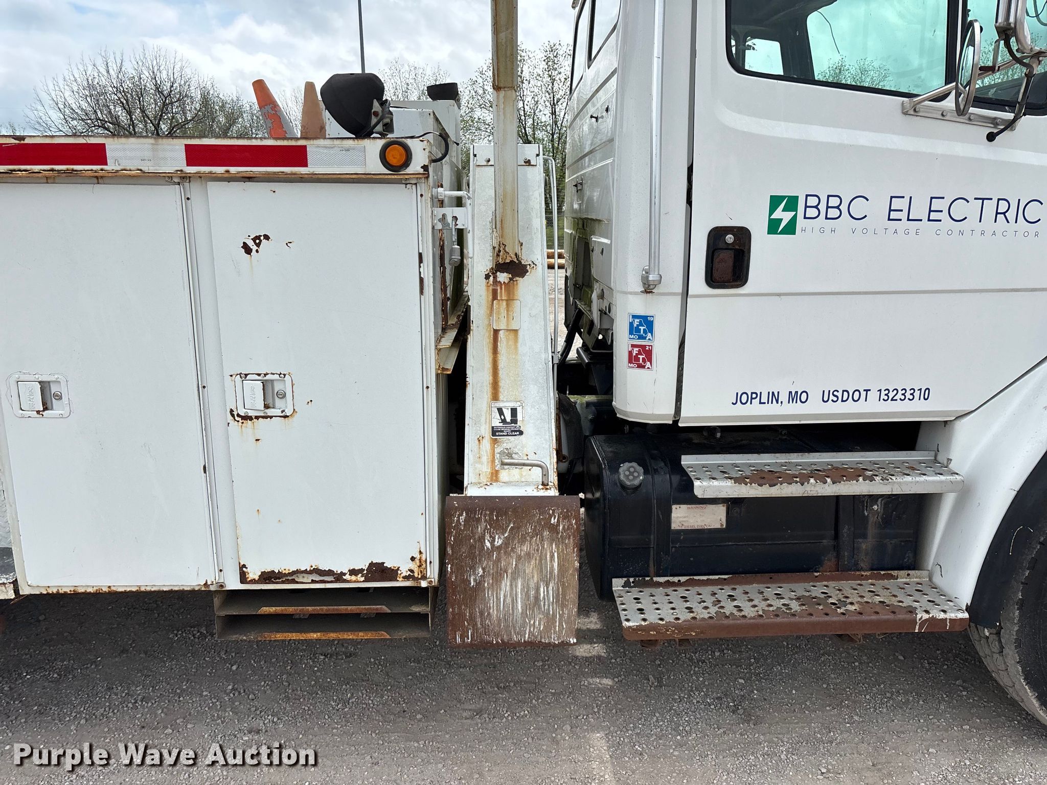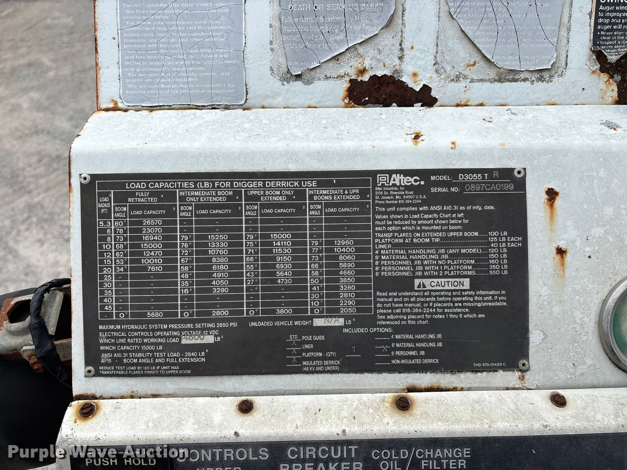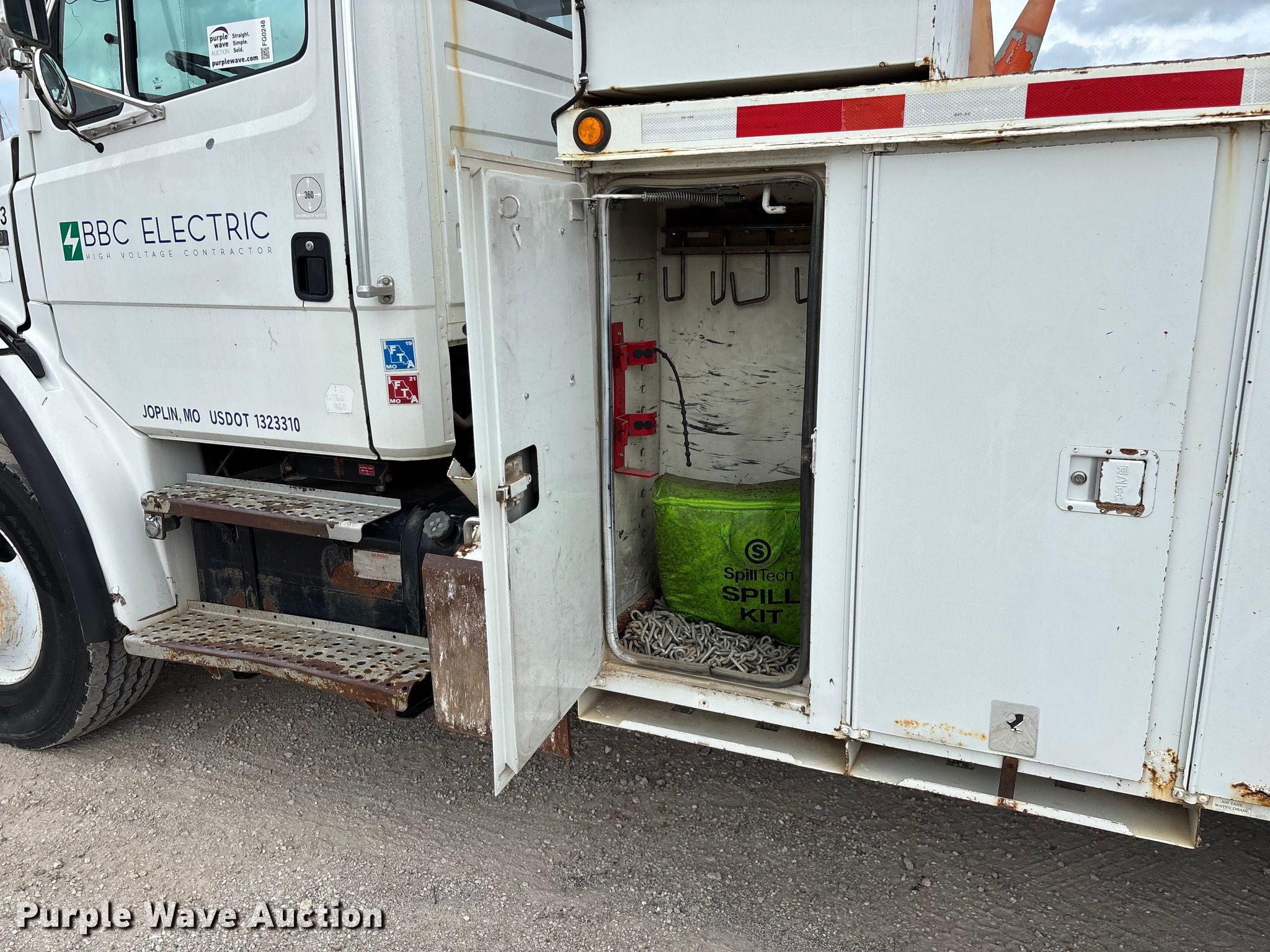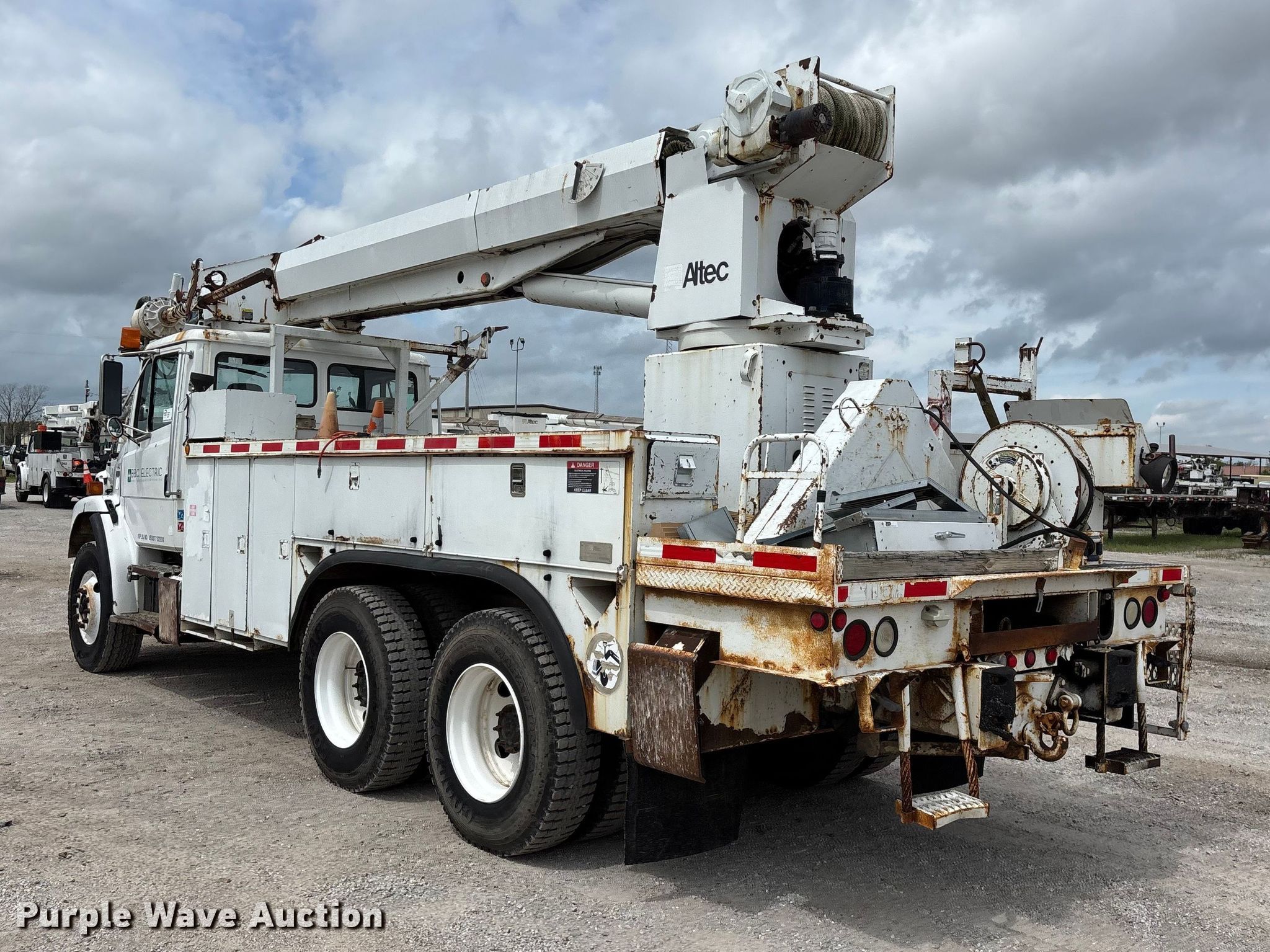 2002 Freightliner FL80 digger derrick truck. Miles: 148,371 on odometer, Hours: 2,375 on meter, VIN: 1FVHBXAK62HK95927, Unit #: 443. Engine Caterpillar 3126, Serial: CKM42554, Displacement: 7.2L, Cylinders: 6, Fuel type: Diesel, HP: 246, kW: 330. Transmission Automatic. Chassis Axles: Tandem, Differential lock: Full, Suspension: Spring, Brakes: Air, PTO, GVWR: 50,000 lbs. Interior AC, Heat, Cruise control, Brake controller. Features Bed Altec, Serial: 37-74778 10/02, Length: 15' 2", Width: 95", Height: 46", Boom Altec D3055T R, Serial: 0897CA0199, Maximum lift capacity: 26,570 lbs, Maximum lift height: 55', Boom type: Insulated, Telescopic, Boom controls Platform, Material handler, Pole guide. Tires Front: 315/80R22.5, Rear: 11R22.5. Notes Contents not included, Decals will be removed prior to auction, Auger stow seized, will not let down, Possible AC issues, may need recharged, Dash warning indicator: ABS. Missouri title. Title distribution may be delayed up to 14 days from verification of funds. BBC Electrical Services. Joplin, MO 64804