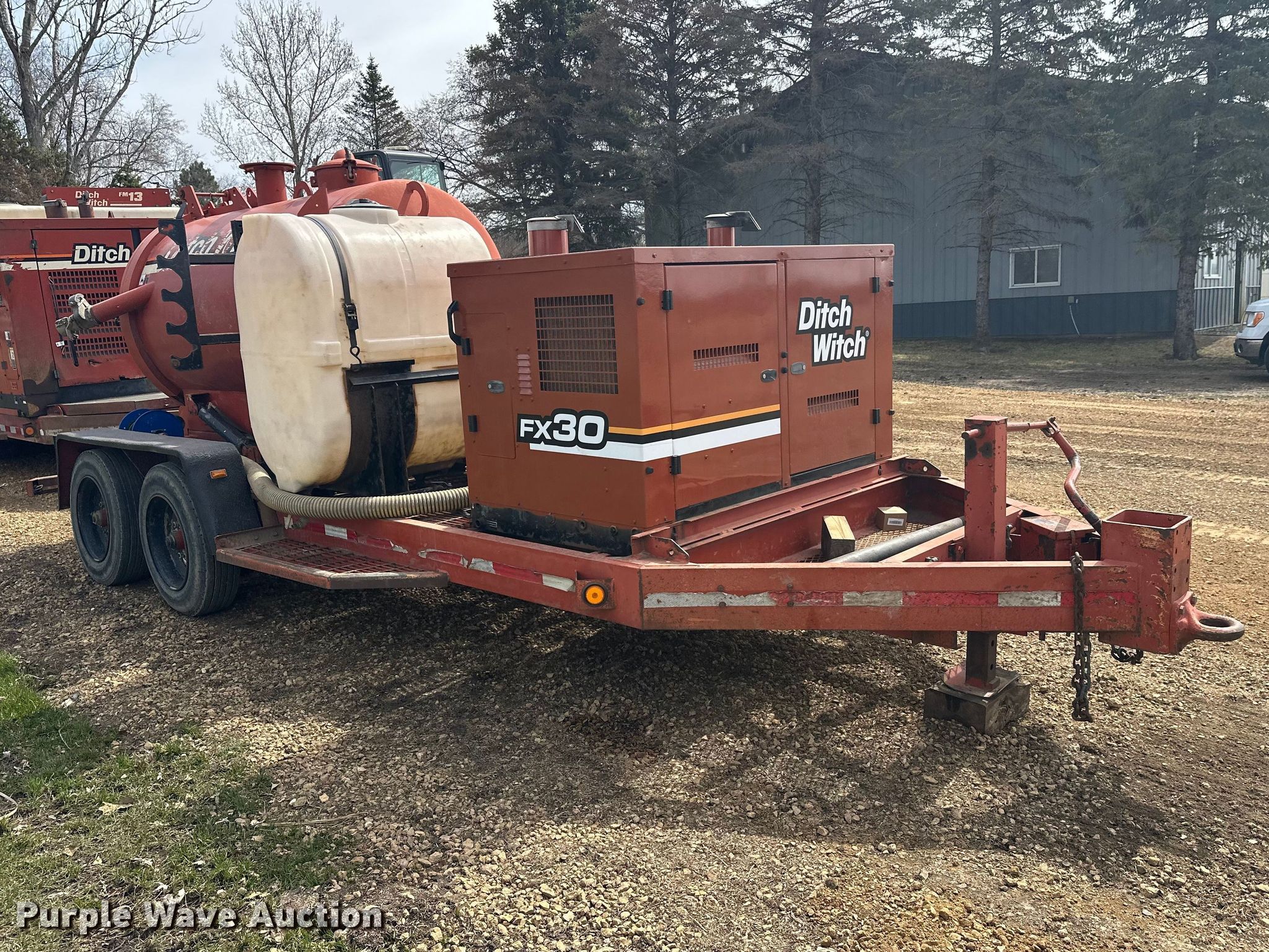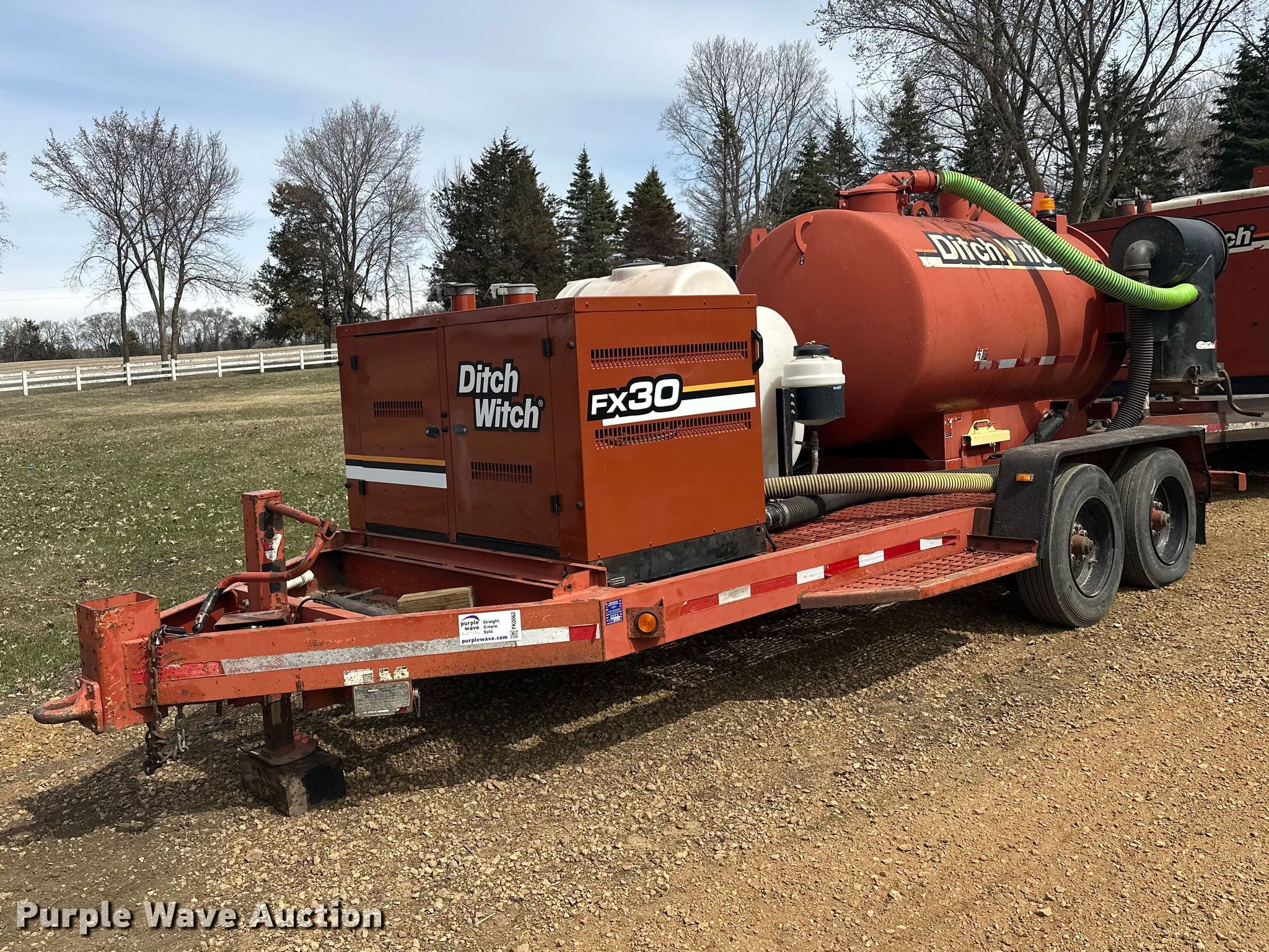2010 Ditch Witch FX30 vacuum excavator. Hours: 3,850 on meter, VIN: 1DSB202S6A1702123. Engine Kubota, Cylinders: 3, Fuel type: Diesel. Features Spoils tank Capacity: 800 gallons, Water tank Capacity: 200 gallons, Water pump Model: EZ3042, Vacuum pump Tuthill 4007-A6L2C-5823, Inlet valve size: 3", Outlet valve size: 6", Suction hose Diameter: 3".. Trailer 21' L x 102" W, Hitch: Pintle, Suspension: Spring, Brakes: Electric, Axles: Tandem, Tire size: 215/75R17. Minnesota title. Title distribution may be delayed up to 30 days from verification of funds. Delano, MN 55328