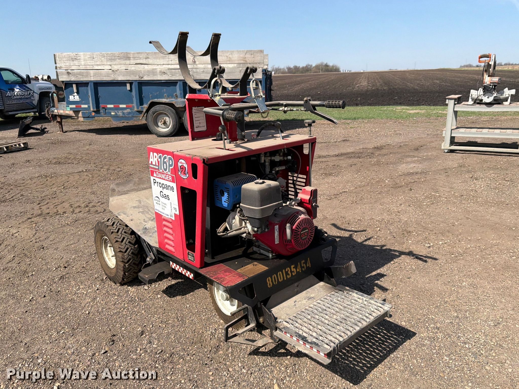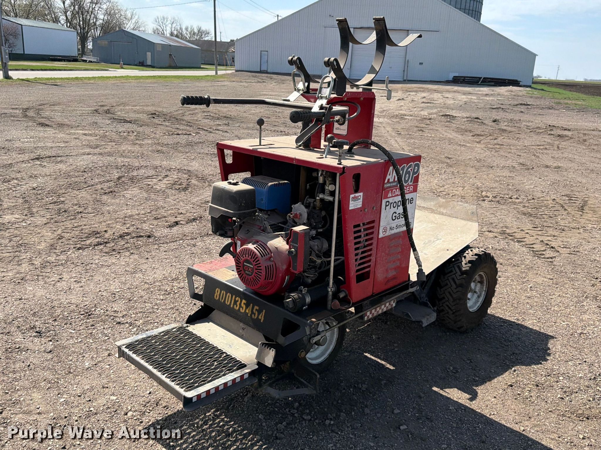 Allen AR16P power buggy. Serial: AP16P101602. Engine Honda GX3901, Fuel type: LPG. Transmission Hydrostatic. Tires Front: 5.7-8, Rear: 4.80x4.00-8. Notes Propane tant not included, Dead battery, Jump start required during on-site data collection. Altenburg Construction Inc. Lewisville, MN 56060