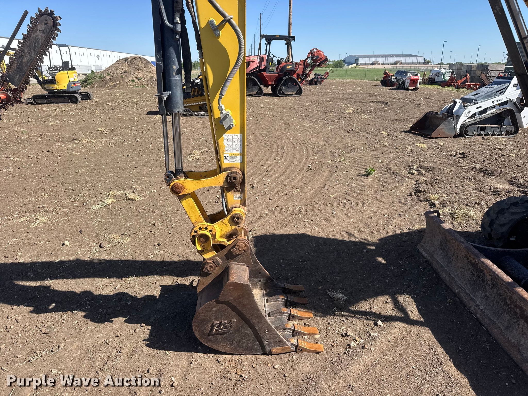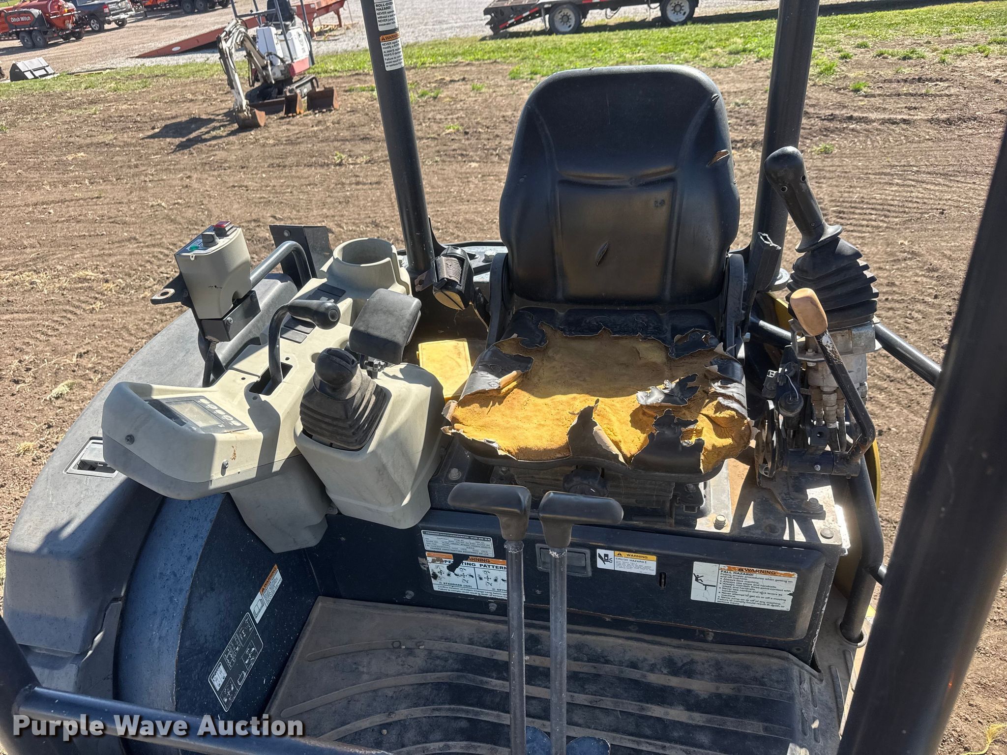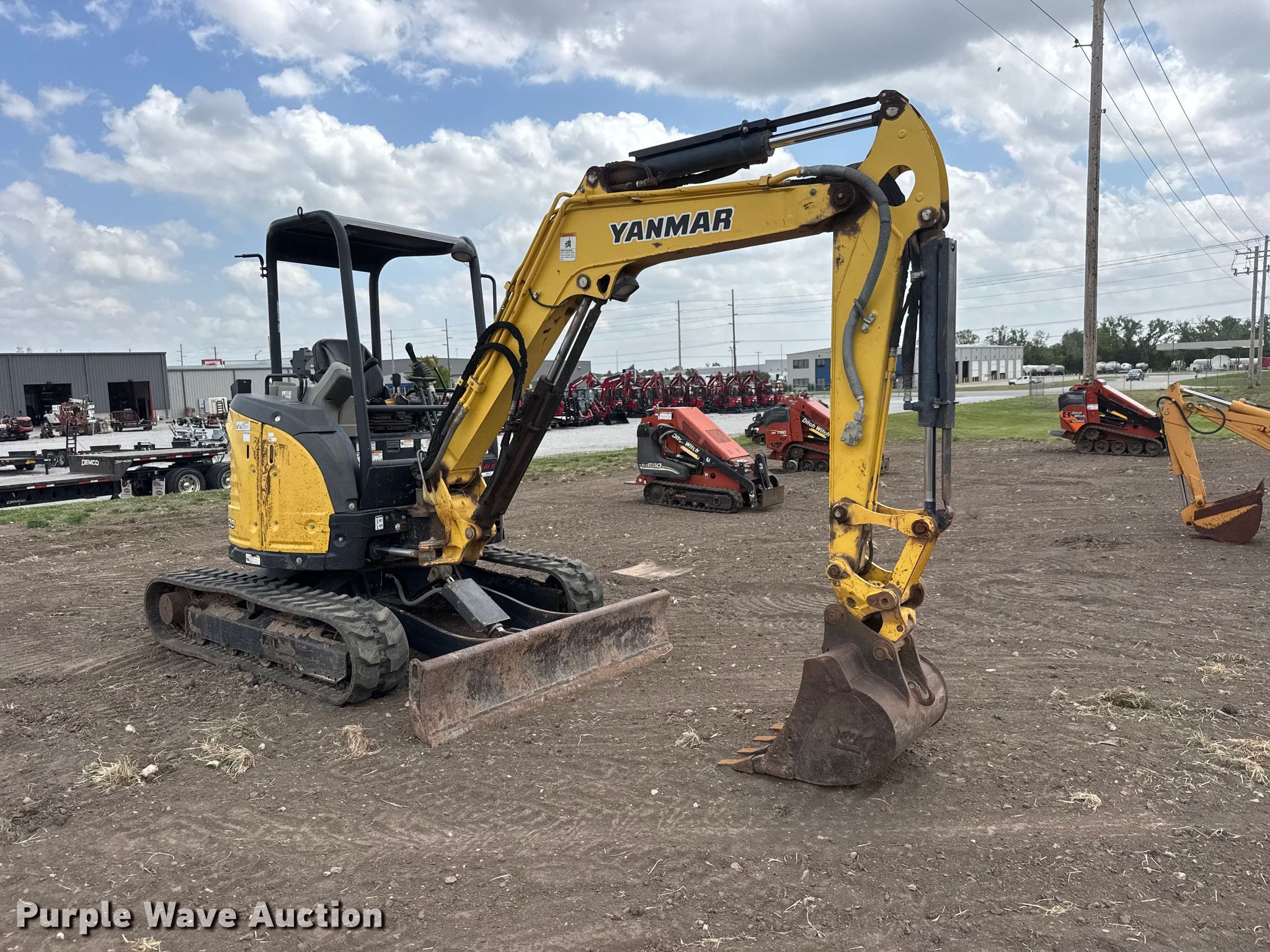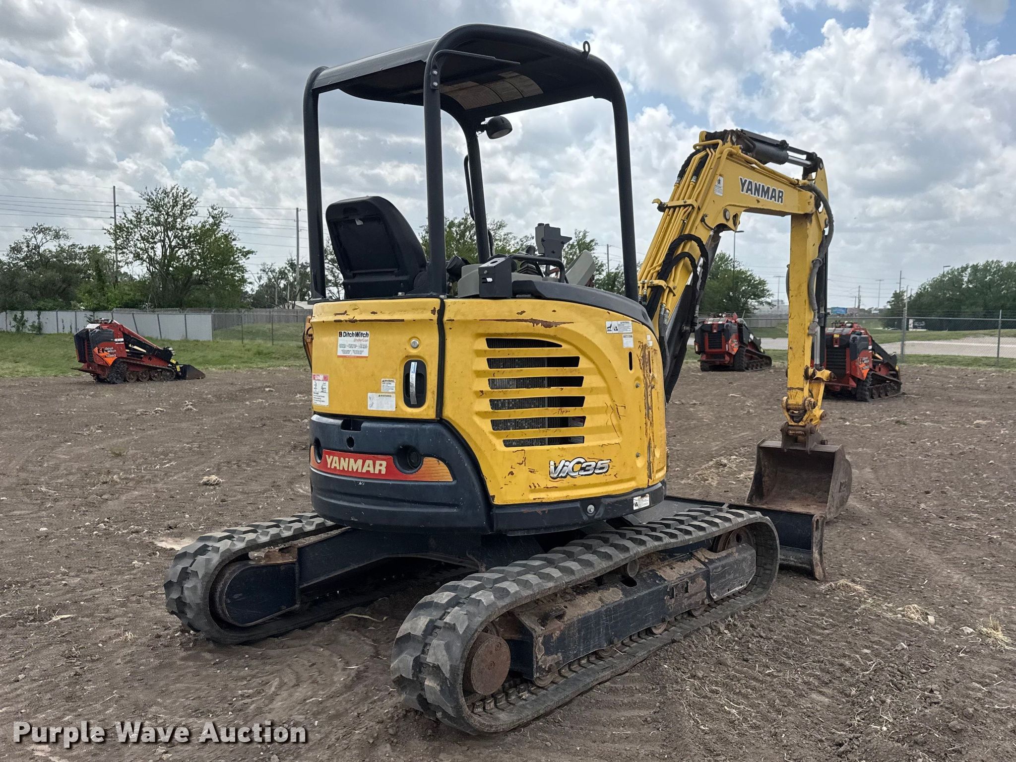 Yanmar VIO35-6A mini excavator. Hours: 5,734 on meter, Serial: YMRVIO35JGAJ63056. Engine Yanmar 4HNSAE, Serial: 15413, Displacement: 1.642L, Cylinders: 3, Fuel type: Diesel. Transmission Hydrostatic. Operators station OROPS, Pattern changer. Features Backfill blade Width: 68", Boom Swing, Stick Stick length: 4' 6", Quick coupler: Hydraulic, Bucket Width: 24", Teeth: 5. Tracks Width: 12", Rubber. Ditch Witch UnderCon. Park City, KS 67147
