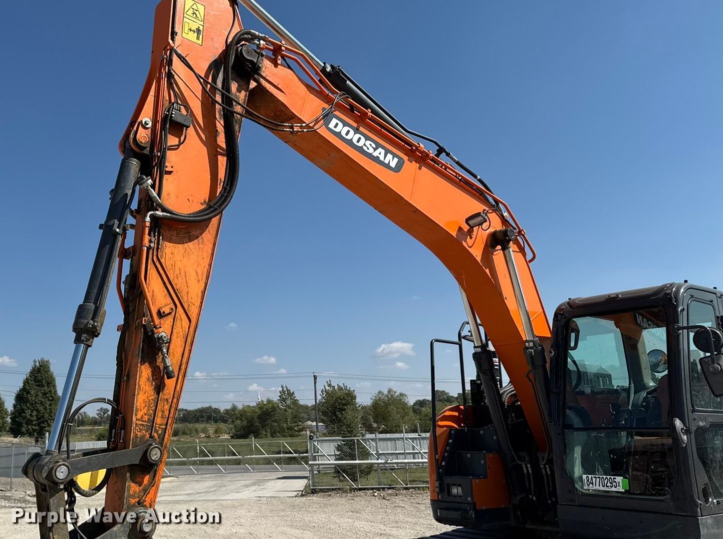 2021 Doosan DX140LCR-5 excavator. Hours: 2,620 on meter, Serial: DHKCEBBSTM0002846, Unit #: 84770295. Engine Perkins, Displacement: 4.4L, Cylinders: 4, Fuel type: Diesel. Transmission Hydrostatic, Two speed travel. Operators station Enclosed cab, AC, Heat, Backup camera, Pattern changer. Features Auxiliary hydraulics Standard, Auto lube, Backfill blade Width: 102", Boom Standard, Stick Stick length: 115", Quick coupler: Hydraulic Doosan, Bucket Geith, Width: 24", Teeth: 4. Tracks Width: 24", Steel, Track pads: Rubber. Repossessed item, stored at a secured facility. Please review REQUIRED REMOVAL INSTRUCTIONS. Lender Owned. Des Moines, IA 50313