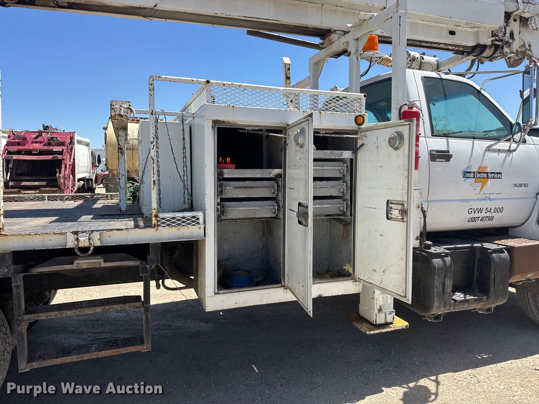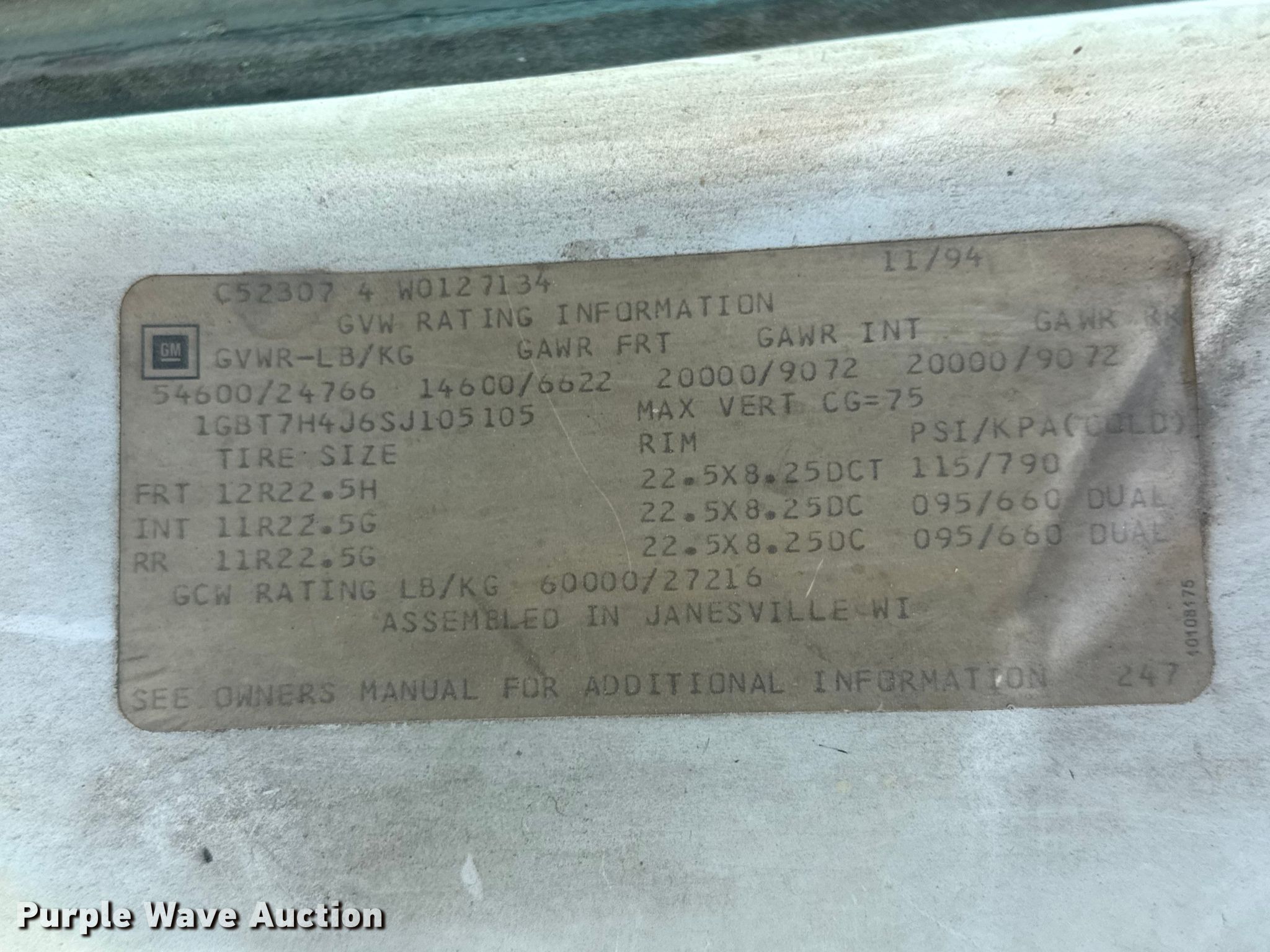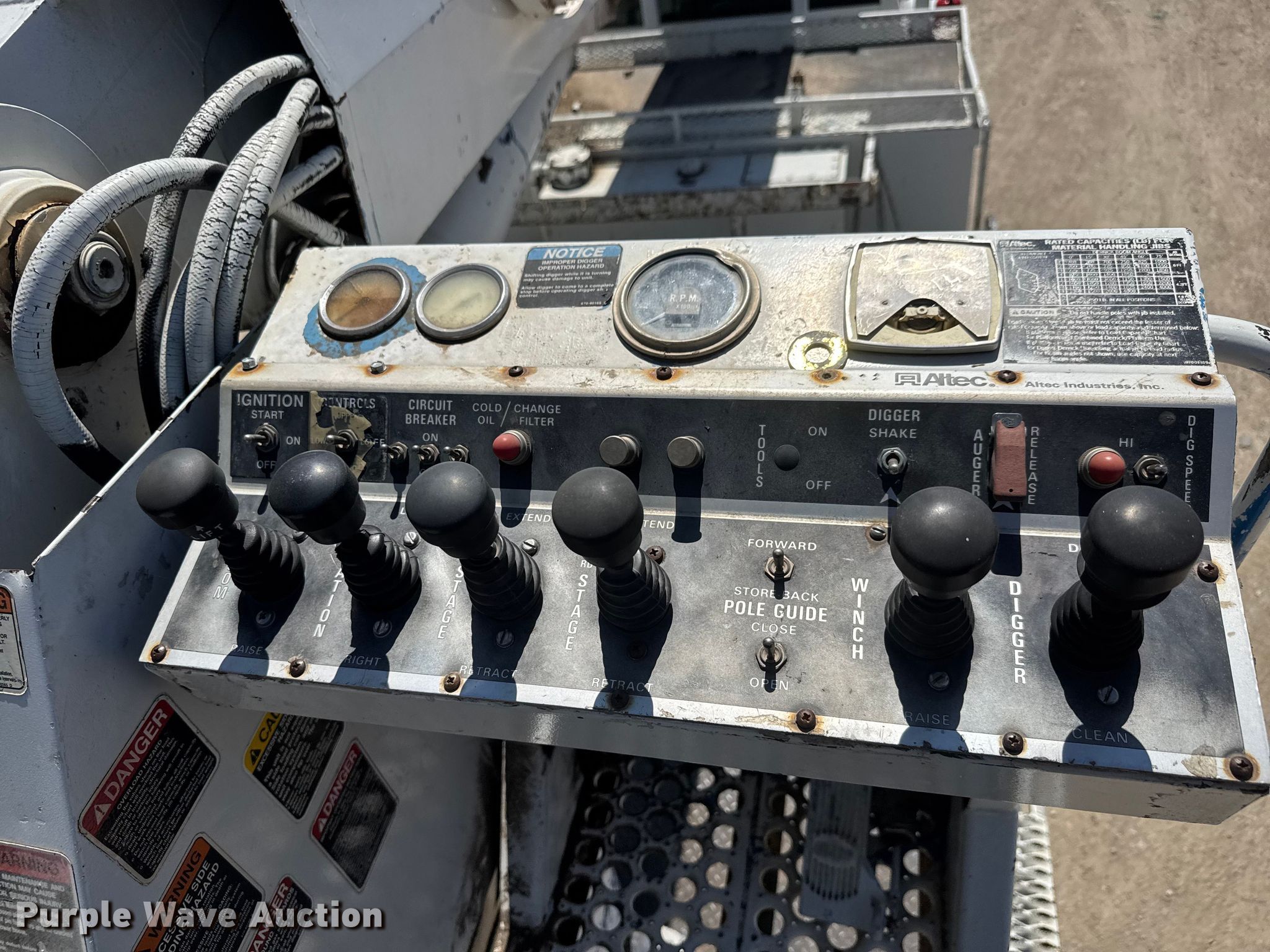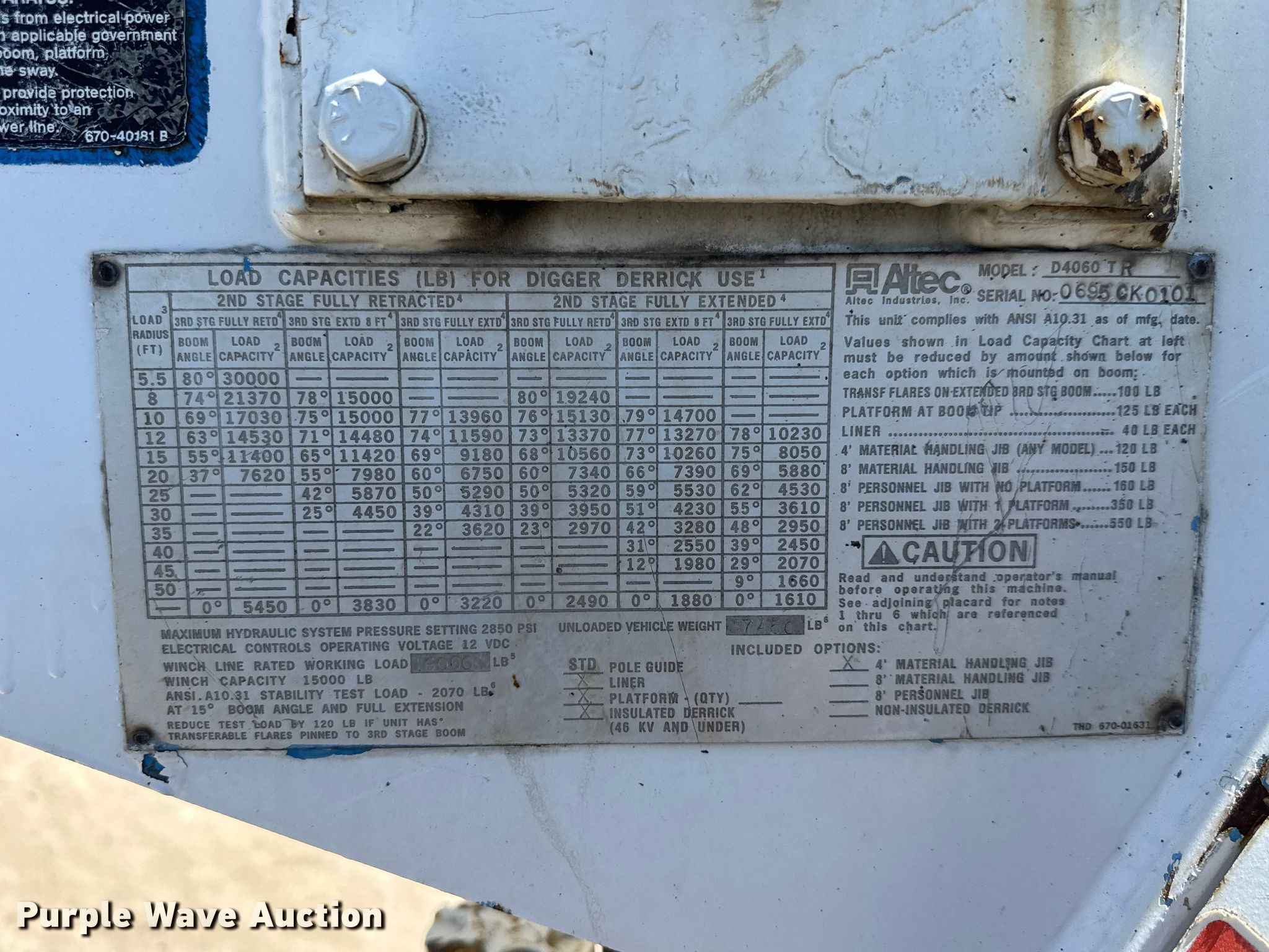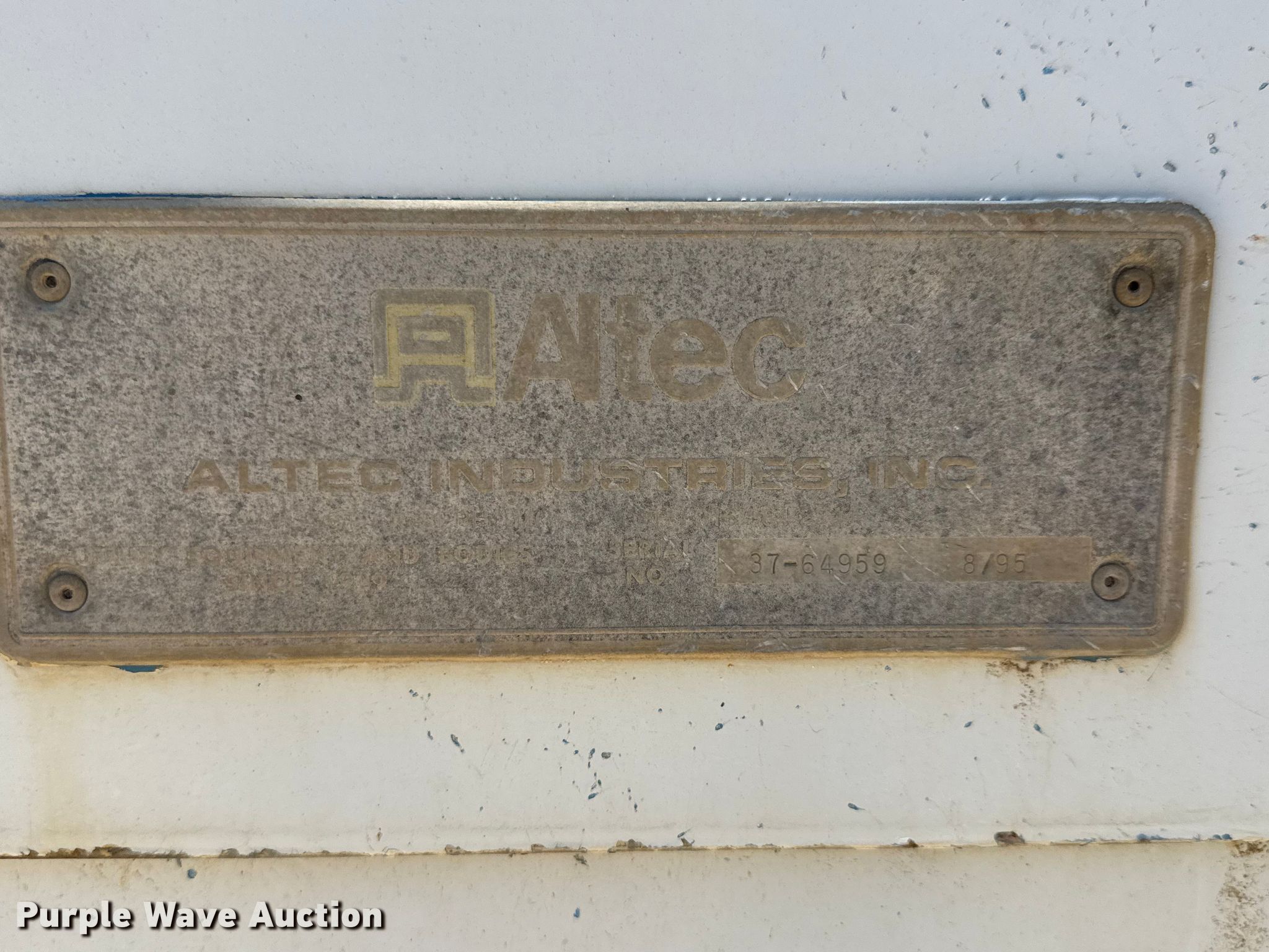 1995 Chevrolet Kodiak digger derrick truck. Miles: 76,338 on odometer, VIN: 1GBT7H4J6SJ105105, Lot #: 48483376. Engine Caterpillar 3116, Displacement: 6.6L, Cylinders: 6, Fuel type: Diesel. Transmission Allison, Automatic. Chassis Axles: Tandem, Differential lock: Inter-axle, Suspension: Spring over walking beam, Brakes: Air, PTO, GVWR: 54,600 lbs. Interior AC, Heat. Features Bed Flatbed, Altec, Serial: 37–64959 8/95, Length: 20' 2", Width: 94", Boom Altec D4060 TR, Serial: 0695 CK0101, Mast height: 60', Maximum lift capacity: 30,000 lbs, Boom type: Insulated, Telescopic, Boom controls Platform, Material handler, Pole guide, Auger. Tires Size: 11R22.5. Notes Dash warning indicator: Low coolant, Jump start required during on-site data collection, Driveshaft disconnected for transport and temporarily reattached for video Drivetrain should be inspected prior to service. Repossessed item, stored at a secured facility. Please review REQUIRED REMOVAL INSTRUCTIONS. Lender owned. Item condition and history are unknown. No additional information is available. Titles will be distributed after confirmation of payment and removal. Kansas title. Title distribution may be delayed up to 30 days from verification of funds. Lender Owned. Witchita, KS 67216