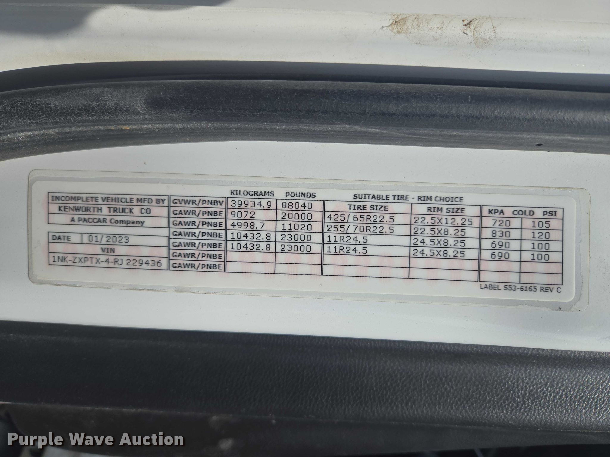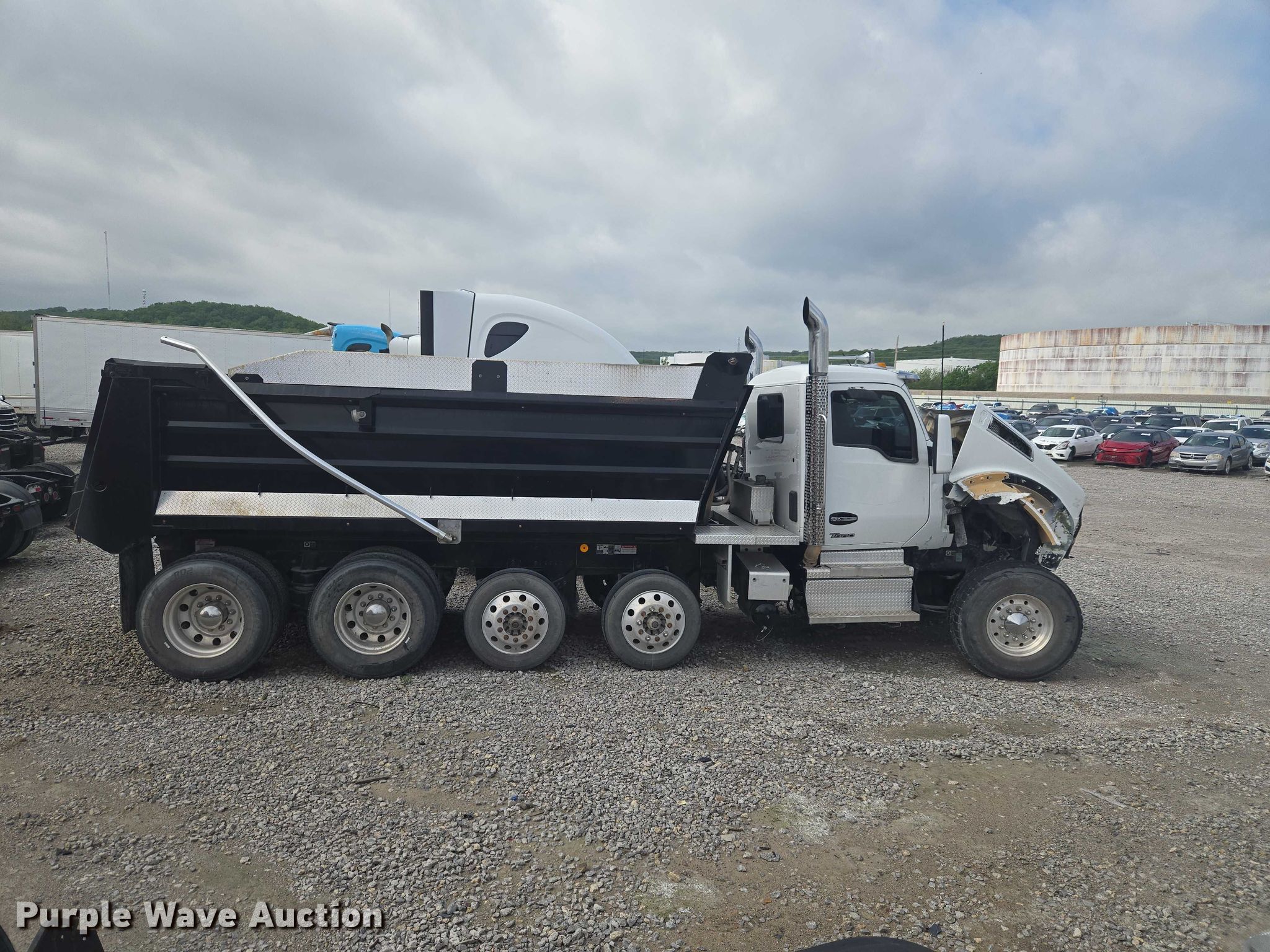 2024 Kenworth T880 dump truck. Miles: 136,490 on odometer, Miles: Actual unknown, VIN: 1NKZXPTX4RJ229436, Unit #: 66295555. Engine Paccar MX-13, Displacement: 12.9L, Cylinders: 6, Fuel type: Diesel, Engine brake. Transmission Automatic. Chassis Axles: 4, Pusher axle Steerable, Differential lock: Full, Suspension: Spring over walking beam, Brakes: Air, PTO, GVWR: 88,040 lbs FAWR: 20,000 lbs, IAWR: 23,000 lbs, RAWR: 23,000 lbs, Lift axle GAWR: 11,000 lbs. Interior AC, Heat, Heated mirrors, Power windows, Cruise control. Features Bed Dump bed, Godwin SCS170481122, Serial: 0053725, Length: 19' 4", Width: 8' 1", Side height: 48", Side board height: 12", Bed type: Steel, Roll tarp, Ram: Single, End gate: Air operated. Tires Front: 425/65R22.5, Rear: 11R24.5, Lift axle: 255/70R22.5. Notes Dash warning indicator: Stop engine, ABS, Dead battery, Collision damage, Driveshaft removed, but included, Unknown operating condition Unit must be towed or hauled. Buyer responsible for all aspects of loadout and removal. Insurance salvage, stored at a secured facility. Please review REQUIRED REMOVAL INSTRUCTIONS. Titles will be distributed after confirmation of payment and removal. Oklahoma salvage title. Title distribution may be delayed up to 30 days from verification of funds. Insurance Salvage. 2408 West 21st Street South. Tulsa, OK 74107