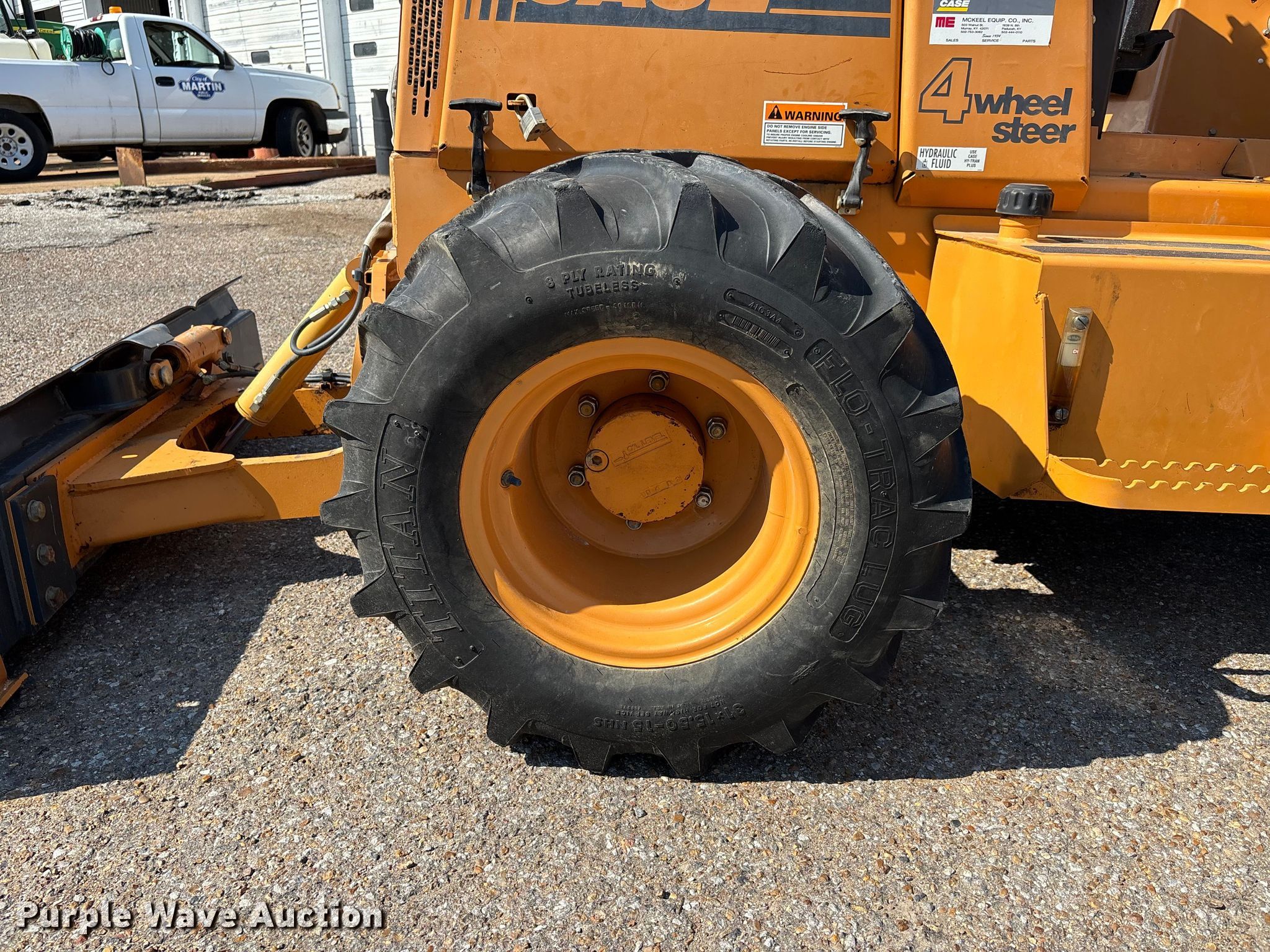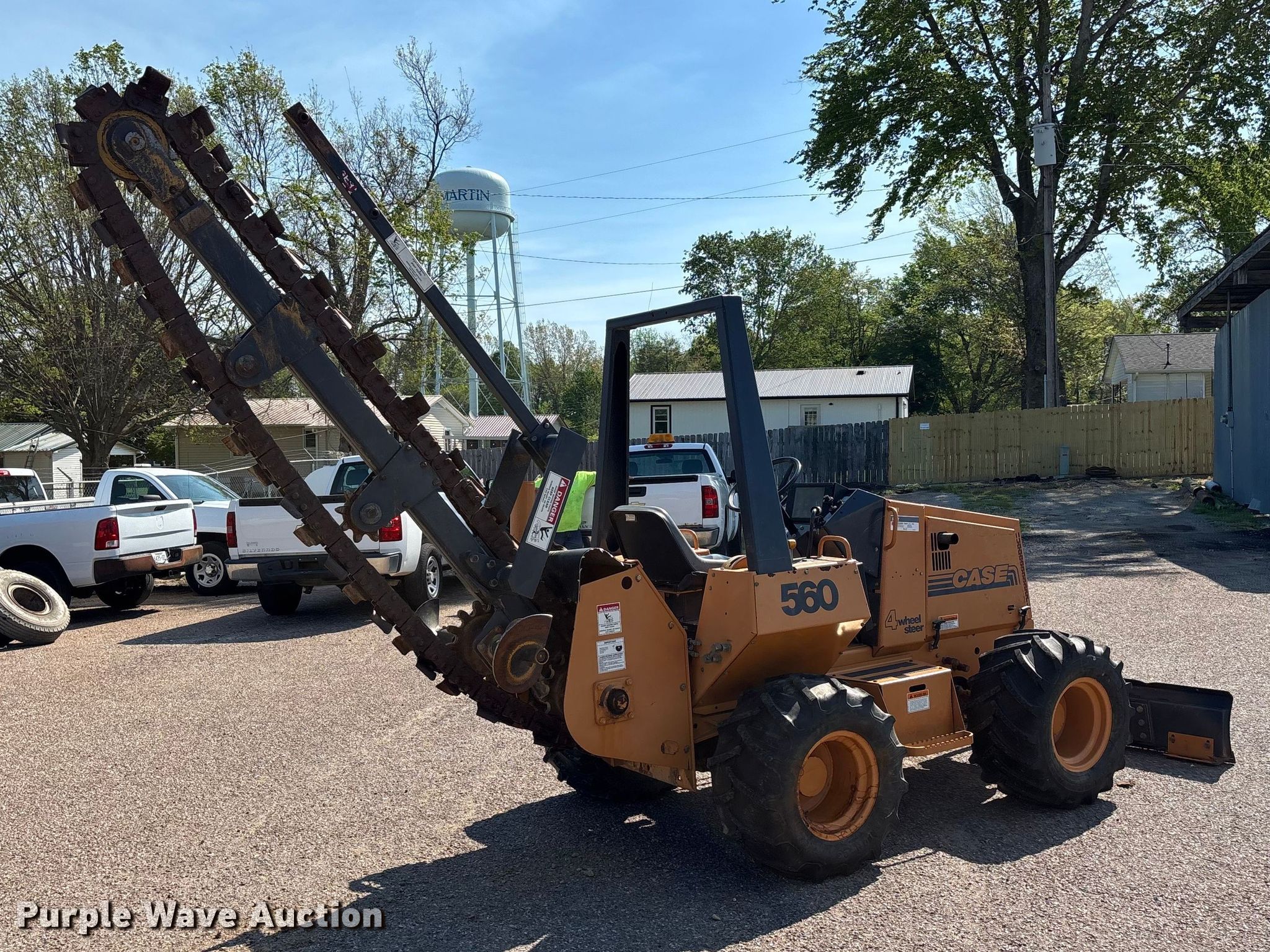 2000 Case 560 trencher. Hours: 242 on meter, Serial: JAF0295820, Unit #: 11. Engine Kubota, Cylinders: 4, Fuel type: Diesel. Transmission Hydrostatic, Two speed travel. Chassis Four wheel drive, Four wheel steer. Operators station OROPS. Features Trencher Model: H939307, Serial: JAD0307270, Estimated dig depth: 84", Cutting width: 5", Teeth: Dirt, Width: 72". Tires Size: 31x15.50-15. City of Martin. Martin, TN 38237