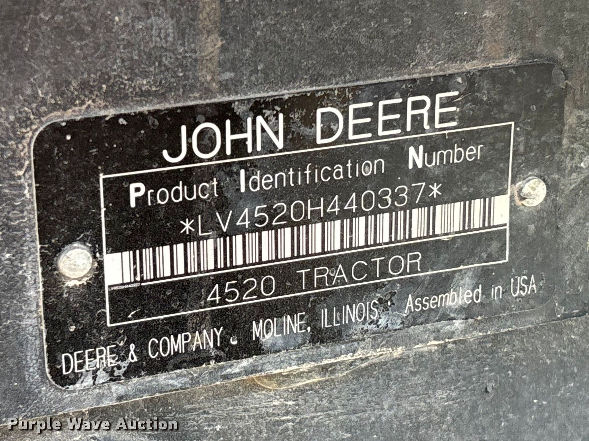 Purple Wave is selling a used Tractor in Kansas. This item is a 2007 John Deere 4520 MFWD tractor with the following: Hours: 1,650 on meter, Serial: LV4520H440337