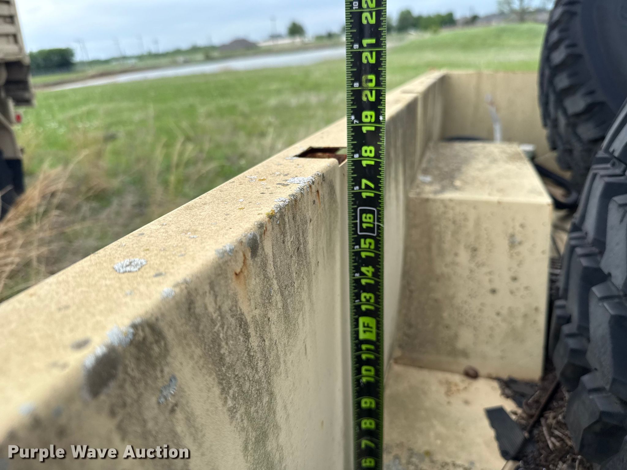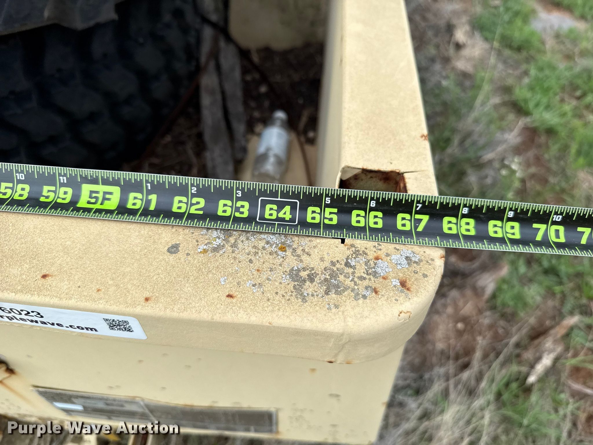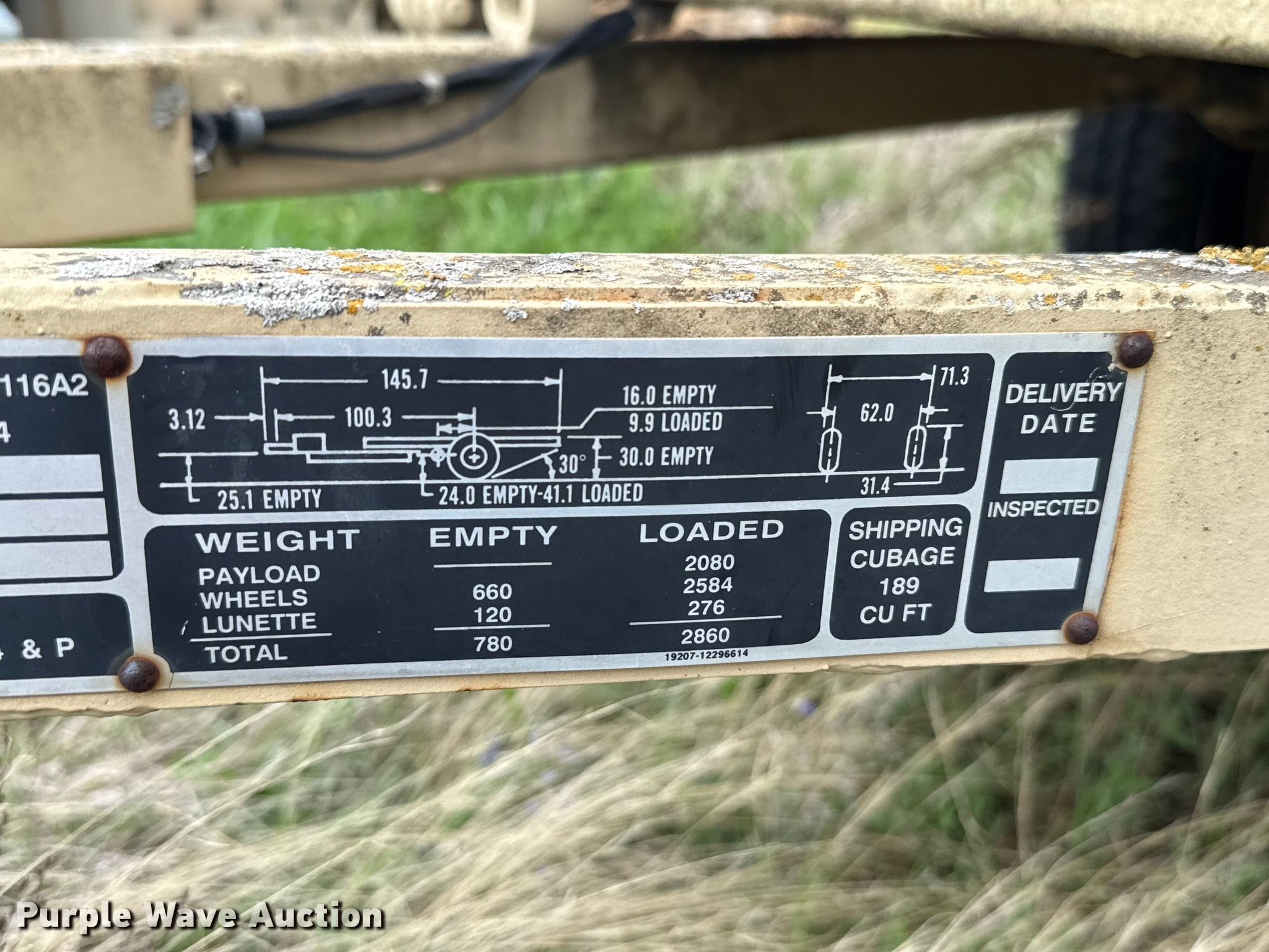 1968 M116A2 utility trailer. VIN: 7032, Unit #: 4234. Dimensions Overall Length: 12', Width: 70", Deck Length: 8', Width: 65", Side height: 18". Features Deck type: Steel. Chassis Hitch: Pintle, Landing gear: Single, Suspension: Spring. Tires Steel wheels Size: LT235/85R16. Notes Additional tires and wheels included Size: 395/85R20. Transfer of ownership documentation will be a bill of sale. Seller is a government entity who will be assigning and distributing the title. Please contact the seller for distribution questions. Shawnee Police Department. Shawnee, OK 74804