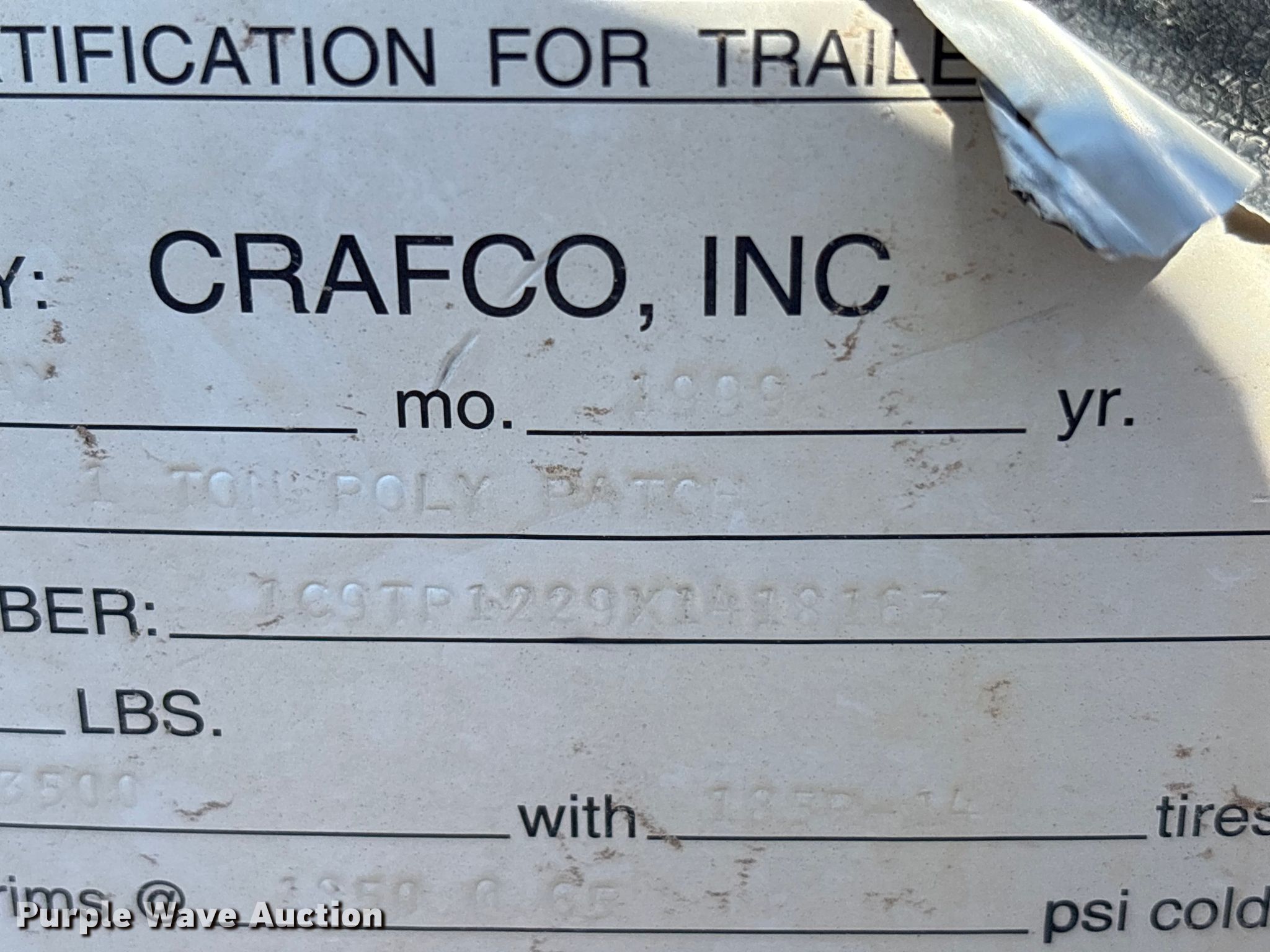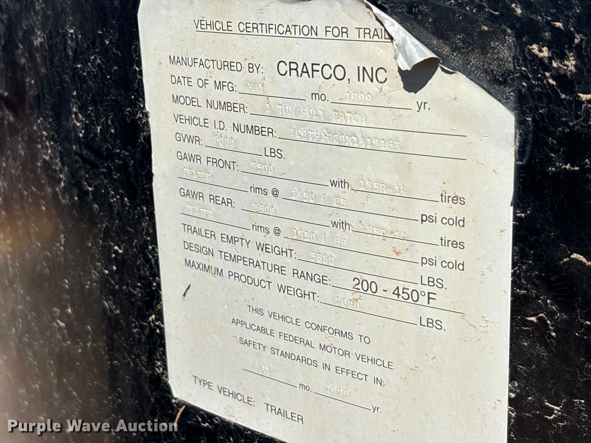 Purple Wave is selling a used Pot Hole Patcher in Texas. This item is a 1999 Crafco melter applicator with the following: Hours: Unknown, VIN: 1C9TP1229X1418163, Unit #: 1250