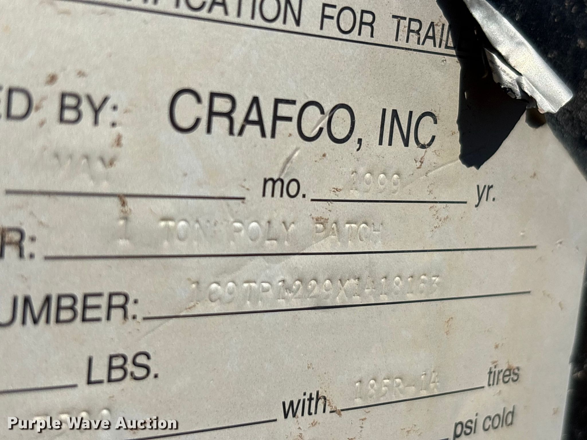 1999 Crafco melter applicator. Hours: Unknown, VIN: 1C9TP1229X1418163, Unit #: 1250. Dimensions Overall Length: 183", Width: 6', Height: 6'. Engine Kohler Ch11S, Serial: 2901110341, Displacement: 398cc, Cylinders: 1, Fuel type: LPG. Tires Front: 205/75R14, Brand: Matertrack. Notes Dead battery, Unknown operating condition. Texas title. Seller is a government entity who will be assigning and distributing the title. Please contact the seller for distribution questions. Moore County, TX. Dumas, TX 79029